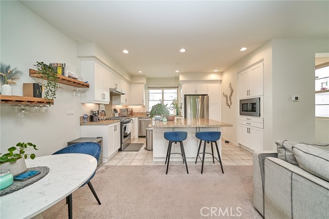 The kitchen is a culinary haven, showcasing modern stainless steel appliances, elegant quartz countertops, a chic glass tile backsplash, and rich wood cabinetry.