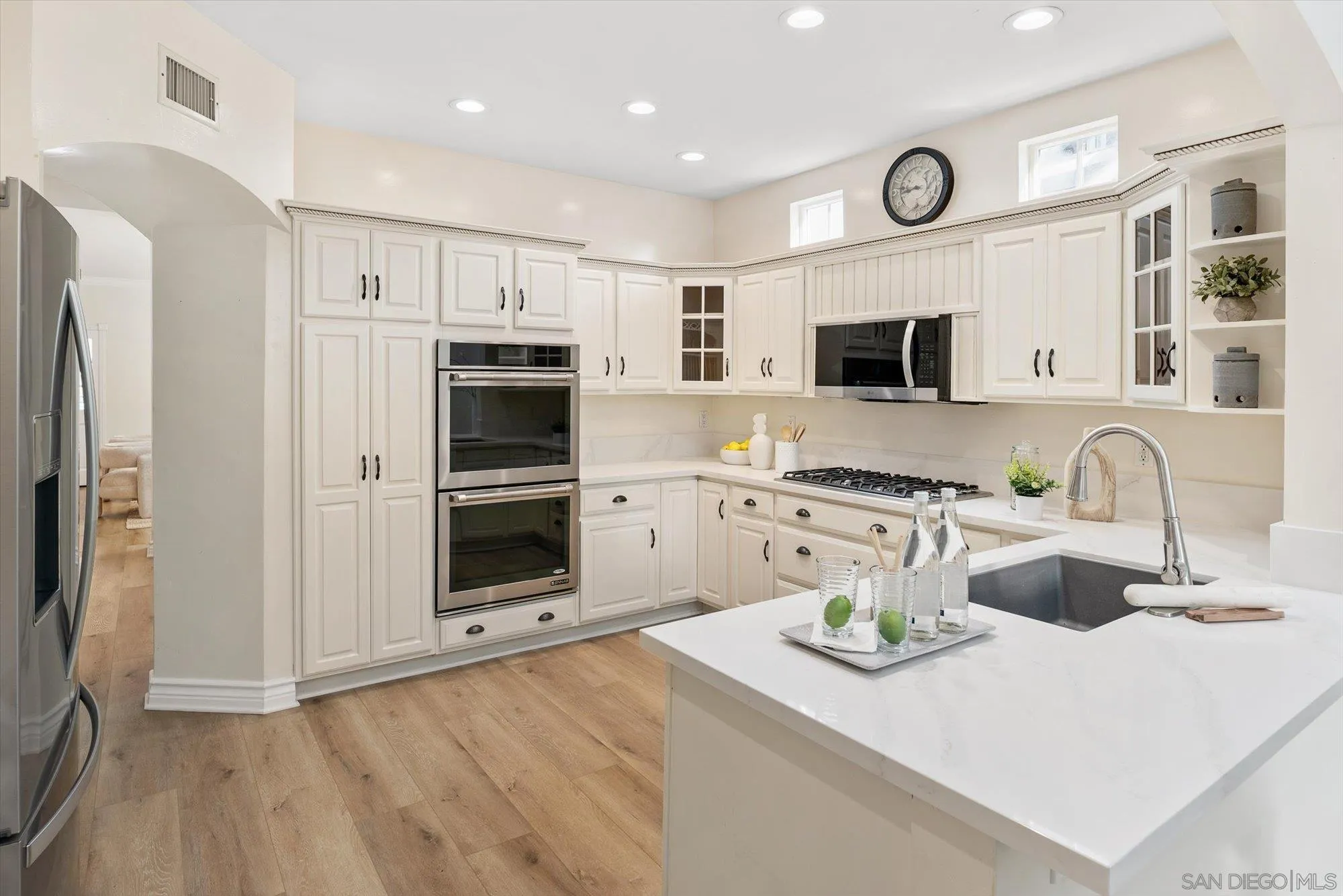 Welcome to one of Coronado's most exquisite properties, 260 H Avenue. The main home features four bedrooms, in which two are located on the first floor. In addition, the main home offers three and a half bathrooms in which one and a half are located downstairs and two are located upstairs. These bathrooms have been immaculately maintained and are glistening with recent renovations to include new luxury vinyl flooring throughout, new paint, carpet, lighting fixtures, quartz countertops and appliances. Located above the two-car garage, boasts a one-bedroom, one bathroom detached guesthouse with its own recently renovated living room, double sink full bathroom, kitchen, and laundry room. Perfect for endless options such as stay from family and friends or rental potential. This pristine property is located on a quintessential and charming street with fabulous bay and town views from the large rooftop view deck, just a short stroll away from the bay, restaurants and shops on Orange Ave. The spacious backyard offers both privacy and views of the Palm Park across the street, ready for an entertainer's delight. Additionally, the property's Solar is owned. This is a fabulous family home and move-in ready for the most meticulous buyer. Come make 260 H Avenue your family dream home.