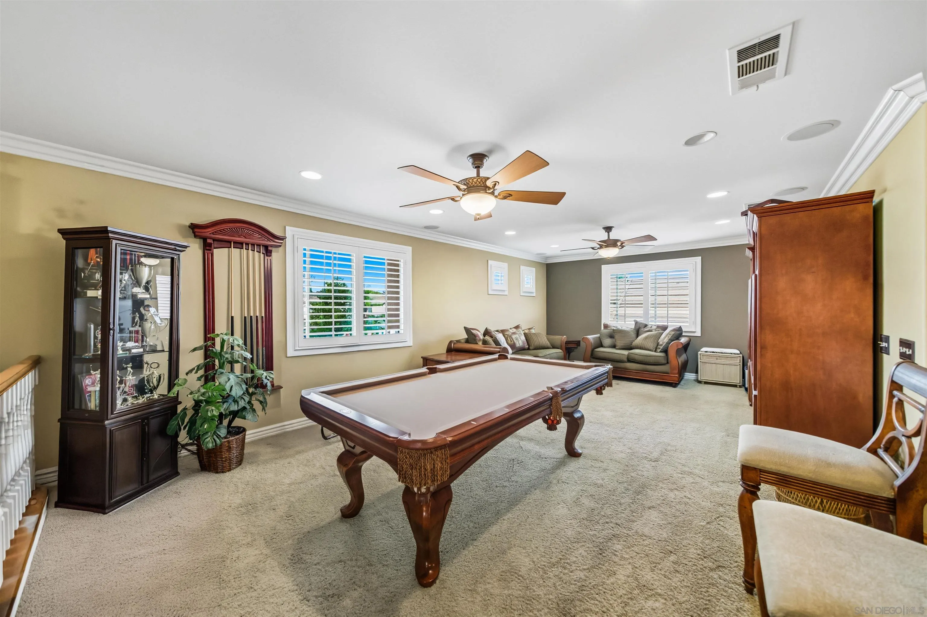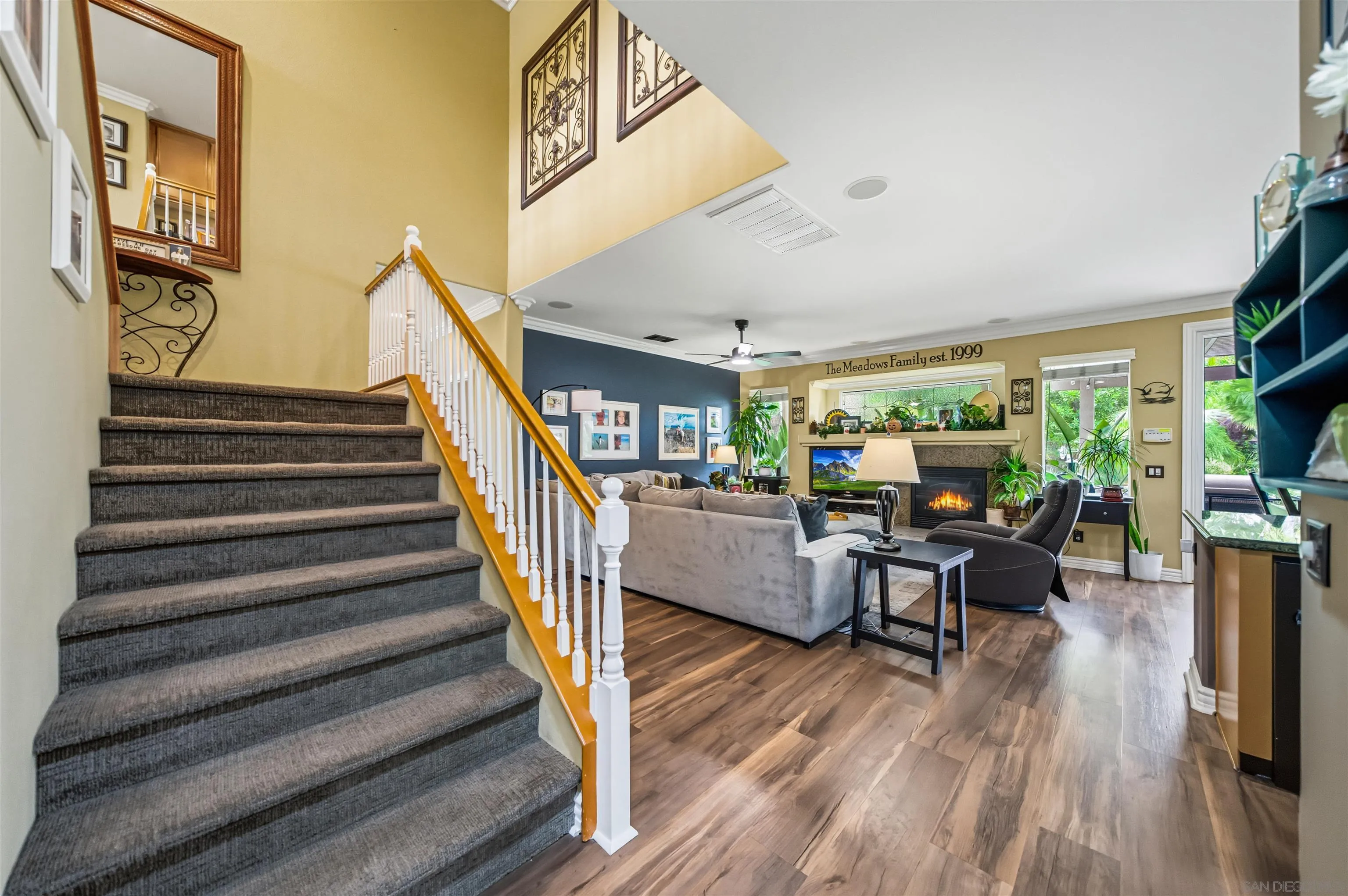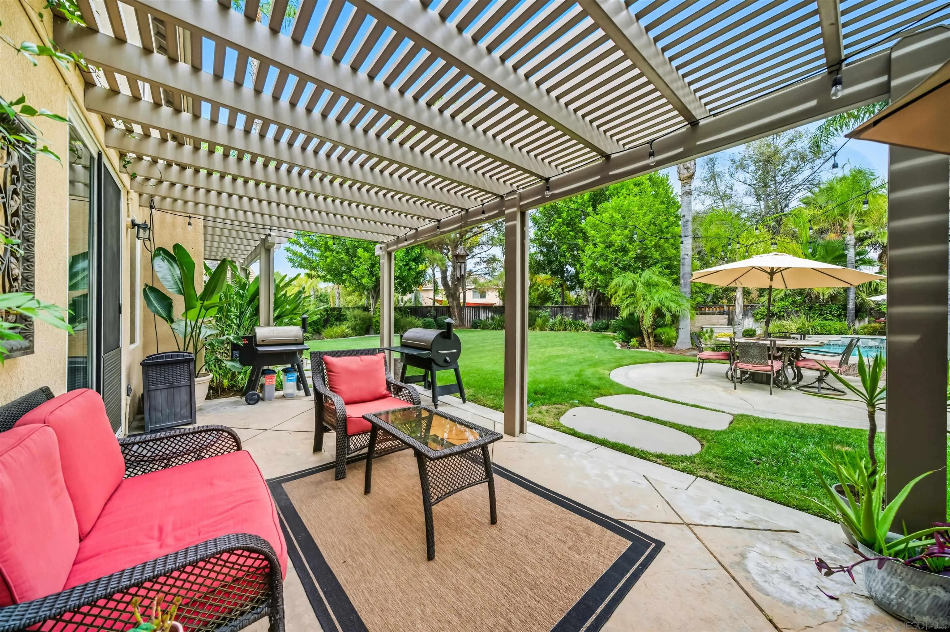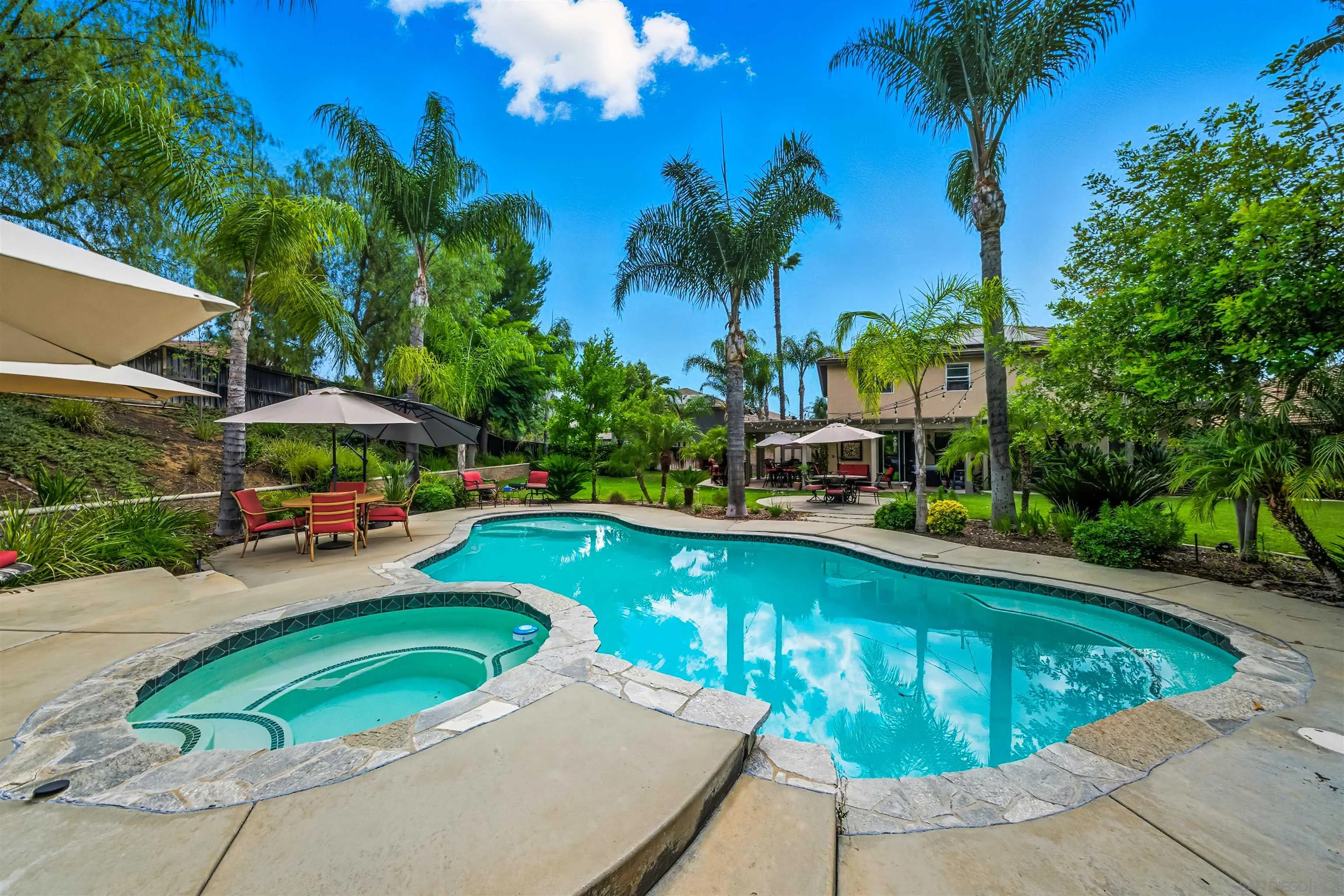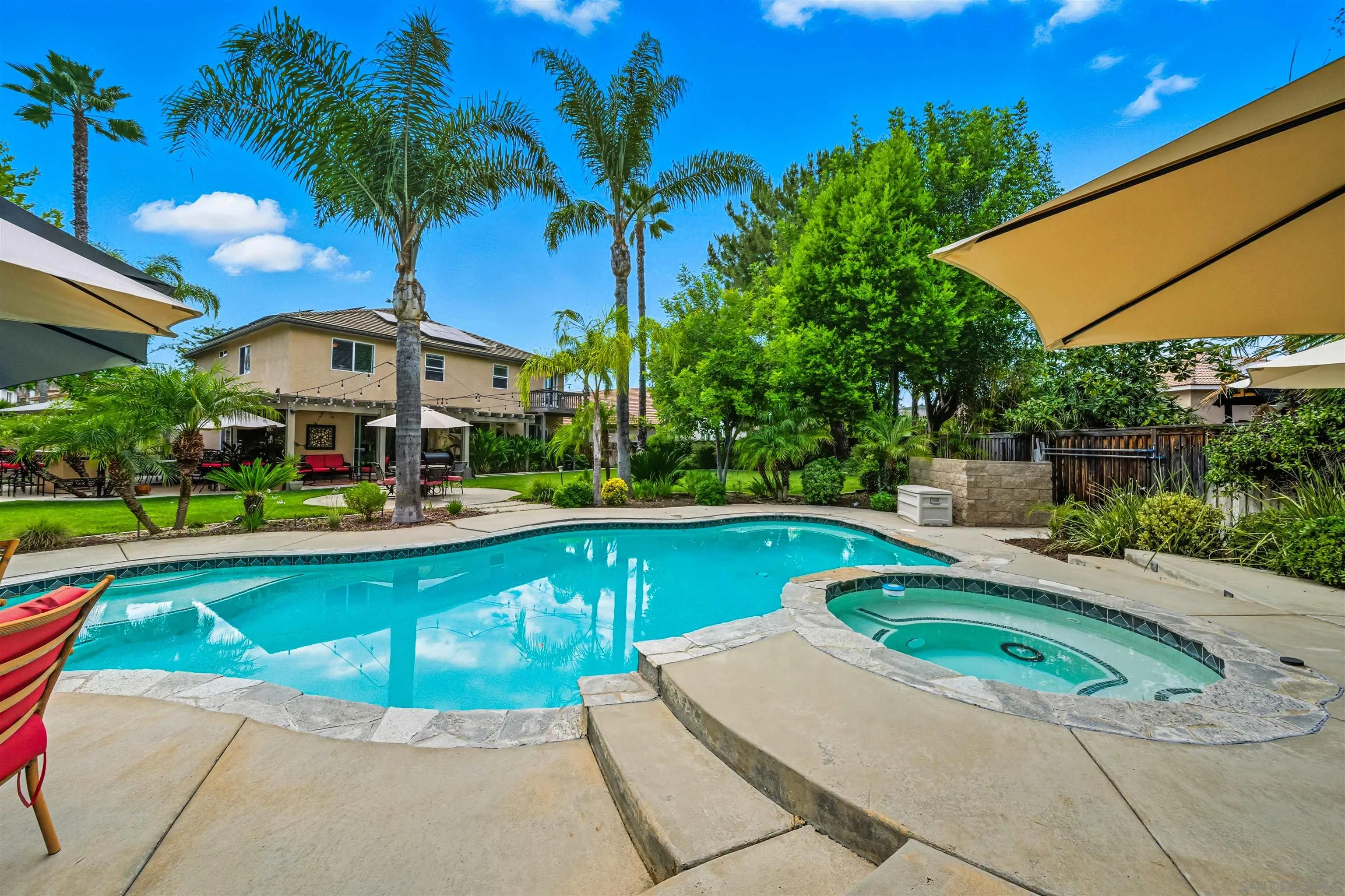Resort-style living meets everyday comfort! This beautifully maintained 5 BR /3 BA home with a convenient main-floor BR, located on a quiet cul-de-sac in Murrieta. This spacious residence offers a thoughtful layout designed for both entertaining and day-to-day living. The inviting entry opens to 9-ft ceilings, crown molding, and a comfortable living space anchored by a gas FP with electric starter. The generous kitchen features a large center island, ample cabinetry, and open sight lines to the family room, making it ideal for both gatherings and meal preparation. Upstairs features a roomy loft with built-in surround sound, perfect for a media space, home office, or play area. The primary suite offers a true retreat with a private balcony overlooking the resort-style backyard. A central vacuum system with attachments is also included for added convenience. The home is equipped with solar panels to help offset energy costs and support sustainable living. Step outside to your own private oasis. The backyard features an approx 30,000-gal pool with a waterfall, lagoon, and spa, controlled locally or remotely from the family room. Entertain with ease at the built-in BBQ island beneath the durable Alum-a-Wood arbor, providing shade and year-round outdoor living. Located in a community with award-winning schools, shopping, parks, and easy commuter access, this home combines comfort, style, functionality, and energy efficiency - offering a rare opportunity to own a true Southern California lifestyle property.