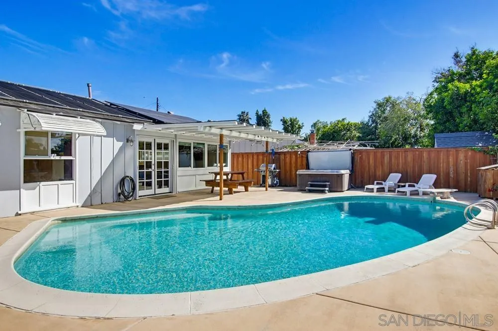 Gorgeous, Unique CA style single story Private Oasis, Gourmet Kitchen, Solar Heated Pool, Jacuzzi, Palm Trees front & back. Light, bright, lovingly upgraded over the years. Solar panels, Central Air, LED lighting, fans throughout. Very Flexible floor plan. Indoor-Outdoor living w/ 3 sets French doors & sliding door, Fully Private backyard. Amazing backyard sunsets. Irrigation front & back. Lots to see here. Upscale & Homey, safe feel. Low Maintenance. Central, close to shopping, schools. Quiet neighborhood.