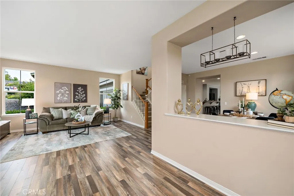 Step into 36060 Lipizzan Lane, a thoughtfully designed and private retreat in the gorgeous Clayton Ranch community. This turn-key 4-bedroom, 3-bathroom home offers nearly 3,000 sq. ft. of thoughtfully designed living space, ideal for entertaining, remote work, or multigenerational living. The main level features soaring ceilings, laminate flooring, and an abundance of natural light. You'll find a formal living and dining area, along with a large family room centered around a cozy fireplace. The open-concept kitchen includes a center island and plenty of cabinetry. A downstairs bedroom and a full bath provide flexibility for guests or in-laws. Upstairs you'll find brand new carpet and an expansive primary suite with a spacious sitting area perfect for relaxation. This suite includes his-and-hers closets, and a spa-like tub with jets. Two additional bedrooms and a full bath are just down the hall, along with a generously sized upstairs laundry room featuring a utility sink and ample storage. The backyard offers a sense of privacy with vinyl fences, stamped concrete, retaining walls, and no direct rear neighbors at eye level. Enjoy mature fruit trees in both the front and back yards that add charming, homegrown flavor to this peaceful property. Located in a desirable HOA community within the Lake Elsinore School District, this home is just minutes from shopping, hospitals and both the 15 and 215 freeways. Don't miss this highly desirable home in the heart of Wildomar.