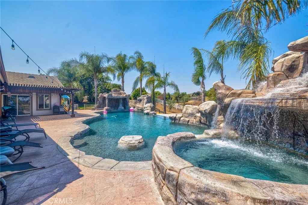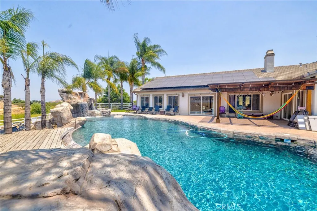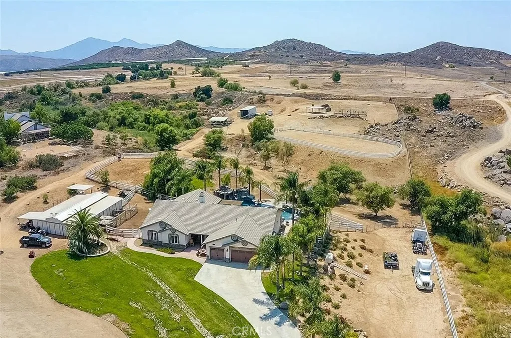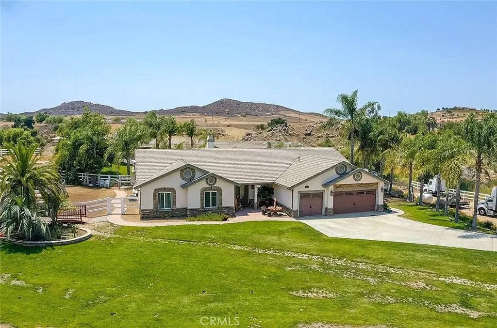 Discover the perfect blend of luxury and rural living with this stunning 4-bedroom, 3-bathroom home located near scenic Lake Matthews. Sitting on nearly 5 flat, usable acres, this property is the epitome of a ranch homethoughtfully designed for both comfort and functionality. Inside, youll find an open floor plan with a spacious kitchen centered around a large island, ideal for entertaining. Just outside, enjoy a resort-style pool surrounded by peaceful open space. Equestrian amenities abound, including a four-stall mare motel, five covered stalls with automatic waterers, power, and lighting, two arenas, multiple pens, and more. The barn features a wash-down area, tack room, and turnouts, with a sizable area perfect for ATV storage. As you explore the grounds, you'll also find a hot walker, covered RV storage, and plenty of room for other animals. A pre-paid solar system and security system add to the property's value, making this an incredible opportunity to own a true turnkey ranch retreat.