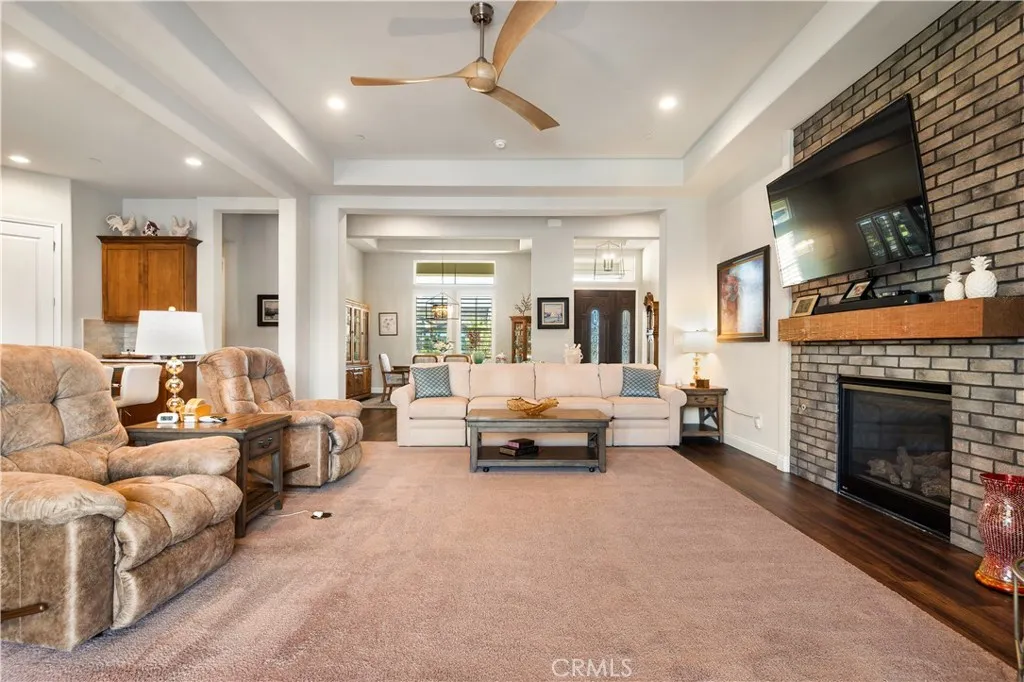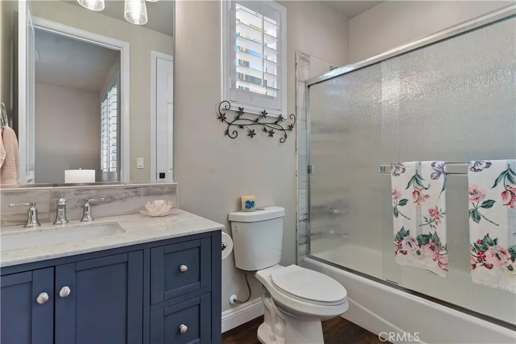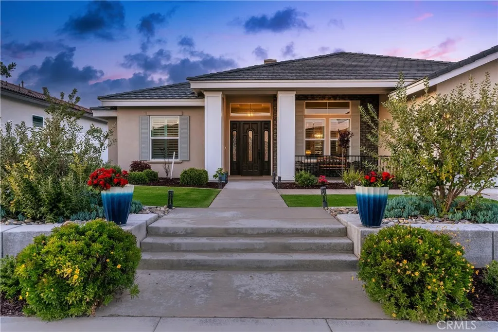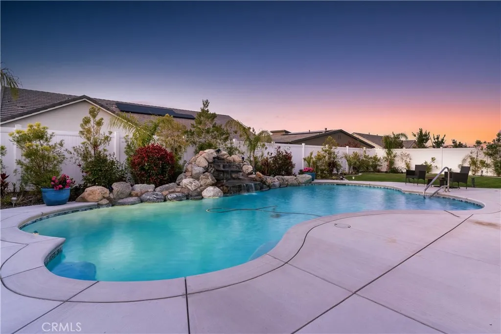 Exceptional Gaskill Rose custom home nestled in the Highgate Shires at Seven Oaks, boasting double-gated security. This immaculate split-wing residence presents an enticing blend of luxury and functionality, offering a pristine opportunity to acquire a virtually new property. Revel in the tranquil allure of the tropical oasis backyard, complete with a mesmerizing pool featuring a cascading waterfall. Inside, discover elegant vinyl plank flooring throughout high-traffic areas, complemented by plush carpeting in bedrooms and the living room enclave. The gourmet kitchen showcases a vast quartz-topped island, seamlessly flowing into the inviting living space adorned by a floor-to-ceiling brick fireplace. Benefit from the owned solar system for enhanced energy efficiency. Indulge in the convenience of pre-installed wood shutter window coverings and other upscale finishes. Experience the epitome of modern living in a meticulously crafted home.