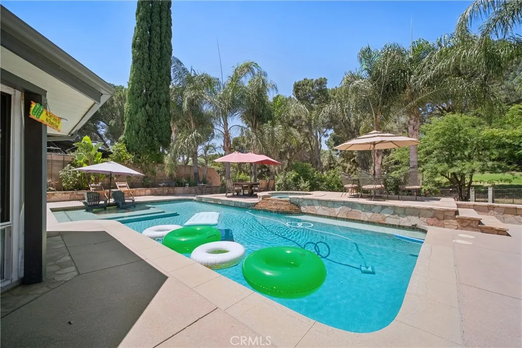 Welcome to 16857 Colven Rd, a beautifully upgraded and private Granada Hills retreat nestled on a rare 20,564 sq ft flag lot backing directly to the 14th tee box of Knollwood Country Club Golf Course. This 3-bedroom, 2.5-bathroom home measures approximately 2,516 sq ft of interior living space, with an additional 545+/- sq ft sunroom and 300+ sq ft pool house with bathroomideal as a guest retreat, studio, or flex space. It may be different from public records. Buyer to verify permit status and square footage. Upgrades include vaulted ceilings, recessed lighting, tiled floors, Marvin Windows with Plantation Shutters, a 60' glass-enclosed sunroom, and a finished garage with insulation, drywall, and recessed lighting. A tankless water heater ensures comfort and efficiency, and a 2021 mini-split system provides zoned cooling. Paid-off solar panels (installed in 2015) offer long-term energy savings. The property is accessed via a 160' private driveway leading to a sprawling ranch-style home. The front yard features custom lighting, fountains, ample parking, and a 320 sq. ft. 4-hole putting green. A custom wrought iron gate secures the front porch, blending curb appeal with peace of mind. The remodeled kitchen boasts rich cabinetry, a two-level granite island, tile floors, a garden window, and recessed lighting. It opens to a spacious den, and a solid wood French door connects to the west patio. The sunroom features tinted windows, recessed lighting, and French doors on both sides, plus two 10 Longview sliders and a 13 Marvin wood-clad French door. The primary suite offers tiled