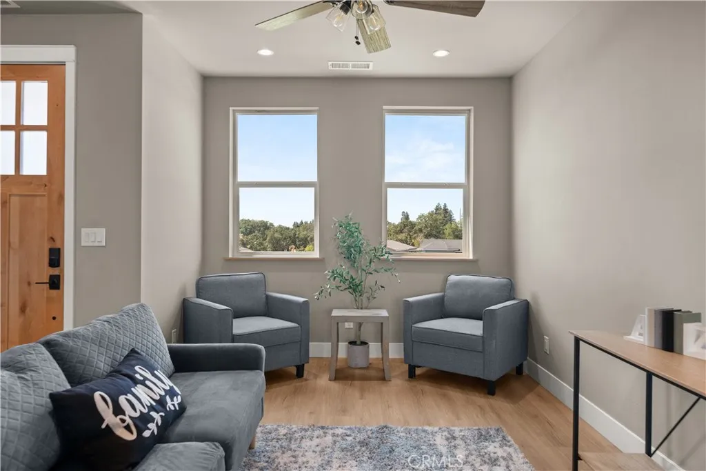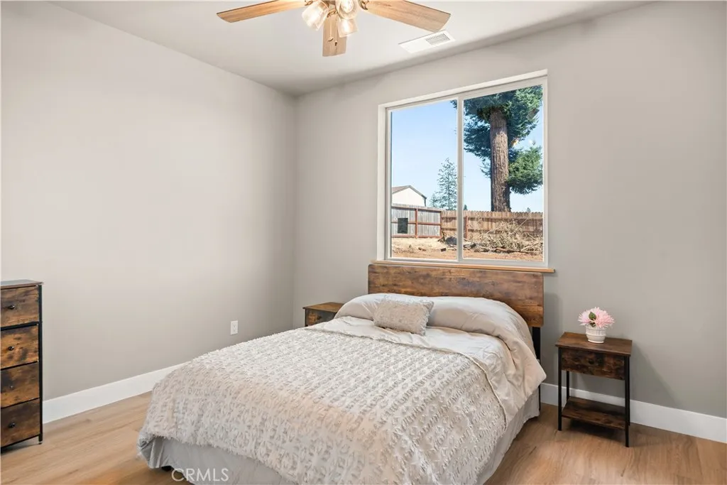 Welcome home to the sought after neighborhood in Paradise on Circlewood Drive! This brand new construction home is charming through and through with details that make the space feel cozy and comfortable. As you walk in the front door you're greeted by an open floor plan with the living room and kitchen being the heart of the home. Warm laminate flooring runs throughout, recessed lighting, a ceiling fan, and custom wood window sills give the perfect touch of detail. In the kitchen, there is a walk-in pantry, and a large island that is perfect for meal prep, entertaining, or simply belling up for a quality meal. The cabinets are custom built with granite counters, trendy black pendant lights, a farm sink, an electric range, over the range microwave, dishwasher, and refrigerator. The two guest bedrooms are generous in size, both have ceiling fans, and share a hall bathroom with a spacious vanity and tiled tub/shower. The primary bedroom sits on the other side of the home with an en suite bathroom that caters to all your needs! There is a soaking up, fully tiled walk-in shower, and dual sink vanity with granite counters. Don't miss the indoor laundry room and mudroom area with a bench and storage for shoes, coats, and backpacks. Outside there is OWNED SOLAR, an expansive front lawn, wood fencing, and plenty of room for outdoor activities. The design and finishes were thoughtful and truly make this the perfect place to call home.
