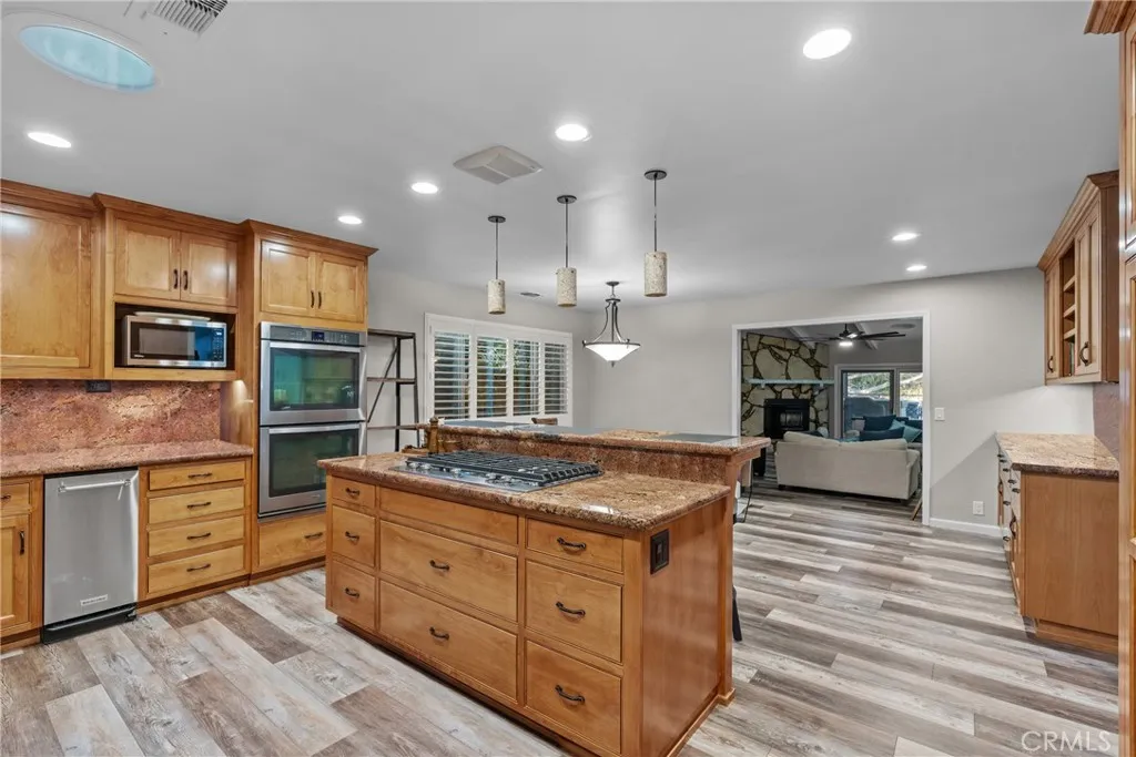 Discover the ultimate luxury lake home, perfectly designed for either multi-family shared lake home or a spacious single-family home. Situated on a 0.34-acre lot in the Lake Nacimiento gated community of Heritage Ranch, this residence combines elegance, functionality, and resort-style comfort with expansive mountain views and protected green space as its backdrop. An oversized three-car garage provides ample storage for all your lake toys, while a separate 575 sq. ft. suite (not included in the homes listed square footage) offers a private gym, office, and half bath. This flexible space is ideal for remote work, recreation and wellness. Inside, soaring beamed ceilings, two stone fireplaces, wet bar, and two spacious living rooms set the stage for both relaxation and entertaining. The kitchen is thoughtfully designed with a center island cooktop, double ovens, stainless steel appliances, walk-in pantry, built-in buffet, and breakfast bar, making it perfect for daily living or hosting gatherings. Two primary suites each feature dual vanities, walk-in showers, walk-in closets, and sliding doors that open to outdoor living spaces. One suite also includes a private lounge or office area. A third guest bedroom with a full bath and a separate laundry room add further convenience. Outdoors, enjoy a large covered patio for dining, a covered hot tub, and open space to take in the surrounding views and wild life. Fully owned solar panels installed in 2024 along with a new roof ensure efficiency and minimal electric costs. This home is a private lake retreat thoughtfully crafted for ev