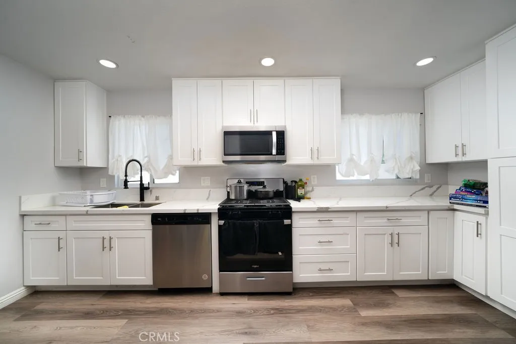Magnificently Reimagined North Downey Home with Desirable Upgrades, ADU, and Spacious 7,567 sq. ft. lot! Ideally nestled in a highly sought-after neighborhood just moments from shopping centers and other daily conveniences, this incredibly unique property affords an amazing opportunity for savvy homeowners and seasoned investors. Freshly painted with modern colors, the exterior captivates with modern horizontal fencings, tidy landscaping, classic smooth stucco finish, newer front gate, and an oversized paved driveway. Step inside the 3Bed/2Bath, 1,400+ sq. ft. MAIN HOUSE to discover an organically flowing floorplan, fresh neutral paint, overflowing natural light, gorgeous faux-wood wide-plank laminate floors, recessed lighting, elegant dining area, and a spacious living room. Perfectly appointed for easy meal preparations, the gourmet kitchen dazzles with stainless-steel appliances, quartz countertops, white shaker cabinets, undermount stainless-steel sink, gas stove, built-in microwave, dishwasher, and sleek hardware. Enjoy the relaxation found in the primary bedroom, which has plenty of closet space and an attached end suite boasting custom tilework, shower/tub combo, and a storage vanity. Two extra bedrooms are generously sized with dedicated closets and may also satisfy lifestyle-specific flex space needs. Finally, the attached, ADU offers multigenerational options and/or additional income opportunities for offsetting the mortgage. Fabulously refinished, the fashionable 1Bed/1Bath, 300 sq. ft. ADU enchants with mini-split heating/air, sizeable bedroom, full kitchen (no