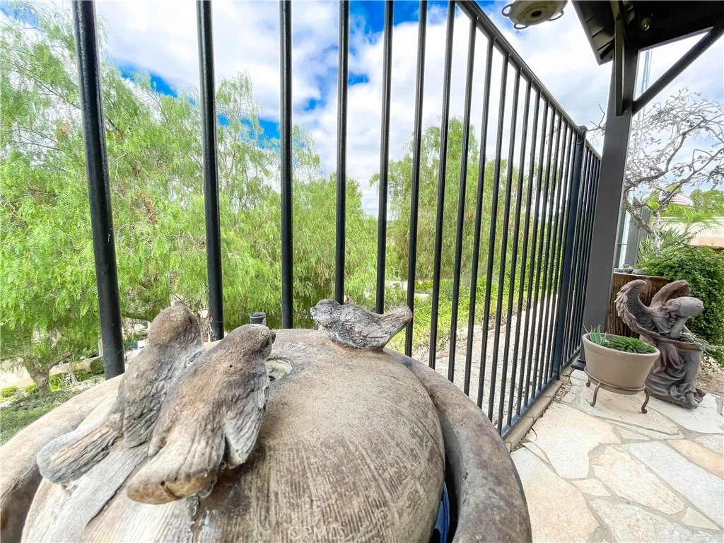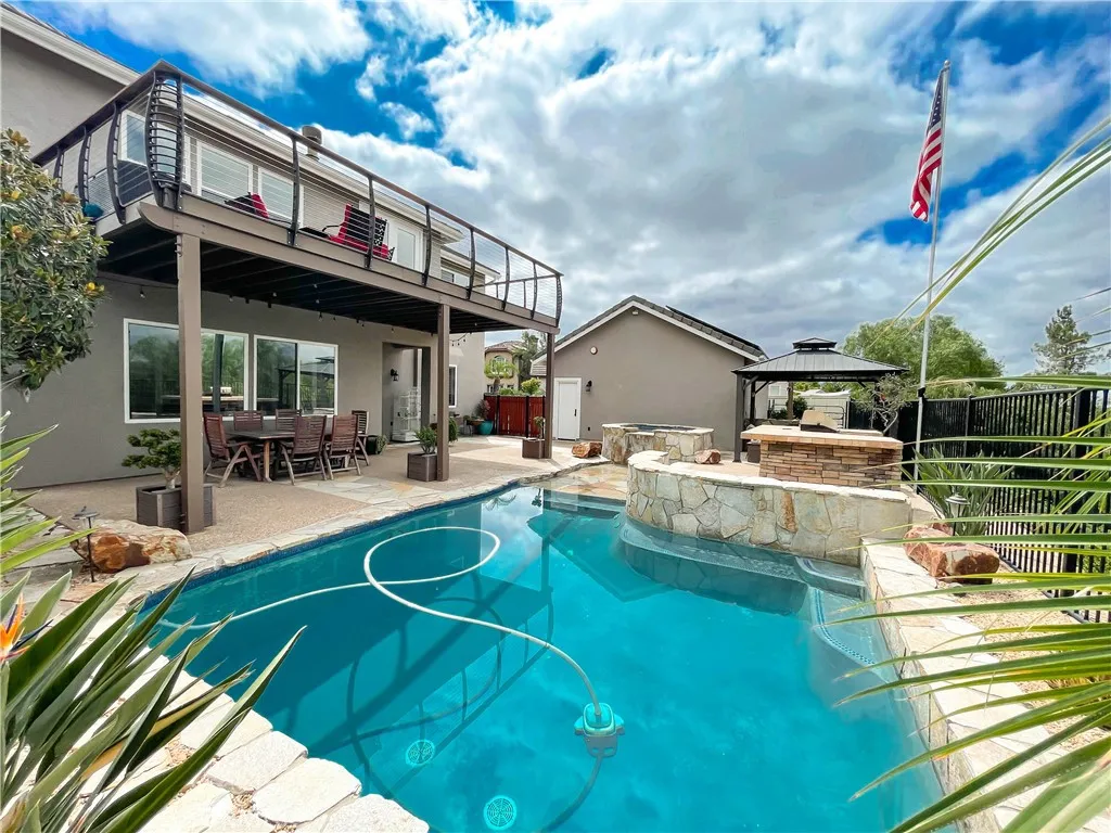 Gated community, text/call agent for gate code. Nestled within the exclusive gated community of Peppertree Park in Fallbrook, this elegant residence is the perfect blend of privacy, luxury, and community living. Situated on a tranquil cul-de-sac, the home features a sparkling private pool and spacious outdoor living areas designed for both relaxation and entertaining. Plantation blinds and wood shutters throughout on wood trimmed windows, wood work throughout including wainscot wall treatments, wood wrapped doorways, window framing and sills. Kitchen offers large, center island, granite counters, white cabinetry, mini stacked stone backsplash. Dacor stainless steel appliances (5 burner cook top, vent hood, double convection wall oven, dishwasher & wall mounted microwave). Beautiful formal entry with access to formal dining room on one side and living room on other. Wrought iron spindle handrail with hardwood plank stairs. Upstairs offers primary bedroom suite with retreat sharing two sided, gas fireplace and door access to oversized Trex deck patio with modern railing and breath taking views of green hills that has to be seen to fully appreciate. Two additional bedrooms on second level, connected by jack-n-jill bathroom, with dual sink vanity and doored off shower/tub and toilet area. Media nook integrated into wrap around upper landing; large bonus room (could be converted to 5th bedroom). Home includes whole house fan on remote and temperature controlled attic fan. Back yard oasis complete with slat water pool, hot tub, built-in BBQ area, covered area, ideal for outdoor d