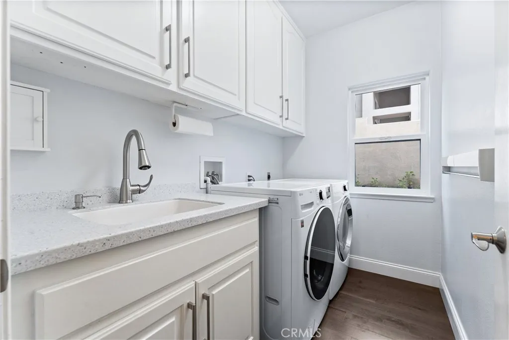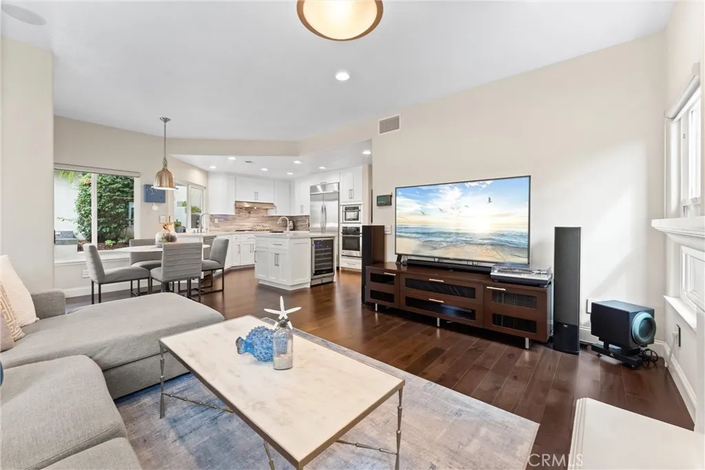 This stunning remodeled home blends modern luxury with coastal charm, designer finishes throughout, and canyon & peekaboo ocean views. Entering the light-filled home, enjoy luxurious Mirage walnut floors, French doors, newer windows, recessed lighting & designer light fixtures throughout, as well as elegant crown molding with accent lighting in the dining room. The gourmet kitchen is a chefs dream featuring newer cabinetry with self-closing wood drawers & pull-outs, soft close doors, quartz counters, and an enlarged island with wine fridge & sink. Premium appliances include a Viking 5-burner cooktop, pot filler faucet, newer built-in KitchenAid 42" refrigerator, Fisher & Paykel dishwasher drawers, GE Monogram convection oven, convection microwave, plus a generous walk-in pantry and reverse osmosis with insta-hot dispenser. Upstairs, the primary suite offers high ceilings and ocean glimpses, complemented by a spa-inspired bath with radiant heat floors, a Sani-jet soaking tub, rain shower, towel warmer, and walk-in closet. Additional highlights include a permitted loft, 3 additional bedrooms (one with custom office built-ins), upgraded baths with premium fixtures, a porcelain tile wall in the powder, Toto toilets throughout, newer garage doors, and on a single loaded cul-de-sac street! Every detail has been considered, from dual Nest thermostats, attic fan, whole-house water softener, and epoxy-coated pipes, to refined lighting and finishes throughout. Step outside to your private backyard retreat, designed for effortless entertaining and relaxation. Featuring an outdoor livi