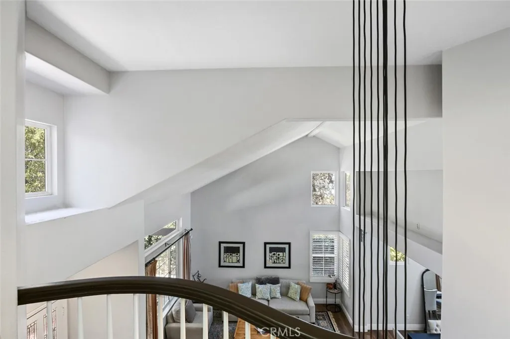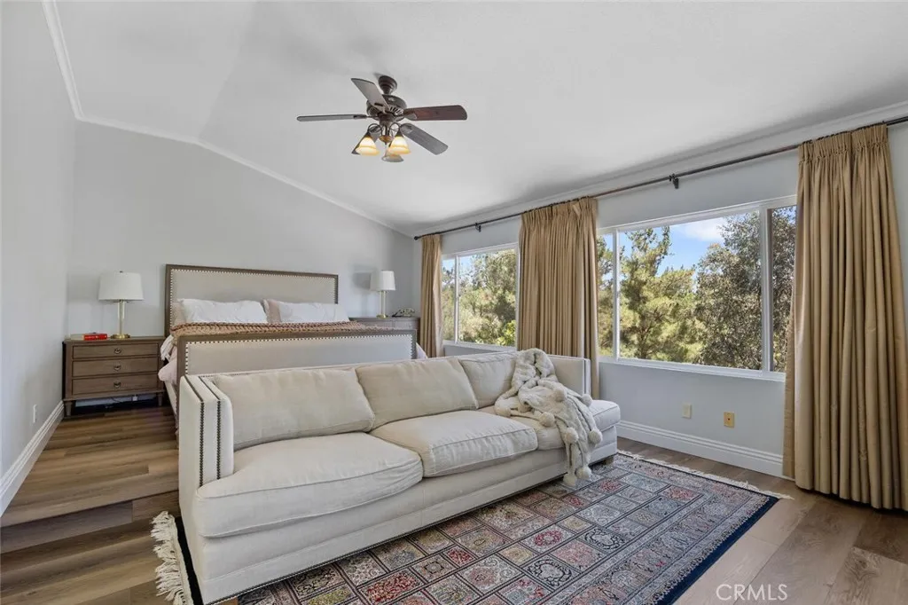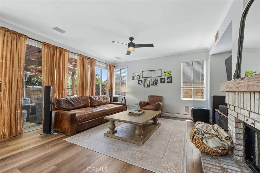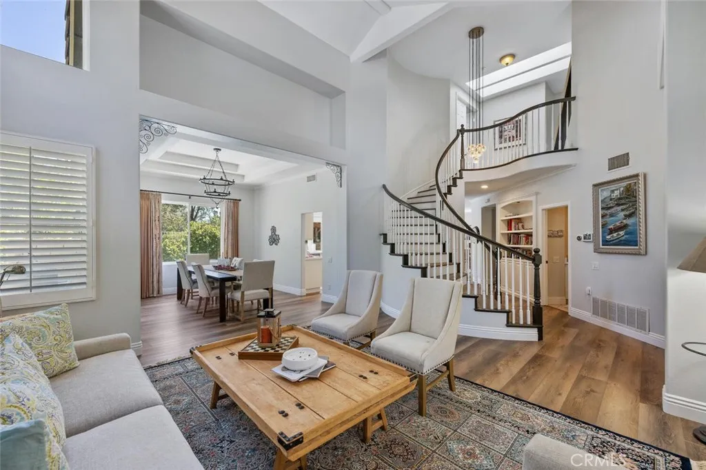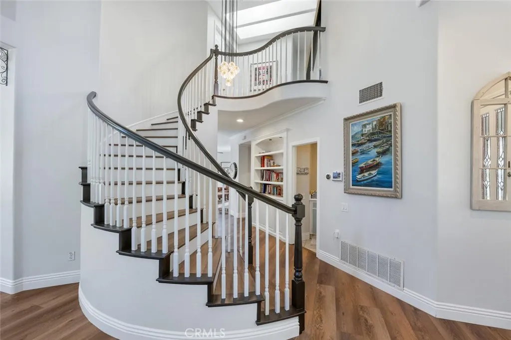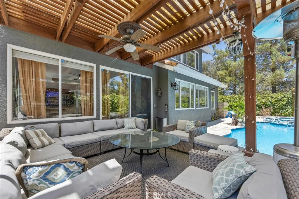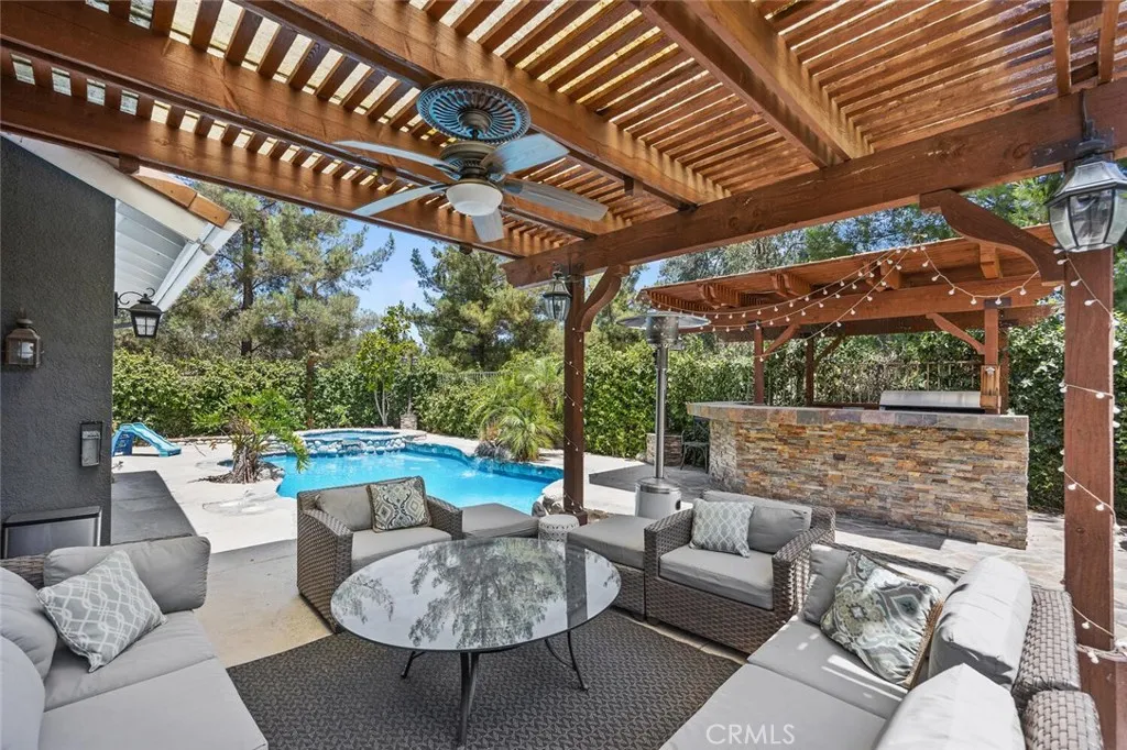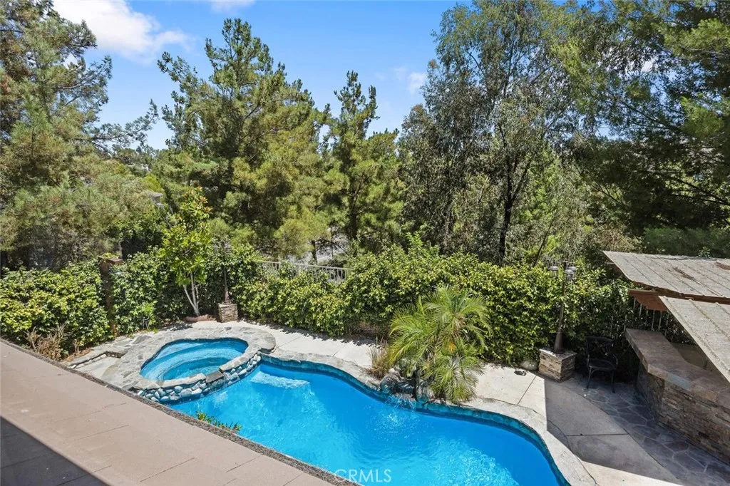 Exquisite Northbridge POOL, SPA and VIEW home on sweeping Flag Lot at the top of a tree lined cul de sac street! This beautifully upgraded two-story home features 4 bedrooms and 3 full bathrooms (one on the MAIN FLOOR) with approximately 2,900 square feet of living space plus a 3-car garage with tons of storage and epoxy coated flooring! The soaring cathedral ceiling, regal winding staircase and plethora of picture windows offers abundant natural light leaving a lasting impression! With neutral, wide luxury vinyl plank flooring, recessed lighting and designer finishes this Valencia home is move-in ready! The bright living room flows seamlessly into the formal dining area, highlighted by large windows and an elegant chandelier! The heart of the home is the beautifully upgraded kitchen featuring a gorgeous, quartz topped center island with bar seating, pendant lights, stainless steel appliances and open glass cabinetry! The kitchen conveniently opens to the spacious and inviting family room complete with a brick fireplace, timeless wood mantle, crown molding, and ceiling fan! This main living space overlooks the sparkling swimming pool, covered patio and built-in BBQ! The main floor also boasts a huge downstairs bedroom and bath with a walk in shower! Tastefully upgraded with pebble like flooring, glass accents and designer lighting! Adjacent there is a convenient laundry room complete with utility sink and extra storage leading to the 3 car garage! The entertainers backyard is a true retreat with a sparkling pool and spa, cascading waterfall, covered patio, and a 6-person st