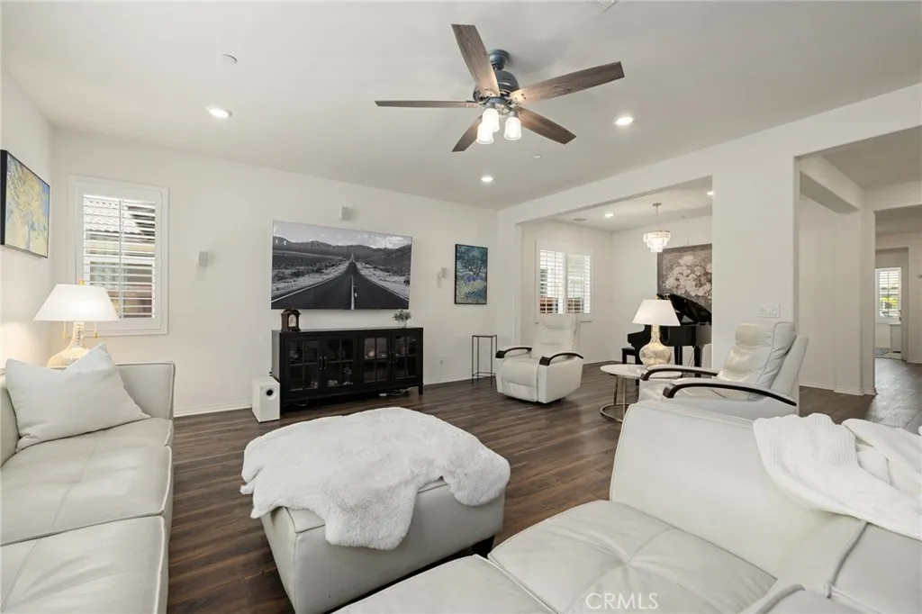 Rarely available LAKE VIEW home featuring one of the most desirable open floor plans with over $100,000 in high end finishes located in the highly desirable Heritage Lake community in Menifee. This two-story home sits on a quiet cul-de-sac and features 4 bedrooms, 3 full baths, PAID OFF solar, and smart home controls. The front yard greets you with an extended-width driveway for ample parking and excellent curb appeal with mountain views. Inside, enjoy a bright and open floor plan with neutral tones, LVP flooring, custom paint, and plantation shutters throughout. Advanced Wi-Fi repeaters ensure strong connectivity across both levels. The chefs kitchen is a showstopper, offering dark granite counters, an eat-up island, a large walk-in pantry, white cabinets with built-in pot and pan drawers, upgraded stainless steel appliances, including double ovens, a premium counter depth, double freezer LG fridge, DELFINO glass flicker white mosaic tile backsplash with custom chandeliers and pendant lighting. The spacious great room includes a built-in Bose surround sound system, and 77''LG OLED TV and sound bar ideal for both relaxing and entertaining. The versatile dining space can be used as a thoughtfully designed flex space. The main floor also features a spacious downstairs bedroom and full bath with a walk-in shower. The 2.5 car garage has "Cloud" color flooring with a clear epoxy topcoat. Heading up the LVP floored stairs you are dropped off into a large loft on the second story featuring an oversized laundry room including premium LG washer and dryer and tons of storage. The two