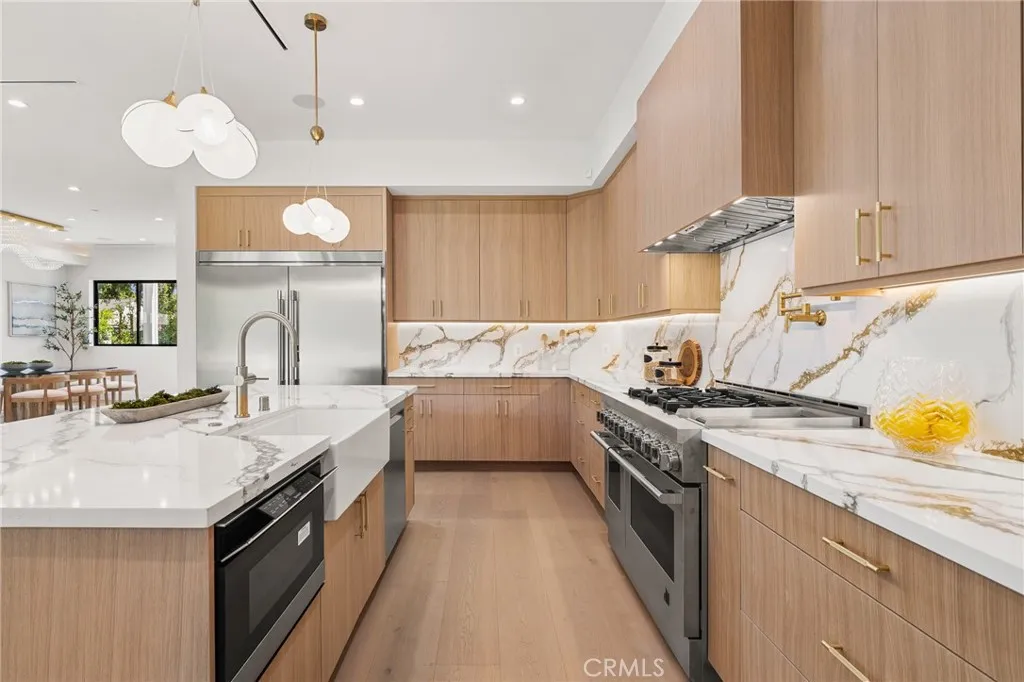 Newly built Encino home boasting top notch luxurious finishes and craftsmanship throughout. Bright and open floor plan with soaring high ceilings which flood the home with natural light. Sleek chefs kitchen displaying an oversized center island, custom cabinetry and top of the line appliances. Large glass doors lead to the entertainers yard with the built-in BBQ with bar seating and ample grassy space. Upstairs you will find the primary suite featuring vaulted ceilings, cozy fireplace, walk incloset space. Indulging bathroom with soaking tub, walk in shower and dual vanity and oversize balcony overlooking to the yard and two additional en-suites. Home also features a spacious 2 bed ADU perfect for an in home office or in-laws suite. Additional amenities include smart system, surround sound system and security cameras throughout. Perfectly nestled on quiet tree lined street just minutes from shopping, restaurants and schools THIS IS A MUST SEE !