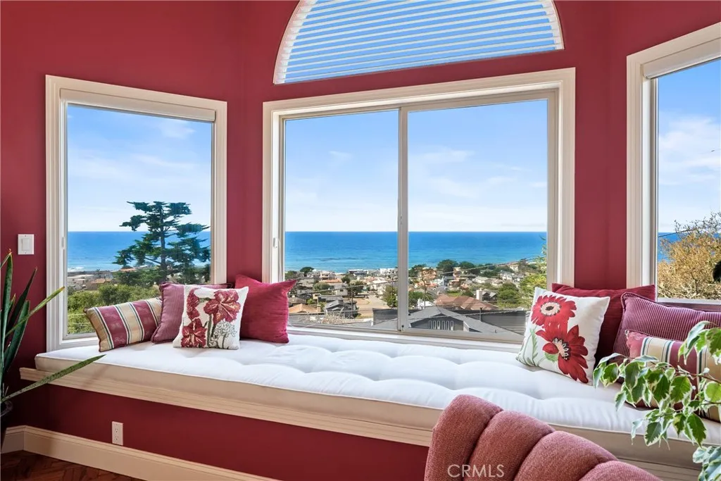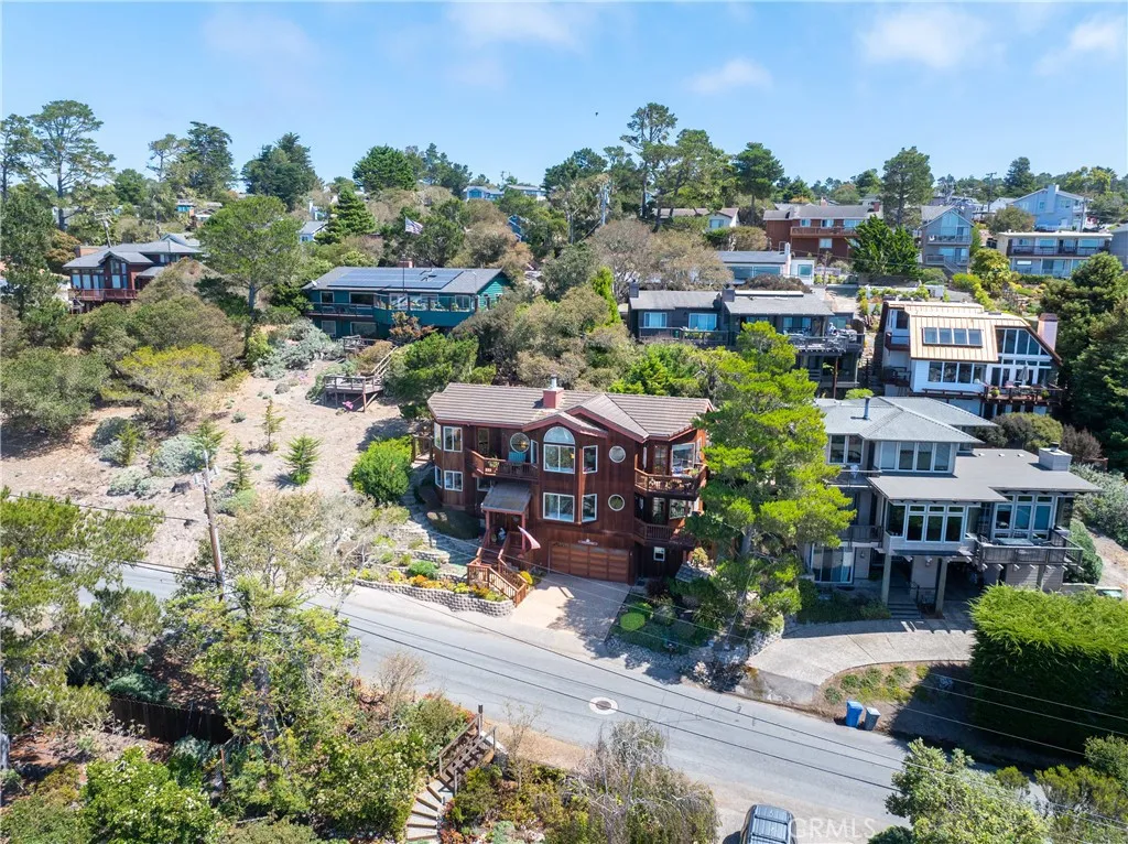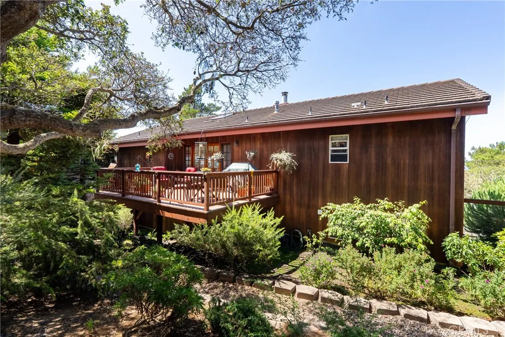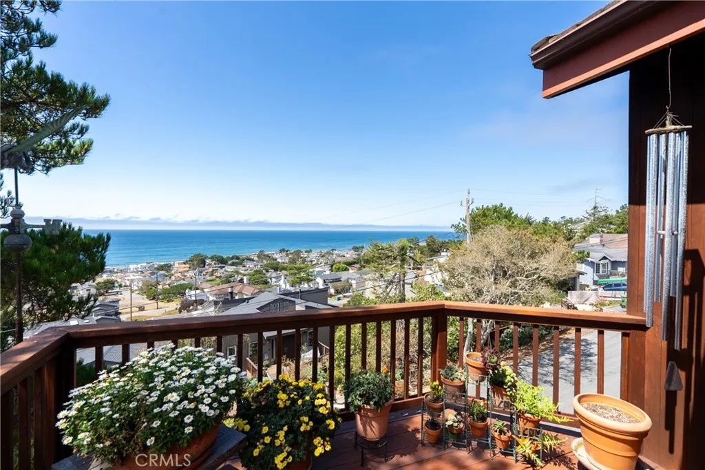 Custom built redwood home designed to capture sweeping ocean views from nearly every room. The open floor plan blends kitchen, dining, and living spaces with walls of westerly windows framing the Pacific, while easterly windows and decks look out over peaceful private gardens. The kitchen is a true centerpiece with custom Corian countertops, handcrafted tile backsplash, a garden window, 36-inch five burner cooktop, custom wood floors, and a shiplap ceiling, all opening seamlessly to the living areas. The living room invites gatherings with its woodburning fireplace, brick hearth, built-in bookcases, and massive window seat. A dumbwaiter provides effortless convenience with an access door on each level, perfect for moving groceries and household items with ease. The primary suite is a private retreat with a gas fireplace, two walk-in closets, spa-like bathroom with jetted tub, separate shower, dual sinks, and a private deck overlooking the Pacific. A second oversized window seat adds warmth and character to the suite. Situated on three lots, the property enjoys drought-tolerant landscaping sustained by an artesian-fed water capture and storage system. Every level features a deck to take in the views, while the concrete tile roof, cobblestone-style driveway, and two-car garage enhance its quality and appeal. Built by sought-after Brian Wilson. Located in one of the most sought-after neighborhoods near both the ocean and Fiscalini Ranch, this one-of-a-kind home pairs custom craftsmanship with coastal living at its finest.