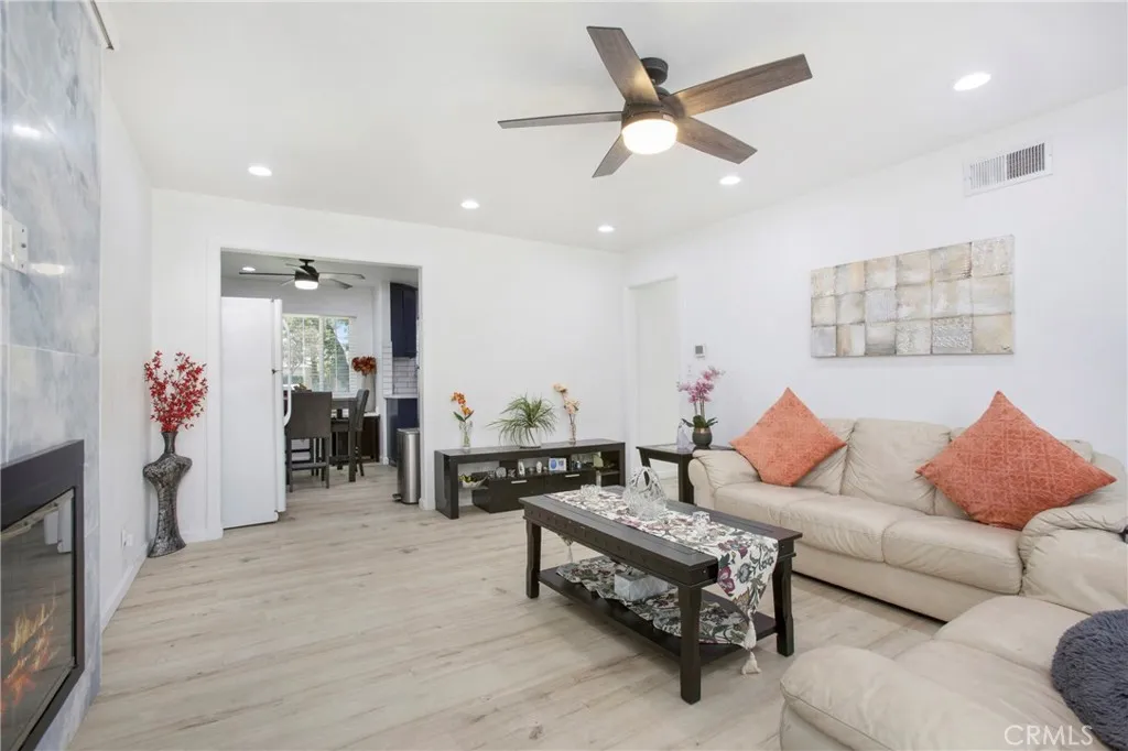 This beautifully remodeled 4-bedroom, 2-bathroom single-family home offers privacy, space, and modern living with the unique option of both residential and commercial use. The versatile floor plan features three distinct living areas, ideal for multigenerational living, a home-based business, or rental income. The brand-new kitchen shines with quartz countertops, custom cabinetry, stainless steel appliances, and a stylish backsplash. An open-concept design is enhanced with waterproof hybrid resilient luxury vinyl plank flooring, an upgraded fireplace with hidden LED lighting, and fresh interior and exterior paint. All rooms are equipped with ceiling fans for comfort and energy efficiency, and the laundry area is conveniently located in the garage. The backyard is built for entertaining, showcasing a resurfaced pool, covered patio, mature citrus trees, and full block wall fencing for privacy. Situated on a 7,215 sq. ft. lot, the home provides approximately 1,418 sq. ft. of thoughtfully designed living space. Additional highlights include dual-pane windows, aluminum tile roofing, and a two-car garage with dual side-opening doorsoffering extended space for parking, a boat, or a trailer. Conveniently located near shopping, dining, and major freeways, this move-in-ready property seamlessly blends residential charm with commercial versatility, presenting a rare opportunity to live, work, and invest all in one.