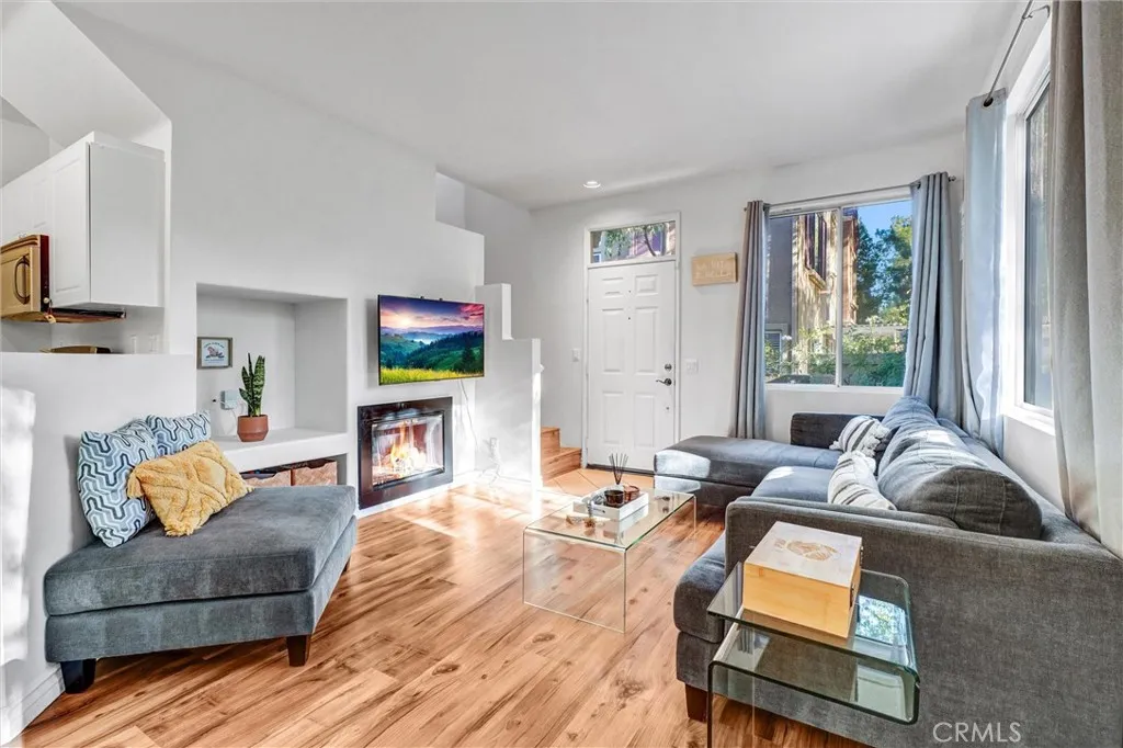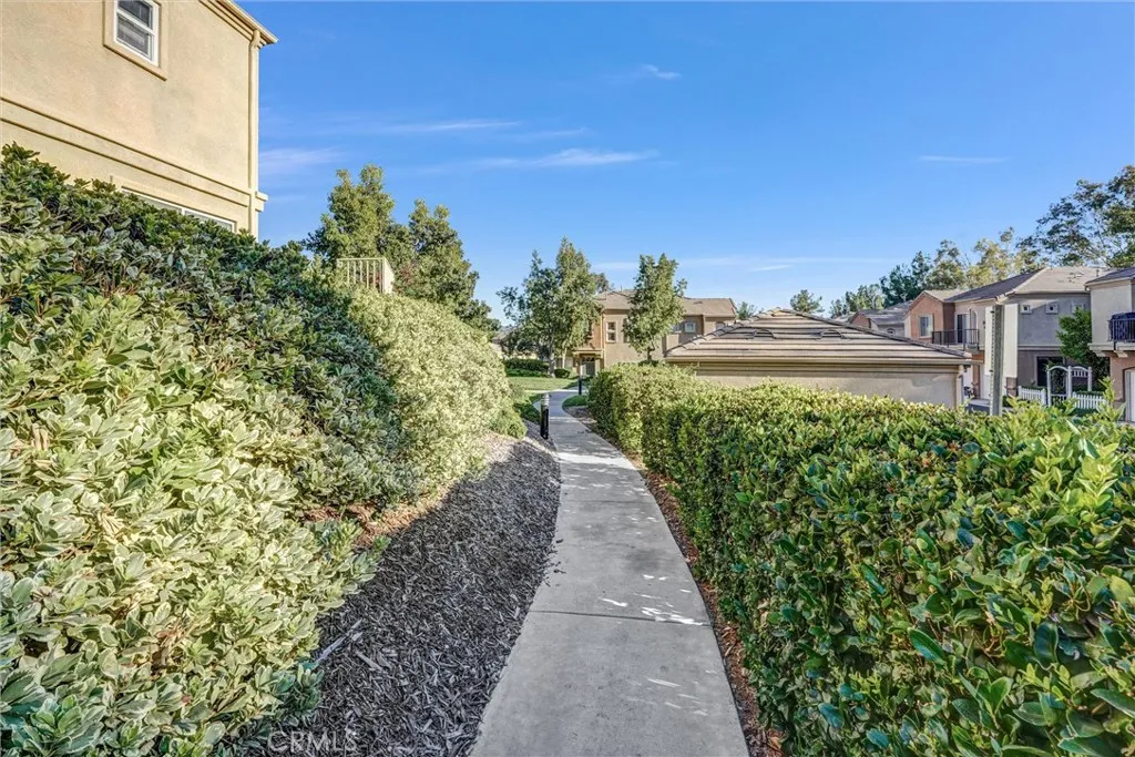 Craving a peaceful tree-lined view while mere moments from city conveniences? This remarkable 2-bedroom, 2-bath townhome in the Rose Arbor Condominiums complex blends an elevated lifestyle with scenic tranquility in Valencia! Resting along a quiet pathway in a rear-unit location, enjoy a sense of privacy and your own leafy prospects of the Paseos. Inside, soft natural light pours through wide windows across wood-style floors, crisp white walls, and recessed lighting. Its open-concept layout flows from the living roomanchored by a fireplace and built-insto the dining area and through to the kitchen, where stainless steel appliances, tiled countertops, and ample cabinetry make cooking feel effortless. Slide open the glass doors to your well-sized patio, perfect for a relaxed brunch or a breezy evening BBQ. Upstairs, the primary suite offers treetop vistas and an ensuite featuring a dual-sink vanity and a shower/tub combo. A second bedroom and full hall bath complete the upper level. Additional perks include an attached 1-car garage with a laundry corner, plus access to the community pool, spa, and picturesque Valencia Paseo trails just beyond your door. Near award-winning schools, restaurants, Bridgeport Park, and shopping, along with proximity to the I-5, this home invites you to experience suburban calm with urban benefits. Come see how this amazing abode could signal the start of your new chapter!