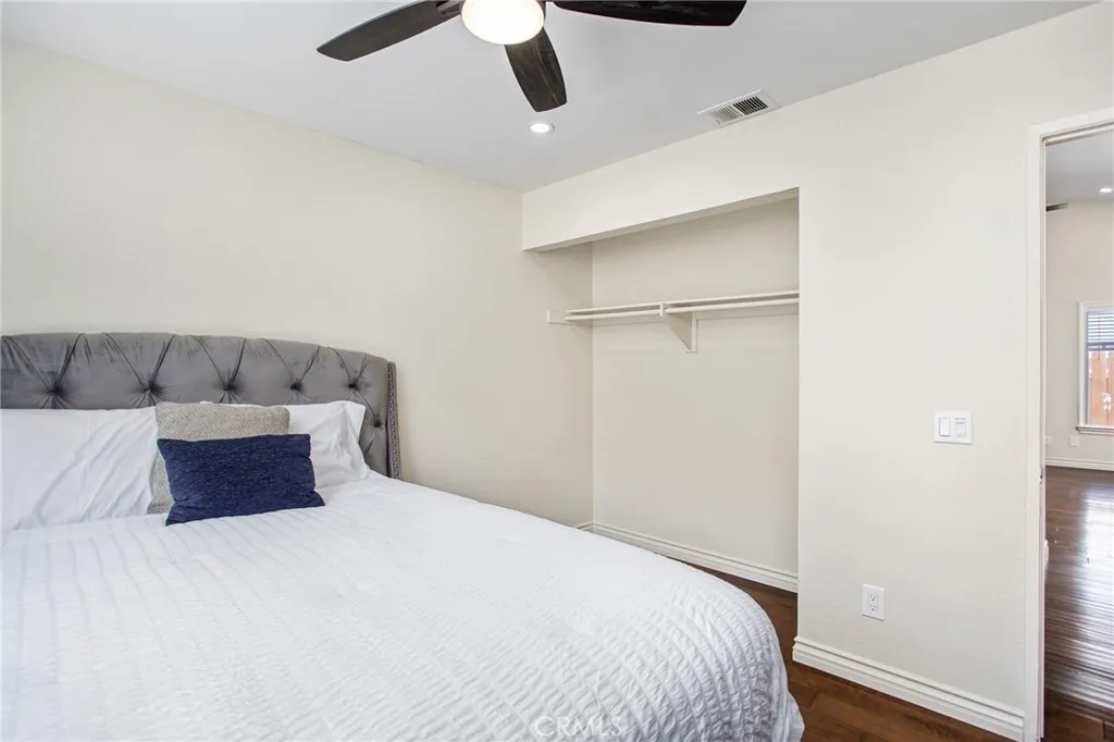 Welcome to this charming single-story TURNKEY MENIFEE home WITH NO HOA. FULLY FURNISHED and ready for its next chapter. From the moment you arrive, the beautifully landscaped front yard and fresh exterior paint create an inviting first impression. Step inside to discover a thoughtfully updated interior with hardwood floors throughout, an open living and dining area filled with natural light, and French doors that lead to the backyard. The kitchen features newly updated appliances, complemented by LED lighting and a whole-home window treatment design for privacy and style. Both bathrooms have been remodeled with modern touches including porcelain tile, new vanities and hardware. Complete with ceiling fans throughout for an added touch, keeping the home cool and inviting. A newer A/C condenser ensures energy efficiency, providing comfort year-round. Smart garage door opener with app-based control (Amazon compatible) and an exterior security camera over the garage for added convenience and peace of mind. The fully landscaped backyard with decorative hardscape and concrete slab accents is perfect for entertaining or quiet evenings at home, all set against the backdrop of Menifees surrounding hills. Conveniently located near shopping, dining, schools, and freeway access and the bonus of being sold fully furnished, this 2-bedroom, 2-bath residence is an incredible opportunity for a primary home, or investment property.