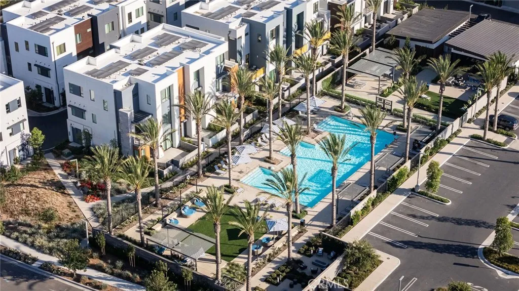 This newly built luxury townhome in The Landing at Tustin Legacy offers the perfect blend of modern sophistication and everyday convenience in one of Orange County's most desirable new communities. Completed in 2023, this light-filled contemporary home welcomes you with an open-concept layout featuring soaring 12-foot ceilings, imported Italian stone floors, and sleek matte black designer finishes that create an atmosphere of understated elegance. Enter the 3-story plan through the thoughtfully designed lower level that includes an ensuite bedroom (or optional office or fitness room) and direct access to the two-car garage. This space also opens directly to a sunny patio, bringing the outdoors in and making for a welcoming curb appeal. Large windows fill the second-level great room with natural light, creating an ideal environment for both entertaining guests and everyday relaxation. The living room flows seamlessly to a private balcony, extending your living area outdoors. The luxe chef's kitchen is finished with full-height maple cabinetry, a complete stainless steel JennAir/KitchenAid appliance suite, and a striking quartz island ready for casual bites and conversation. Upstairs, two generously sized bedrooms each provide ample accommodation with large windows and spacious closets. The primary suite serves as a true retreat, with two walk-in closets featuring professional organizers and a spa-like bathroom with double sink vanity and oversized shower. Modern convenience is built-in, with smart features including paid solar panels, an EV charger, Google Home smart system,