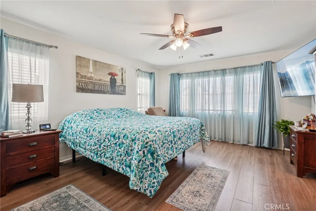 Charming 4-Bed, 3-Bath in Cul-de-Sac! Beautifully maintained home with high ceilings, vinyl flooring, and newer AC. The open kitchen features granite counters, an island, built-in range, stainless steel appliances, and a spacious pantry. The main level includes a bedroom and full bathroom. Upstairs, a loft offers versatile living space. The primary suite boasts a walk-in closet, dual sinks, soaking tub, and separate shower. Enjoy a low-maintenance yard with a covered patio and ceiling fans. Located in The Trails at Eastvale with low HOA. Buyer to assume solar agreement of $222/month.