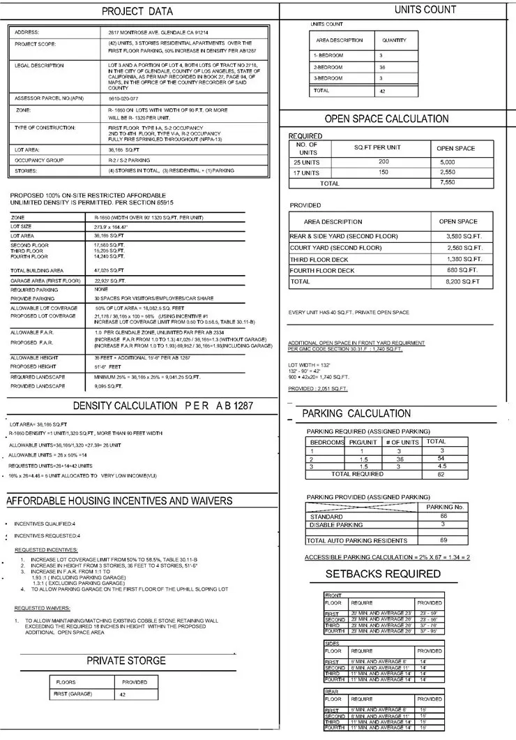 1. Property has several attached & Detached Structure that were used as Church for years which can be Renovated and used again. 2. Proposed as a Luxury 42 Units Apts. Bldg. + 3 ADUs for a total of 45 rental units Project. Total of 41K+/- Sq. ft. of Rental Space 3. In Process to be submitted to DRB for Design Approval. All City Dept Comments have been incorporated. BY Right Project using State of CA Density Bonus Program Incentives & Waivers. 4. Construction Cost Efficiency is incorporated into the overall design by experienced and seasoned Developer & Architect 5. Contact broker for Property OM.