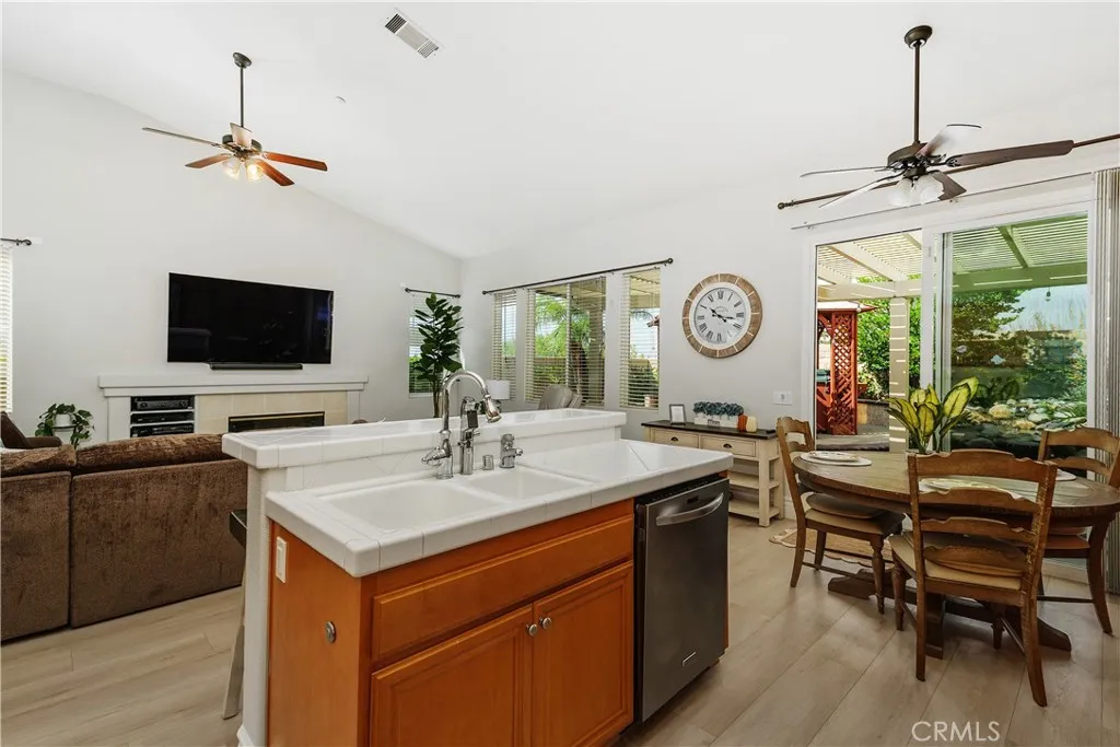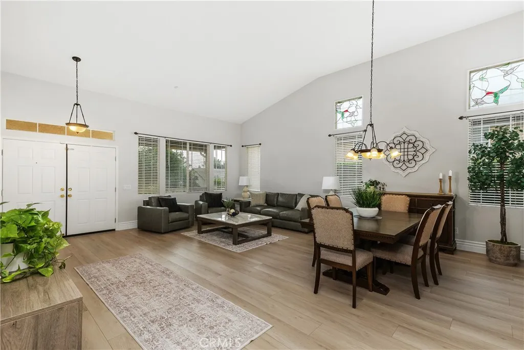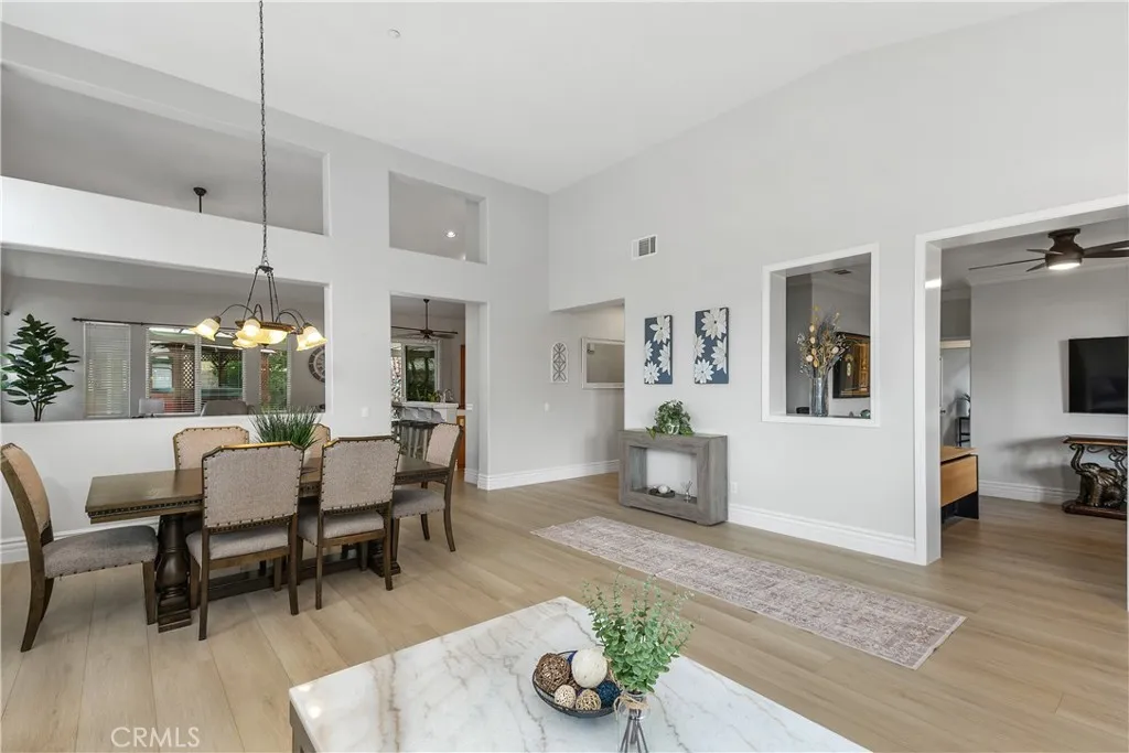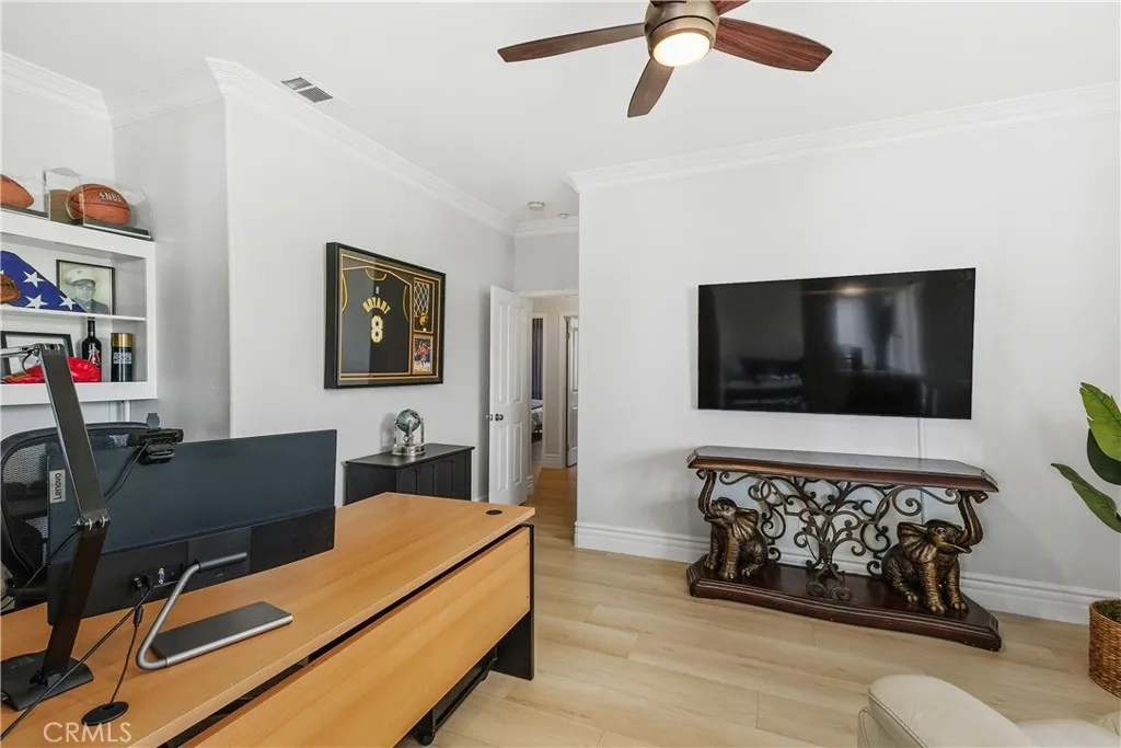 Welcome to the only single-story home currently available in the highly desirable Hunters Ridge, where breathtaking views of the mountains and city lights set the scene for elevated living. This turn-key residence greets you with an inviting front porch and elegant double door entry leading into a grand foyer. Inside, you'll find refined touches like crown molding, premium plank flooring, recessed lighting, and a formal living room that flows seamlessly into a dining area. The expansive open-concept layout showcases a versatile office/flex room. From prep to plating, this kitchen makes every step of cooking enjoyable, featuring a double oven, 5-burner stove, kitchen island with breakfast bar, all overlooking a cozy family room complete with a fireplace. The spacious owners suite offers a private retreat with direct access to the covered patio, a walk-in closet with built-in organizers, and a luxurious bathroom complete with a soaking tub, dual vanity sinks, and a walk-in shower. A separate laundry room adds convenience with abundant cabinetry and sink. Step outside to enjoy the above-ground gazebo spa, Aluma-wood patio cover, and beautifully landscaped yards with artificial grass and a tranquil koi pond with a soothing waterfall feature. With no neighbors behind, privacy and serenity are yours to enjoy. Modern upgrades include a 2024 electrical panel with a 50Amp EV car charger, a newer shed with workbench and shelving, a 7-year-old 5-ton A/C unit, and a finished garage with epoxy flooring. The wide driveway and gated RV access provide ample parking, while the quiet neighbo