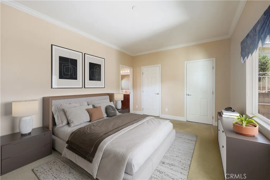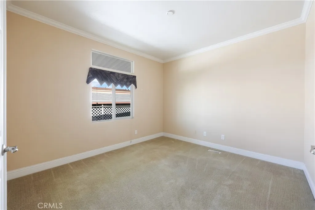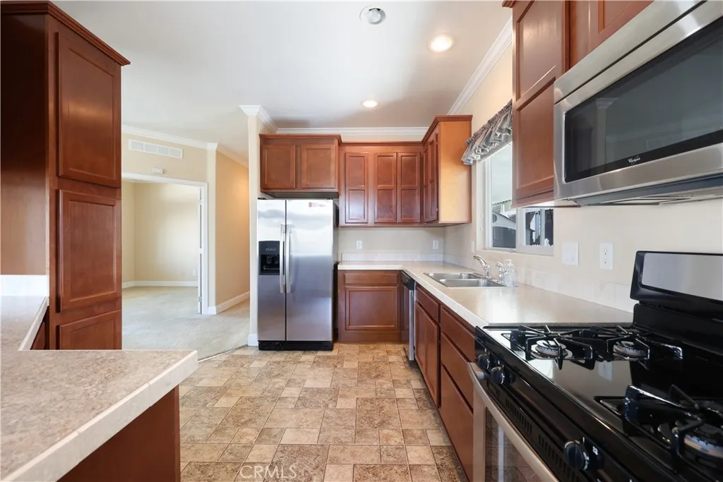 Whittier Downs is a 55+ gated community designed for residents who value connection, creativity, and comfort. The home is nestled on Cypress street and is a lovely 2 bedroom/2-bathroom home which also comes with a bonus room that can serve as an office, guest bedroom, meditative sanctuary or hobby/craft room. This mobile home is on a solid foundation and feels like a sturdy, traditional home with 9-foot, smooth ceilings, drywall textured walls, recessed lighting in the kitchen and ample storage throughout. The neutral palette of light tan showcases the architectural accents of gleaming white crown molding, 5-inch routed baseboards and mahogany colored cabinetry in the kitchen & bathroom. The paneled interior doors with lever hardware further enhances the feel of a higher-end traditional home and makes accessibility to rooms easier and more user friendly. Plush, low-cut camel colored wall to wall carpeting is soft and warm under foot and has never been stepped on by cat or dog paws. It has been freshly shampooed for you so please feel free to kick off your shoes! The kitchen is punctuated by satin finished stainless steel appliances with a black enamel & stainless 4-burner gas range and deep stainless-steel sinks with sprayer. The interior living area is flooded with natural light and multiple functional windows for cross breezes, and the primary bedroom has subdued lighting for better rest, sleep and relaxation. The ensuite primary bathroom is spacious, has a walk-in shower and ample storage for linens, towels and toiletries. A dedicated laundry room comes with a top-loadin