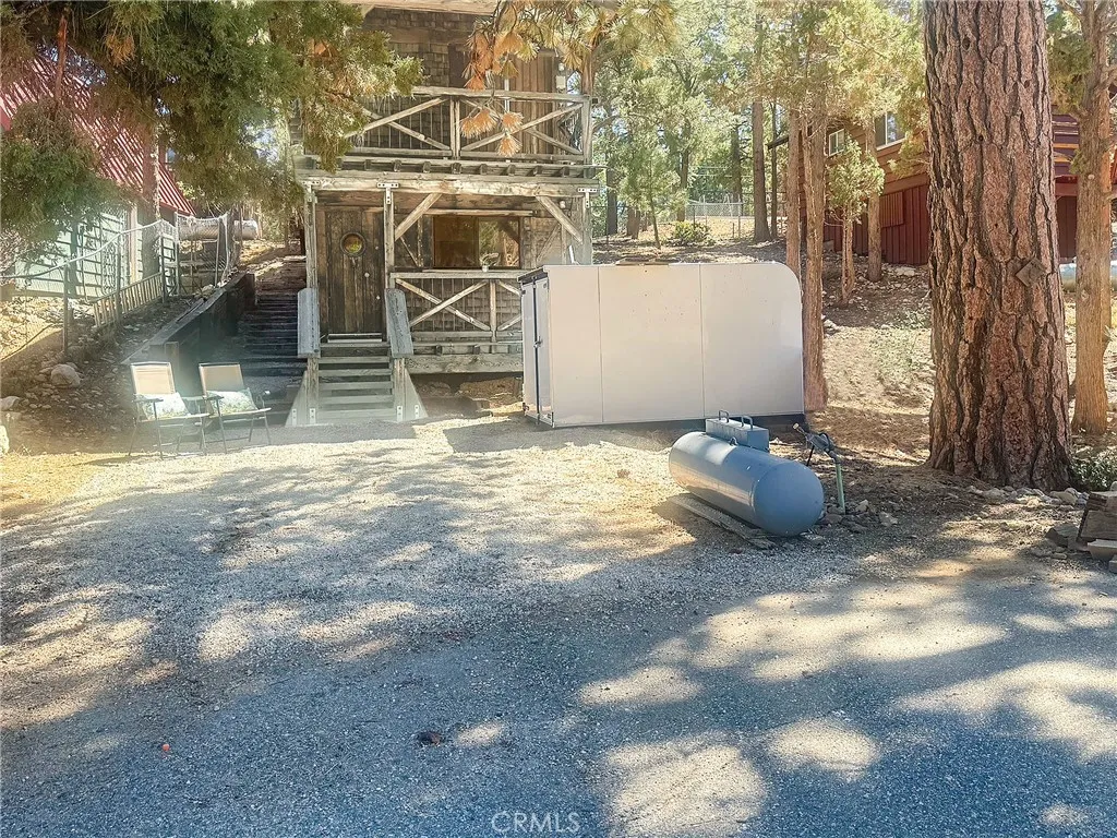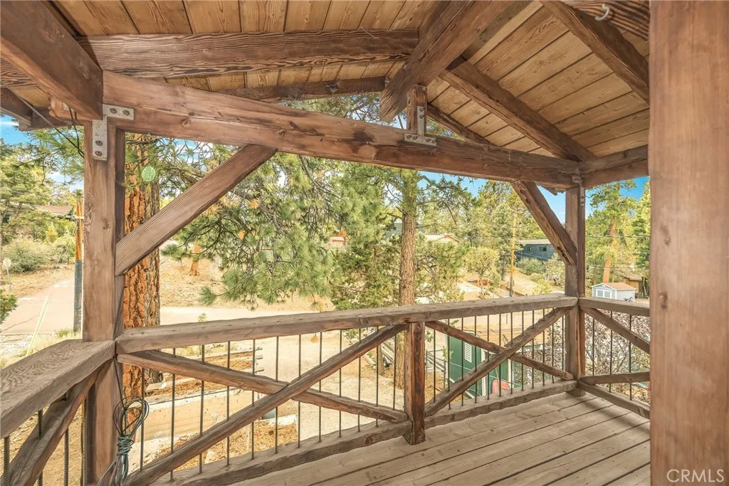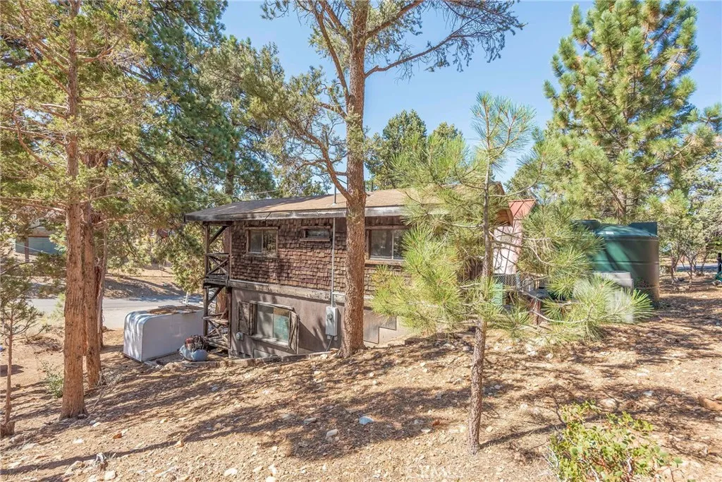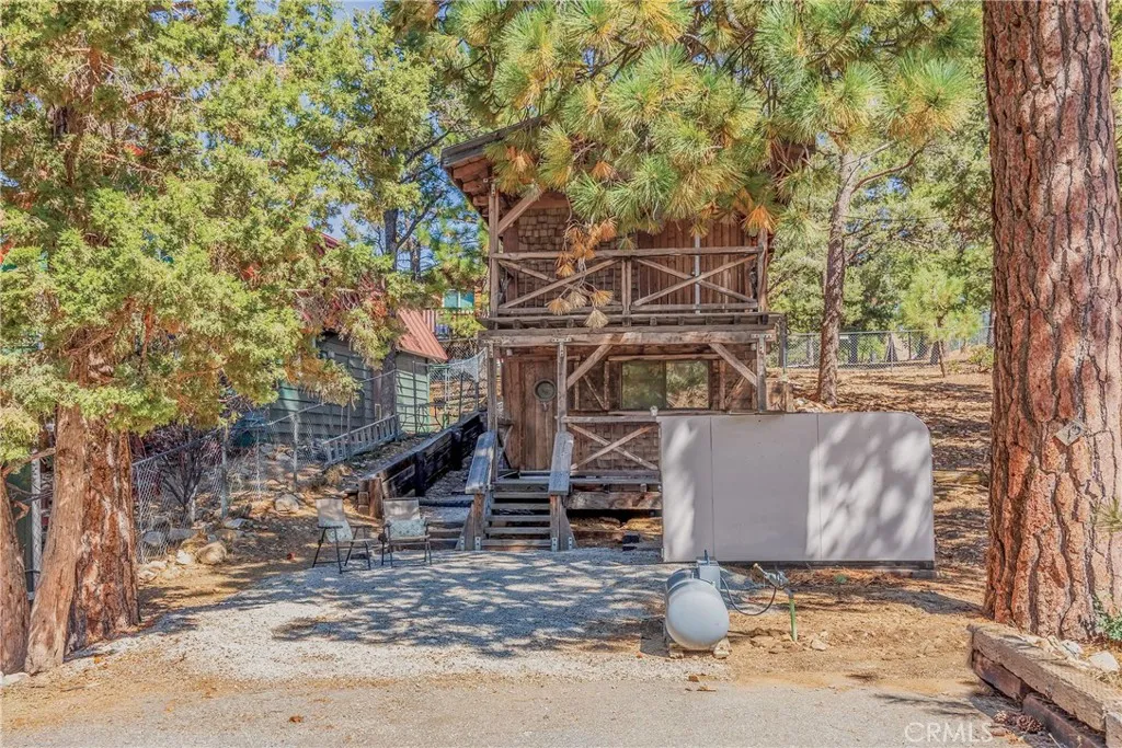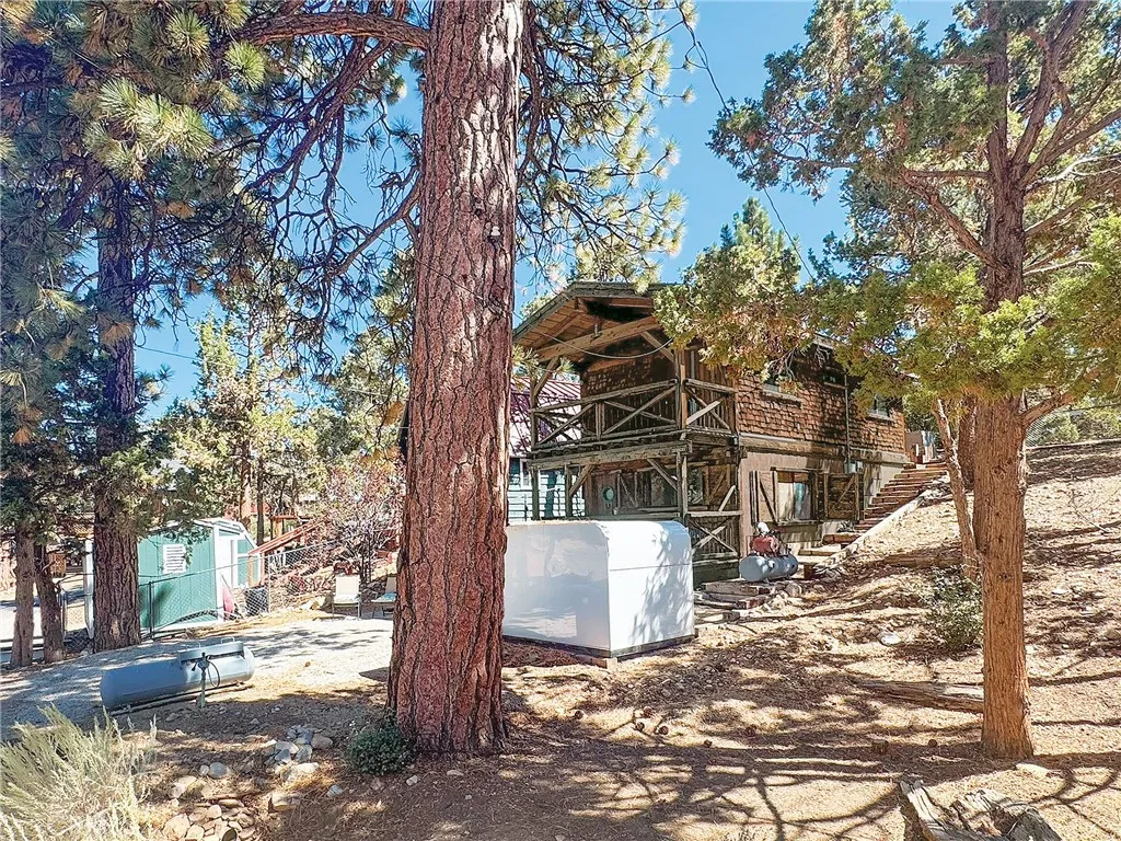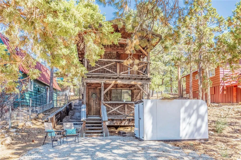 This 2-bedroom, 1-bath cabin on a 2,500 sq. ft. lot, nestled amid mountain beauty and mature trees, blends whimsical charm with enduring craftsmanshipoffering a wonderful opportunity for your next mountain retreat or investment. Built as the personal passion project of a contractor/carpenter known for the beauty of his spiral staircasesthis home showcases both craftsmanship and integrity. Amazingly thick wood doors pair with commercial-grade lock systems, industrial-style hardware, and a fire suppression system in the rear yard, underscoring a home built to last. Rustic wood and metal details highlight the cabins mountain character, with craftsmanship adding warmth and charm. Inside, each bedroom features open wood-beam ceilings, unique light fixtures, and well-sized closets, while the front bedroom opens to its own upper balcony overlooking the front yard. The 2nd bedrooms double doors provide access to the rear. This home is full of characterready and waiting for the next owners to add to its special nature with their own vision. A covered front porch frames the yard, and a free-standing locked storage unit offers space for tools, gear, and toys. Good, level parking adds convenience to mountain living, and the home itself is loaded with potential. Sugarloafs small-town charm is just minutes away with Kallans Bar & Grill, the local park, fire station, post office, and neighborhood market, while Big Bear Lake, ski resorts, and Big Bear's Village with its shops, restaurants, and year-round entertainment are just a short drive. A truly unique property ready for you to make it