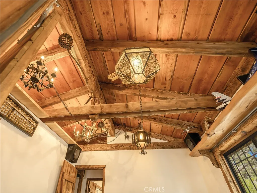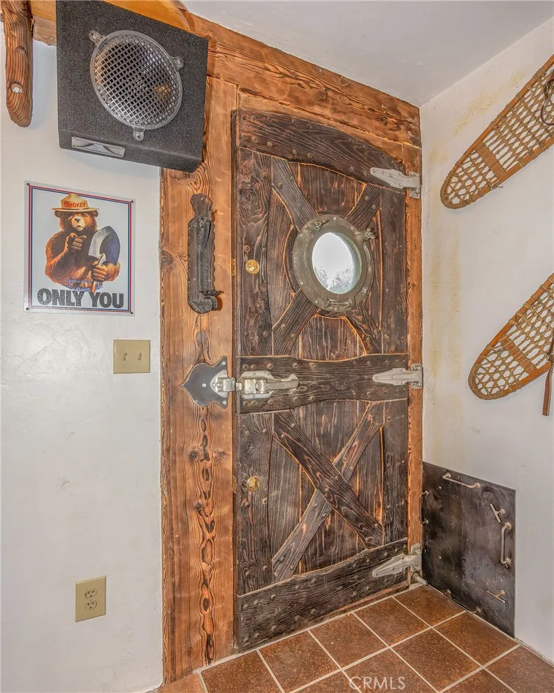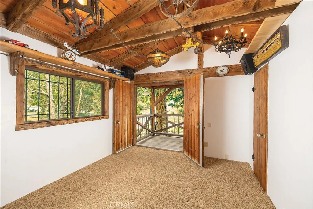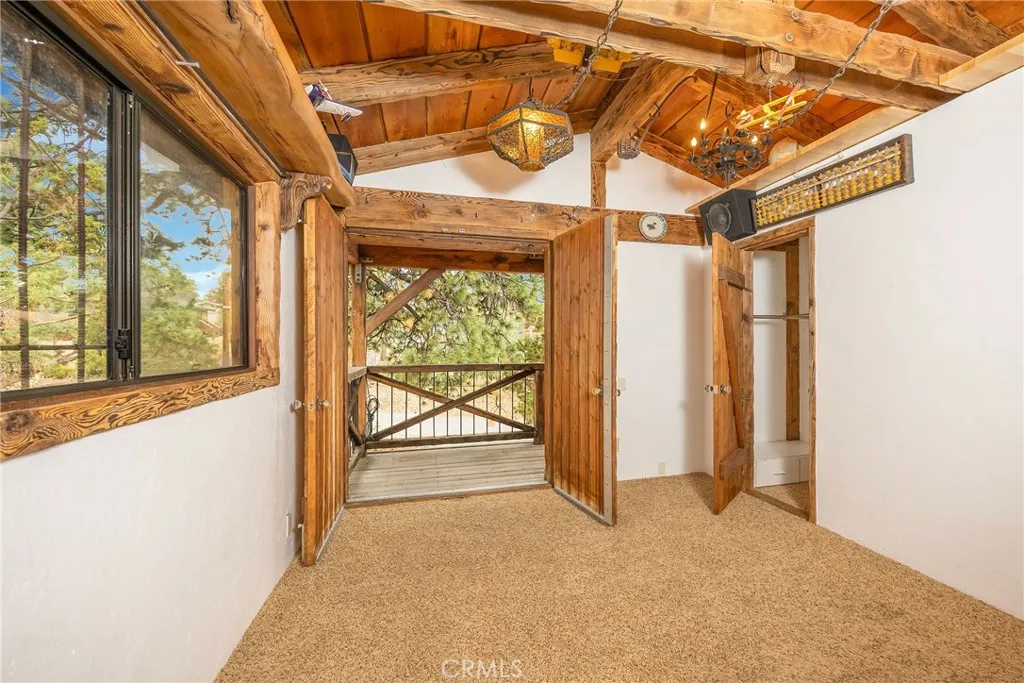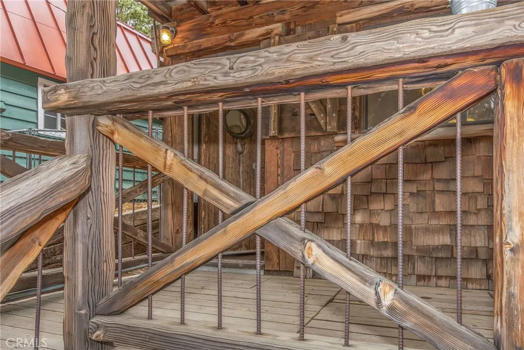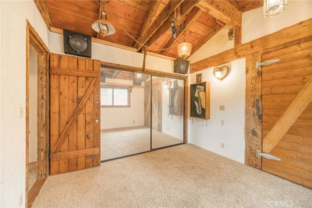 This 2-bedroom, 1-bath cabin on a 2,500 sq. ft. lot, nestled amid mountain beauty and mature trees, blends whimsical charm with enduring craftsmanshipoffering a wonderful opportunity for your next mountain retreat or investment. Built as the personal passion project of a contractor/carpenter known for the beauty of his spiral staircasesthis home showcases both craftsmanship and integrity. Amazingly thick wood doors pair with commercial-grade lock systems, industrial-style hardware, and a fire suppression system in the rear yard, underscoring a home built to last. Rustic wood and metal details highlight the cabins mountain character, with craftsmanship adding warmth and charm. Inside, each bedroom features open wood-beam ceilings, unique light fixtures, and well-sized closets, while the front bedroom opens to its own upper balcony overlooking the front yard. The 2nd bedrooms double doors provide access to the rear. This home is full of characterready and waiting for the next owners to add to its special nature with their own vision. A covered front porch frames the yard, and a free-standing locked storage unit offers space for tools, gear, and toys. Good, level parking adds convenience to mountain living, and the home itself is loaded with potential. Sugarloafs small-town charm is just minutes away with Kallans Bar & Grill, the local park, fire station, post office, and neighborhood market, while Big Bear Lake, ski resorts, and Big Bear's Village with its shops, restaurants, and year-round entertainment are just a short drive. A truly unique property ready for you to make it