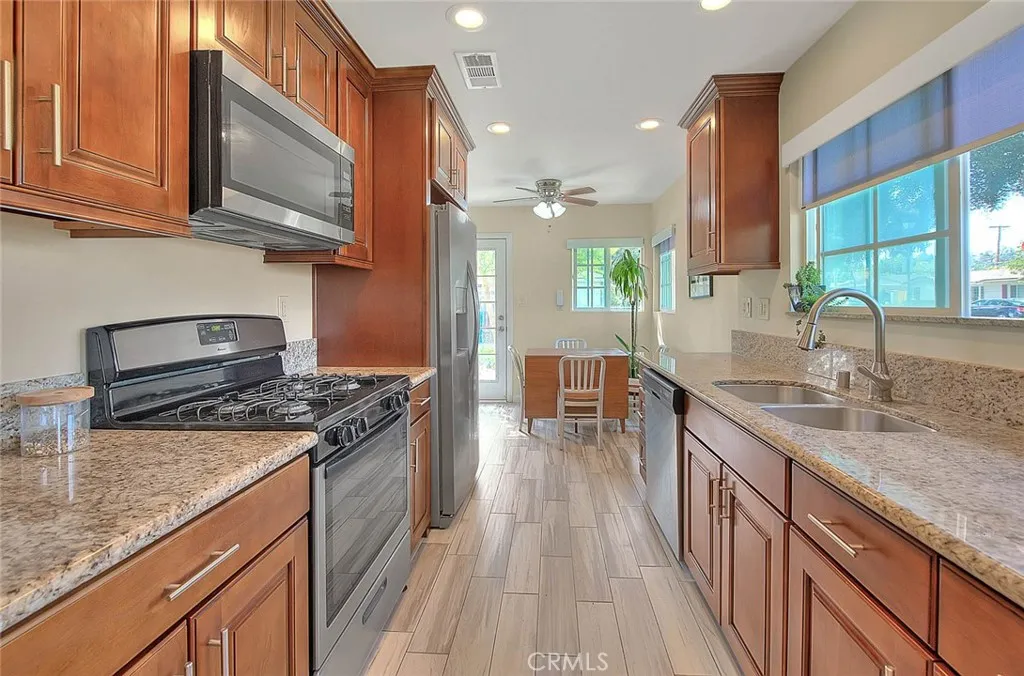Welcome to this Charming Riverside neighborhood of Ramona, where this gorgeous home awaits you! Once you turn onto Rockingham simply enjoy soaking in the serenity of aged trees on this delightful street. The peaceful atmosphere it is relaxing. This property sits in a wonderfully quiet family neighborhood, hidden off the main streets perfect for peaceful family bike rides and daily stroll. The property is captivating with its Mid-Century decor and with an abundance of natural sunlight. This beautifully single-story gem offering spacious layout featuring a large living room with the perfect blend of comfort, style, and convenience. There's plenty of space to relax or host friends and family. This absolutely gorgeous Dining area with natural light. Beautiful stainless steel appliances with stainless steel sink and alluring granite countertops in the kitchen. Stunning tile wood looking floors throughout the house, fresh interior Paint with recessed lighting in Kitchen/living/dining room. Beautiful carpet in the 3 bedrooms with 2 Lovely bathrooms. Enjoy cozy evenings by the cast iron wood burning fireplace, or stay cool year-round with the recently updated central air conditioning, plus ceiling fans in all 3 bedrooms. The third bedroom offers flexibility, ideal as a home office or guest room. You will appreciate the extraordinary amount of parking space this lot offers with a 2-car detached garage, along with a 3-car driveway or park your RV. The front yard is a perfect place with gorgeous evening sunsets to enjoy a mocktail after a long work day. Discover a ravishing large back