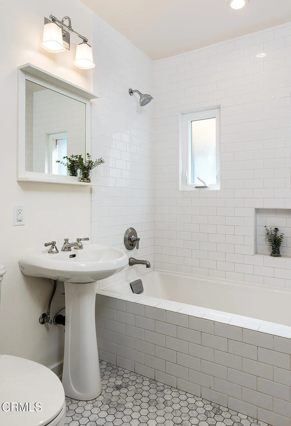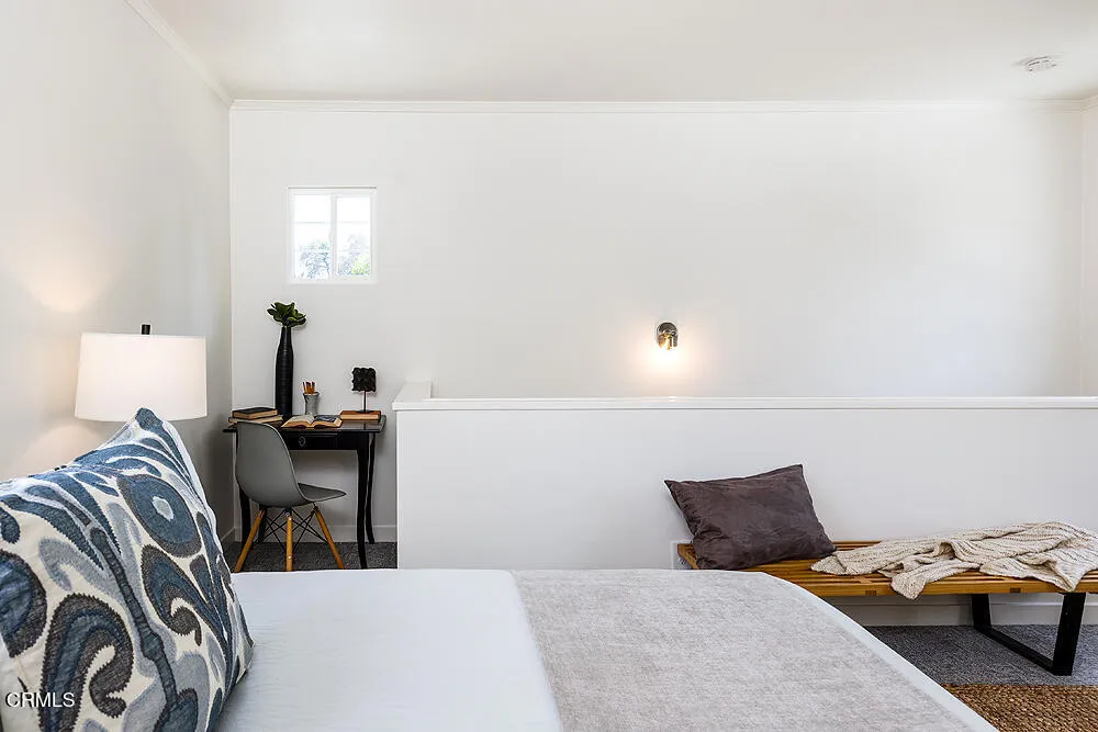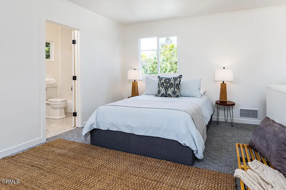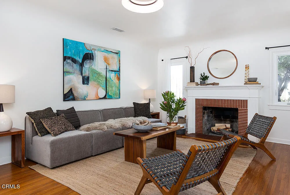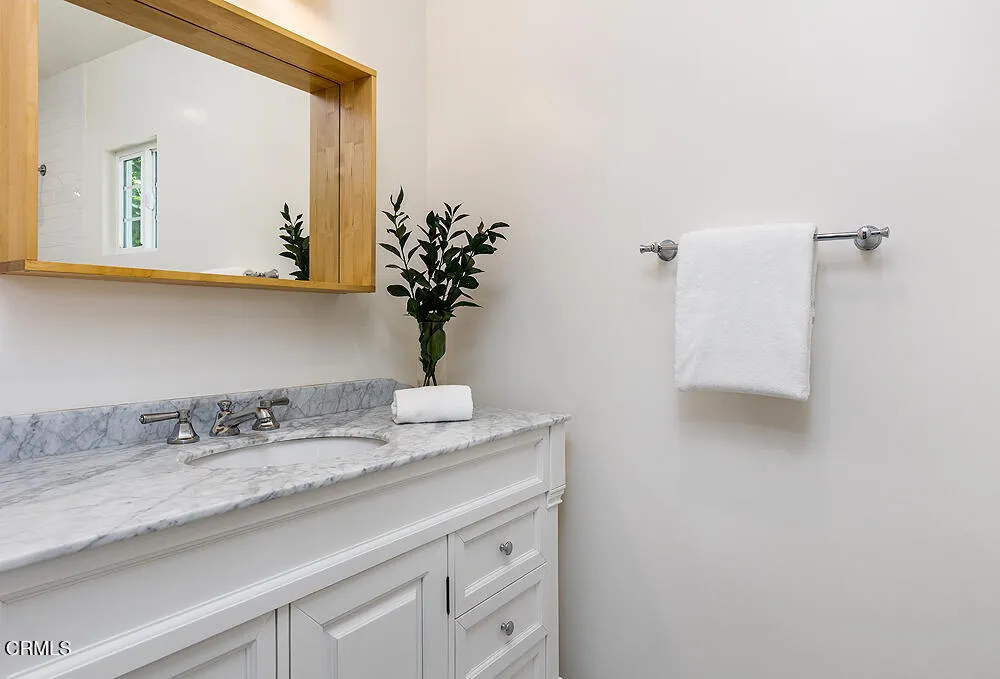 In tree-lined Northwest Pasadena, this stylishly updated home is a real estate unicorn: a light-filled Craftsman that feels both warm AND bright. Secluded behind oaks, agaves and a stately Mulberry tree, the artfully designed gardens here are both beautiful and sustainable with greywater irrigation. Follow flagstone steps on a permeable granite front path to find classic clapboard siding, elephantine column bases and solid 8-light front door with contemporary wood steps that marry modern organic stylings of the garden with the classic architectural elements of this special home. Inside, the front entry with its ribbon of double-hung sash windows and built-in window seat bench is inviting and practical for modern living. A generous living room, with coved ceilings, decorative stacked brick fireplace and dual-pane casement windows, also accomodates formal dining. The floorplan flows well here, with the sunny breakfast room and remodeled kitchen to the south, and private spaces to the north. Kitchen features marble subway tile backsplash, stone counters, stainless steel appliances and ample storage. A farmhouse sink with a leafy green view and Dutch door opening to the backyard dining deck make for happy everyday vibes. Bedrooms and baths are updated and relaxed, each bedroom enjoying its own bonus feature: access to the sunny north deck and garden; en-suite bath; or pretty views - the mountain vista from upstairs is great. The spacious primary suite with dual-sink marble vanity and rainhead shower is elegant and comfortable, but the spacious attached laundry may be the icing