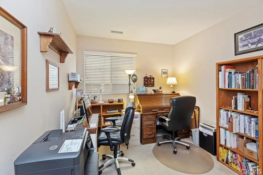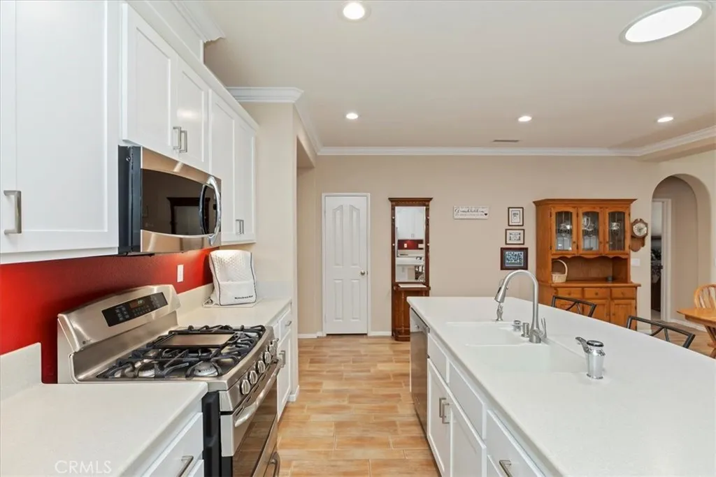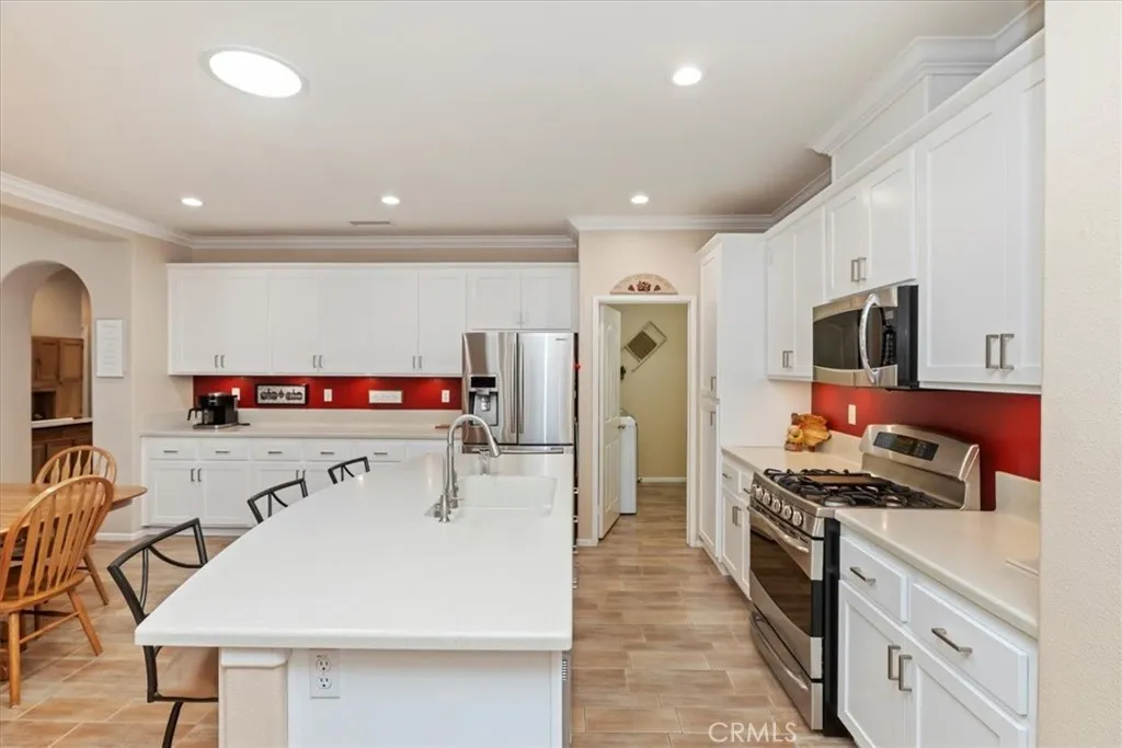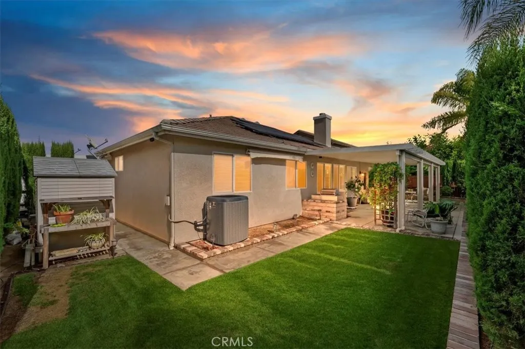 Welcome to this beautifully maintained single-story home in the highly desirable Vintage Reserve community. With exceptional curb appeal and an inviting entry, this 2,591 sq ft residence boasts 5 bedrooms, a 3-car garage, and a thoughtfully designed open floor plan that will immediately make you feel at home. The property also features a large side yard with space to accommodate a small trailer, additional vehicles, or room to enjoy your hobbiesan opportunity that is rare to find. At the heart of the home is the renovated kitchen, featuring crisp white cabinetry with pull-out shelves and soft-close drawers, stainless steel appliances including a 5-burner stove, and a spacious island ideal for meal prep, casual dining, or entertaining. The stainless steel refrigerator is included, making this kitchen truly move-in ready. Plantation shutters, ceiling fans & crown molding add elegance and comfort, while the expansive family room flows seamlessly from the kitchen, creating a warm and inviting space for everyday living. The spacious primary suite is a private retreat with a large walk-in closet and a well-appointed bathroom, while four additional bedrooms offer versatility for family, guests, or a home office. Modern updates include a replaced AC unit and furnace, an advanced built-in HEPA filter system, and 18-panel owned solar for energy savings (no lease). The built-in washer and dryer also remain with the home, adding everyday convenience. Step outside and enjoy a backyard designed for relaxation and entertainment. Extensive hardscape and two Alumawood patio coversone at the