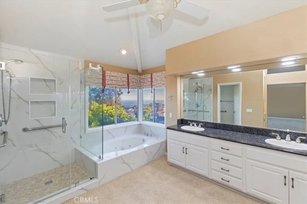 Welcome to the largest floor plan currently available in the prestigious Belmont Estates a breathtaking 3,600 sq ft residence that combines luxury, comfort, and panoramic 180-degree views. Perched in one of the most desirable locations, this home offers sweeping vistasenjoy views to the ocean on a clear day from multiple rooms and outdoor spaces. This beautifully designed home features 4 spacious bedrooms, including a downstairs guest suite with a private en suite bathroom, and 3.5 bathrooms in total. The humongous bonus room offers endless possibilitiesperfect for a home theater, game room, or executive office or one can use it as the fifth bedroom as it has a walk in closet. Step inside to an open-concept floor plan with soaring ceilings, a formal dining area framed by views, and a spacious family room complete with a cozy fireplace and a custom wet barideal for entertaining. The home is filled with natural light, thanks to expansive windows fitted with elegant shutters and roll-up blinds. The chefs kitchen is a dream, featuring granite countertops, a center island, double ovens, a walk-in pantry, and picture-perfect views from the kitchen windows. A large, separate laundry room adds convenience and function. Upstairs, retreat to the luxurious primary suite, complete with its own fireplace, an oversized walk-in closet, dual vanities, a soaking tub, and serene privacy. Outdoor living is just as impressive with a covered patio, private gated entrance, and a charming water fountain in the front yardcreating a serene and secure setting to call home. Dont miss your chance to