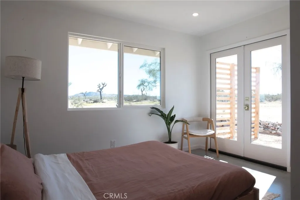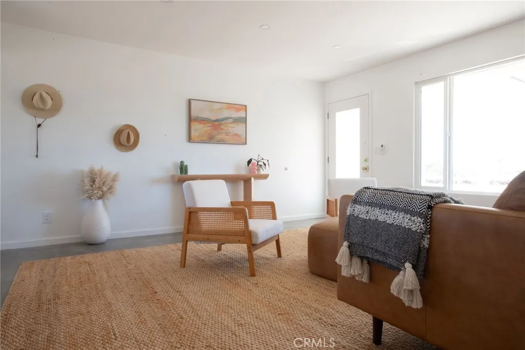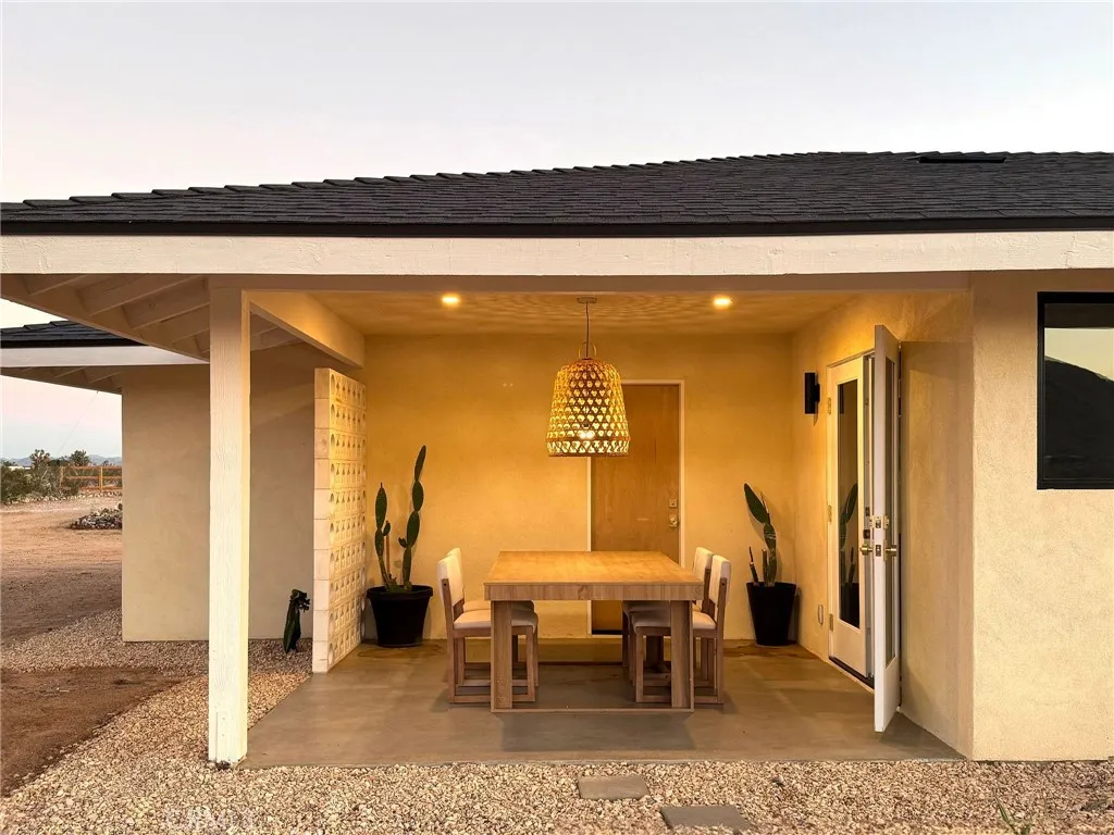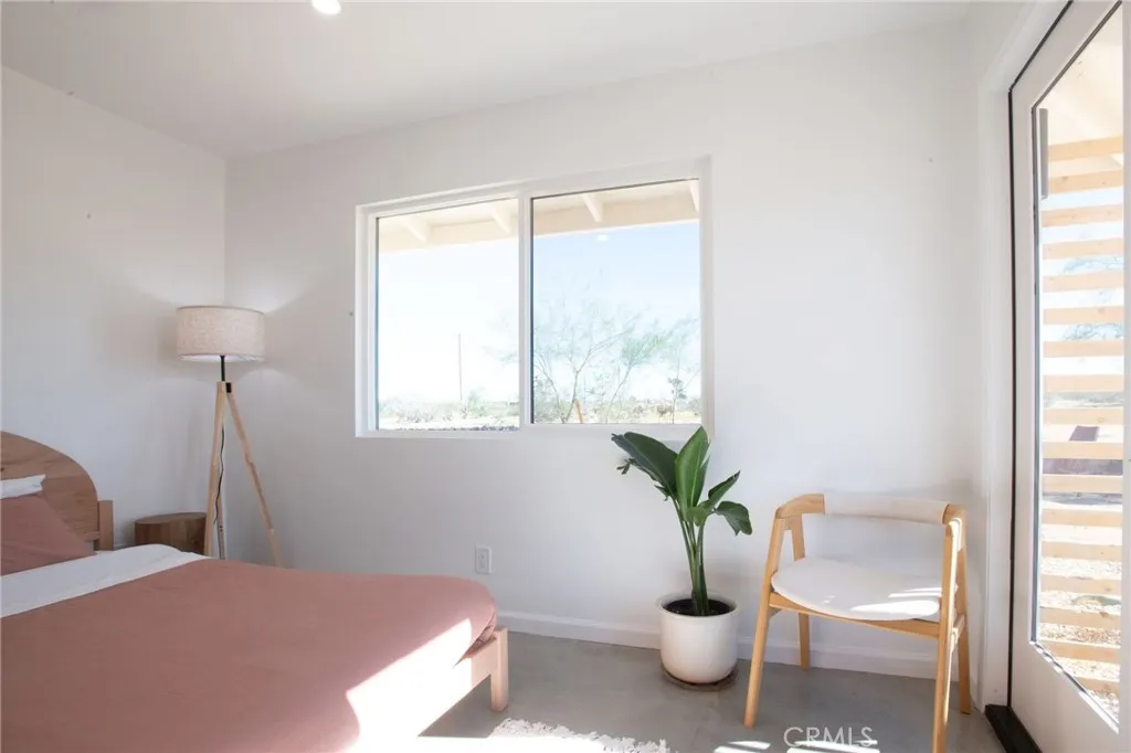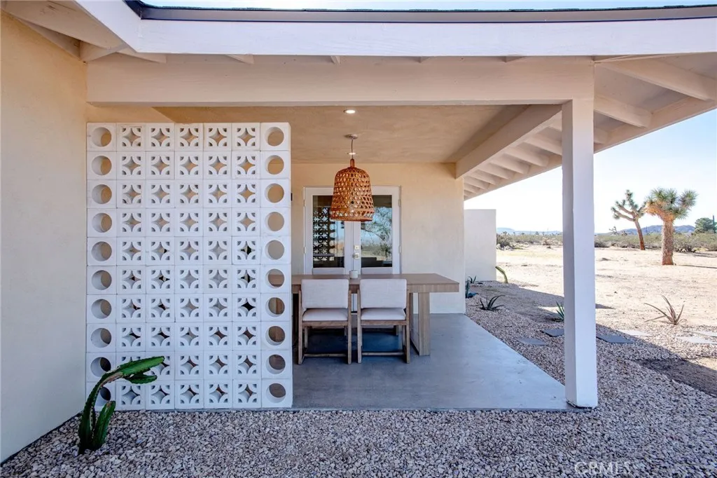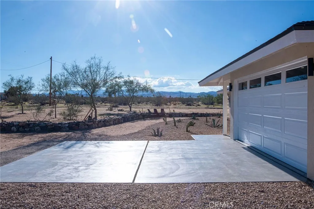 Welcome to 59676 Mitch Rd, where Bohemian Flair meets Desert Elegance. This gorgeous turn-key property has been completely remodeled with every feature intentionally chosen to bring you the perfect airbnb, desert home or weekend retreat. This house showcases 3 bedrooms, 2 bathrooms and 5 ACRES OF LAND with stunning panoramic desert & mountain views. Inside you'll find sleek concrete floors, tasteful decor & furnishings, rounded archways, recessed lighting and large windows that let in an abundance of natural light. The warm and welcoming living room flows effortlessly into the awe-inspiring kitchen and dining area complete with designer-style tile backsplash, bright quartz countertops, beautiful modern cabinetry, high-end FORNO appliances and bar seating. Each bedroom is well appointed with mini-splits for year-round comfortability, closets with custom built-in shelving and 2 of the 3 bedrooms adorn french doors that lead to their own private outdoor patios. Both bathrooms boast spa-like showers with sophisticated tile, glass panels and lovely new vanities with clean, modern finishes. The finished garage has been transformed into the ultimate hangout space equipped with a bar, wine fridge, sink, additional cabinetry, a mini-split and a cozy elevated lounge area (there is even a stacked washer/dryer for added functionality). It doesn't stop there; the serene outdoor living space includes a lovely covered patio for outdoor dining, an outdoor shower with a rainfall shower-head, ample space to entertain or relax around a firepit on a starlit summer night. Not to mention, there