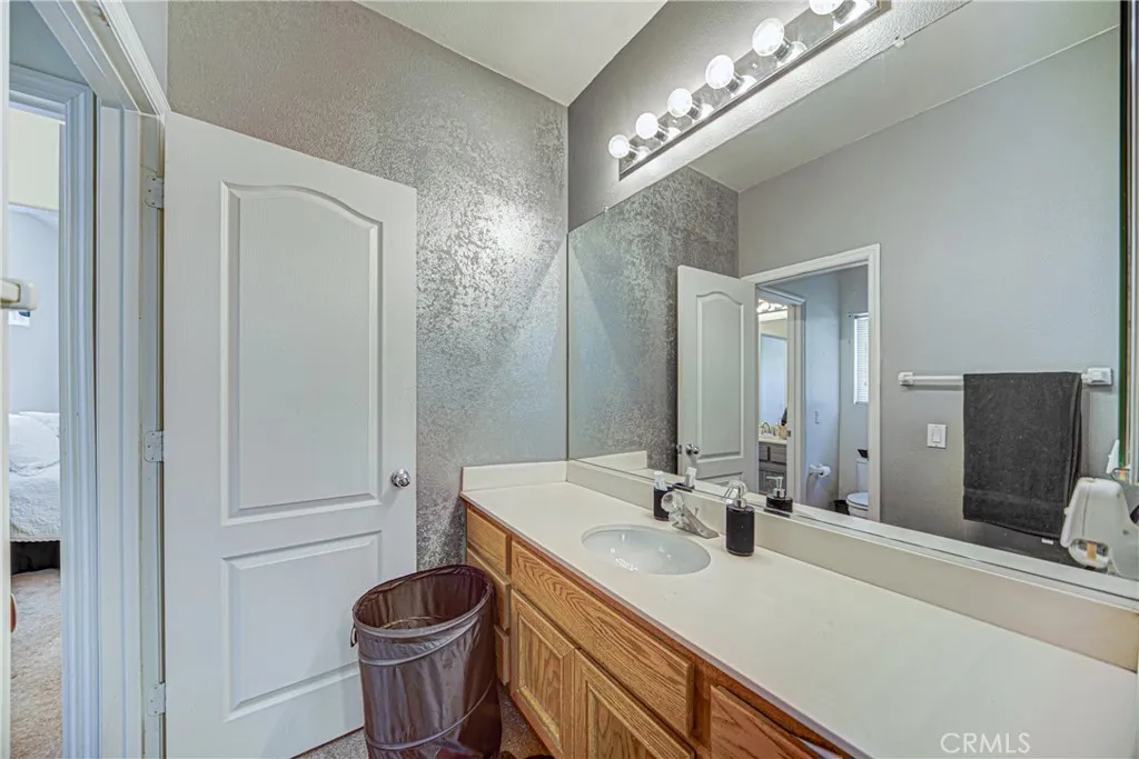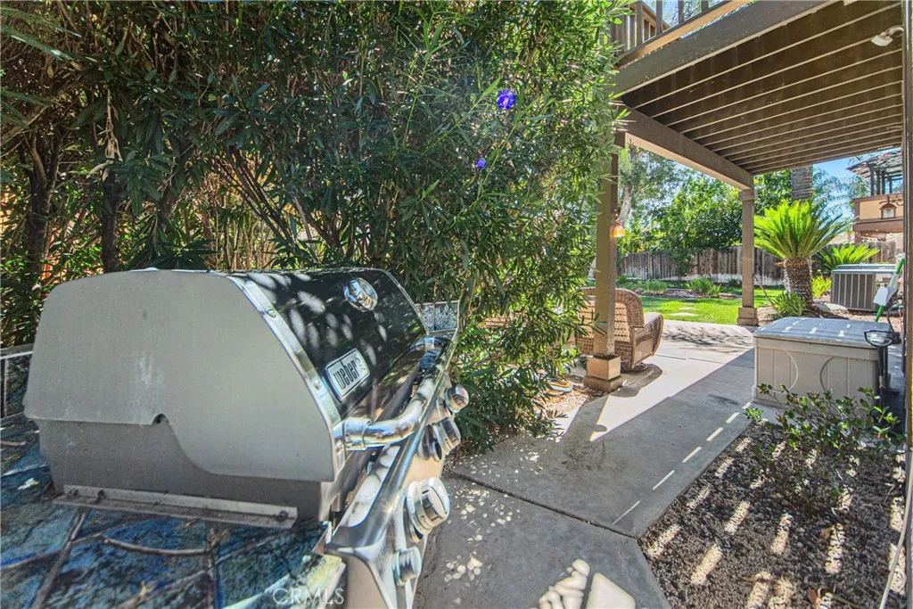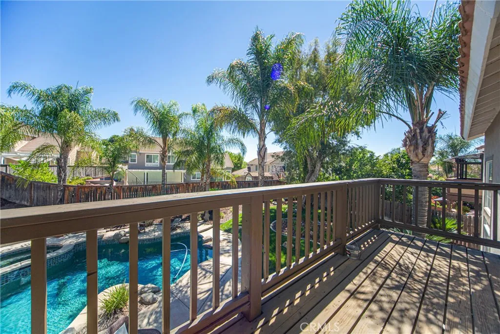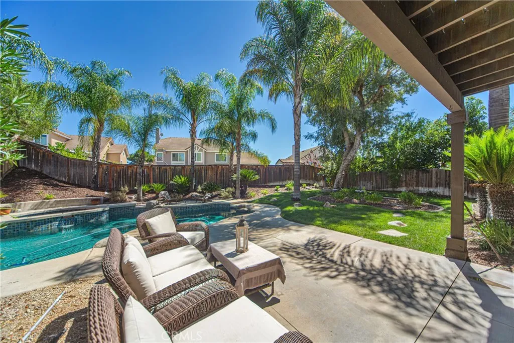 Rare opportunity to own a pool home with a lush, tropical yard as well as low taxes and no HOA and a three car garage conveniently located in Central Murrieta. This 4 bedroom, 3 bathroom beauty showcases soaring 20 foot ceilings when you enter through the double French doors and a sweeping staircase, picture windows with tons of natural light and views to the pool. The remodelled kitchen has granite counters and stainless steel appliances as well as a dining area with new light fixture. This opens to the spacious family room featuring a fireplace and custom built-in. The slider opens to the covered patio with an outdoor kitchen and the heated pool and spa with natural rock features as well as lawns with mature plantings and shade trees and palms. There is a main floor bedroom, currently set up as an office, and full bathroom with walk in shower. The living and dining room combo has lots windows for light and a fireplace. The dramatic double door entry to the the master bedroom with a tray ceiling and a french door to the balcony features a custom tiled bathroom and 3 closets. The spacious second level also 2 large bedrooms which share a Jack and Jill bathroom though each has their own private vanity area. Located between the 15 and 215 freeways, just off Clinton Keith, for easy freeway access and well as clsoe to shopping and schools with super low taxes.