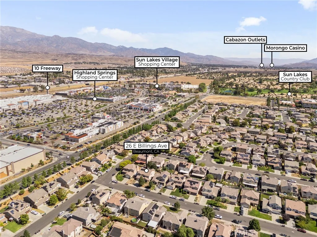 Welcome to 26 Billings Ave in the growing city of Beaumont! This beautiful 4-bedroom, 3-bathroom home offers a spacious open floor plan designed for comfort and functionality. Step inside and be greeted by soaring high ceilings in the living and dining areas, filling the home with an abundance of natural light. The main level features a convenient downstairs bedroom and full bathroom, perfect for guests or multi-generational living. The family room flows seamlessly into the dining and living spaces, creating the ideal setup for gatherings. Upstairs, the primary suite offers a private retreat with a large walk-in closet, soaking tub, separate shower, and dual sinks. Two additional bedrooms are generously sized, along with a full bathroom and a laundry room for added convenience. The backyard is ready to enjoy with shade trees, a wood deck, and a covered patio perfect for relaxing or entertaining. The front entry also offers a welcoming covered porch area. The location, truly cant be beat! Youll be close to schools, shopping, dining, and entertainment, including nearby parks, walking trails, Cabazon Outlets, and Morongo Casino. Easy freeway access makes this a commuter-friendly choice. Dont miss the opportunity to make this beautiful Beaumont home yours!