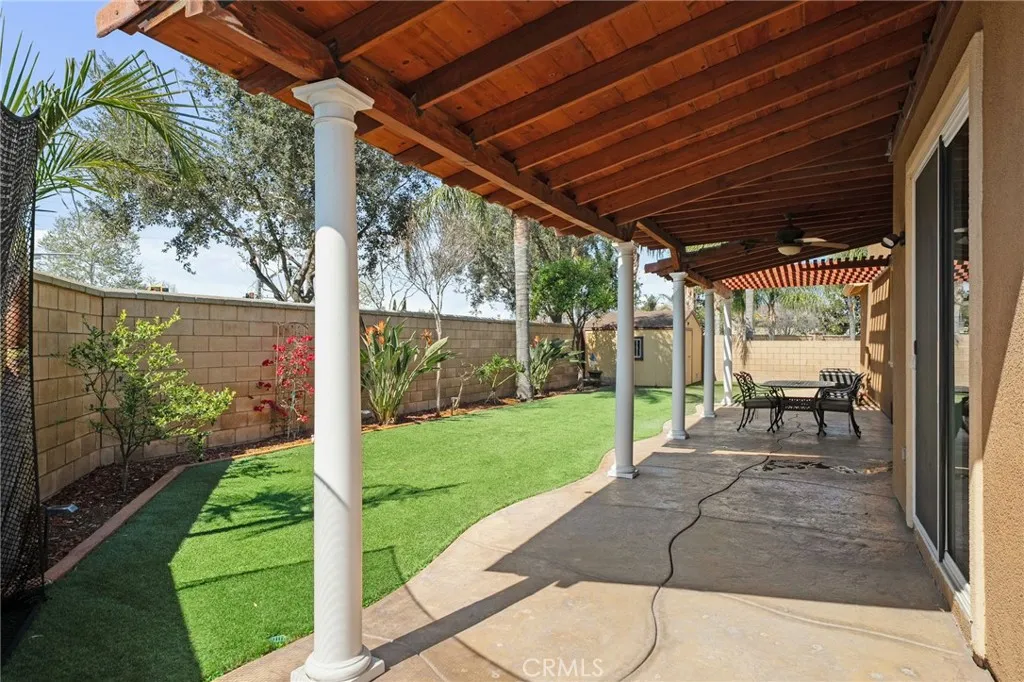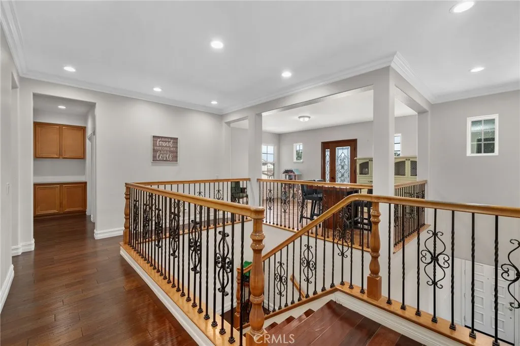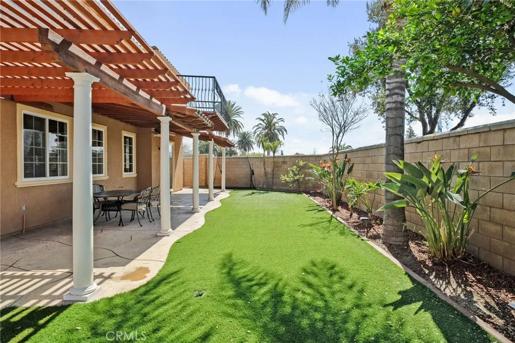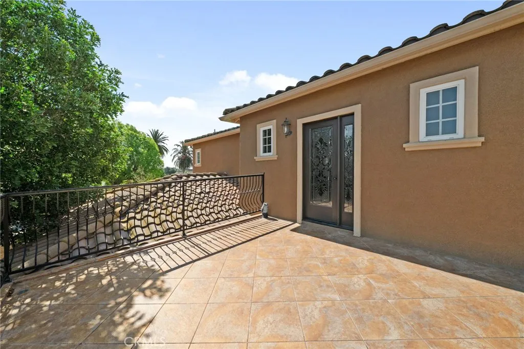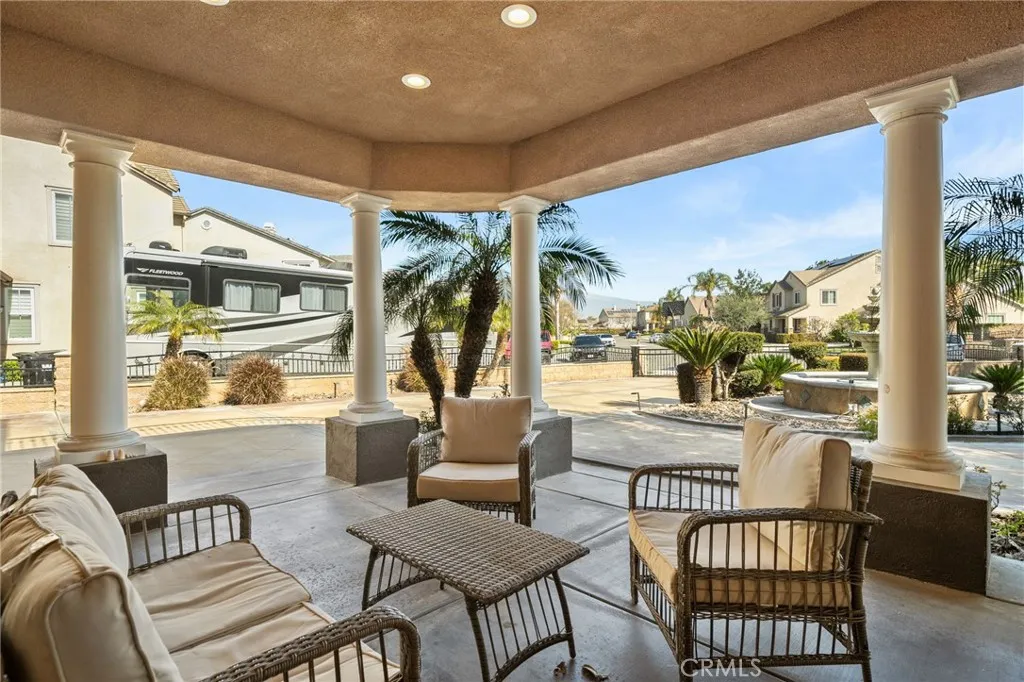 Welcome to this stunning, turnkey, one of a kind home located in the highly sought-after River Glen community of Eastvale. Situated on a spacious 13,068 sq. ft. lot at the end of a peaceful cul-de-sac, this well-maintained residence offers a blend of elegance, comfort, and practicality. With 5 bedrooms, a loft, and 4.5 bathrooms, this home is designed for family living and entertaining. The grand entrance features a circular driveway with a beautiful fountain, providing additional parking for over 8 cars alongside the 4-car garage, totaling over 12 parking spaces! The front yard is beautifully landscaped and securely gated with a combination of block and wrought iron fencing, creating a private oasis with stylish light fixtures and an automatic gate for added security. Relax and enjoy breathtaking views of the city lights and surrounding hills from the custom, oversized balcony and patio, perfect for outdoor gatherings. The backyard is designed for easy maintenance, featuring artificial grass, and offers ample space to build a pool, allowing you to customize your outdoor retreat. Inside, you'll find real wood flooring throughout, complemented by crown molding and plantation shutters on every window. The open-concept living areas are ideal for entertaining, while the spacious primary suite offers a relaxing sanctuary with a cozy sitting area, private balcony, a soaking tub and separate shower, and 2 separate, generous walk-in closets. The downstairs suite has its own en suite bathroom, separate from the guest bathroom. Additional highlights include a convenient upstairs laun