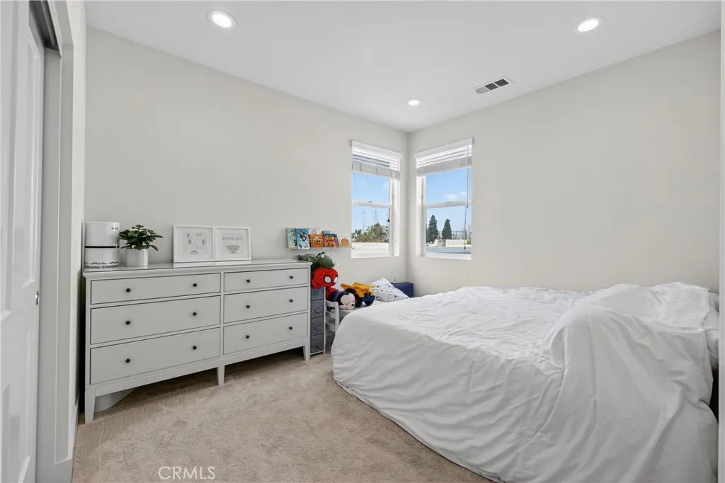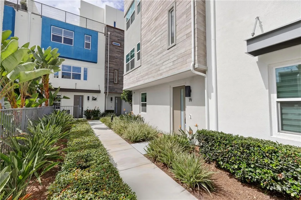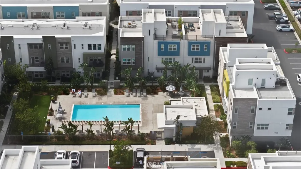 Perched in Anaheims Platinum Triangle with premium pool views, this 2021-built end-unit home features 4 bedrooms, 3.5 bathrooms, and 2,160 sqft of bright, thoughtfully designed living space. From the rooftop deck to the gourmet kitchen, every detail has been crafted for modern comfort, entertaining, and effortless living. The entry level features a private bedroom with a full ensuite bath, ideal for guests or multigenerational living. The second floor is the heart of the home, where an expansive great room is bathed in natural light from walls of windows and soaring ceilings accentuated by recessed lighting. The gourmet kitchen is a chefs dream, with ceiling-height shaker cabinetry, a waterfall-edge quartz island with bar seating, quartz backsplash, ceramic farmhouse sink, and a spacious pantry. A bright breakfast nook, powder room, and indoor laundry closet complete this level. Upstairs, the primary suite is a serene retreat, featuring dual sinks, upgraded porcelain tile flooring, a subway-tiled shower, and a large walk-in closet. Two additional well-sized bedrooms share a beautifully appointed hallway bath. The fourth-floor rooftop deck is the ultimate entertainers dream - perfect for hosting friends, relaxing with family, or enjoying panoramic city views and Disneyland fireworks. Thoughtful upgrades elevate every level of the home, including LVP flooring on the main floor, roller blinds throughout, solar-ready rooftop, a water filtration/softening system in the kitchen, and strategically placed outlets for wall-mounted devices. A 2-car garage with EV charging and side st
