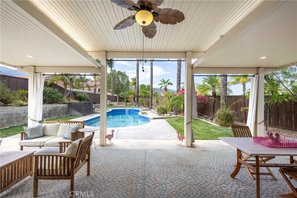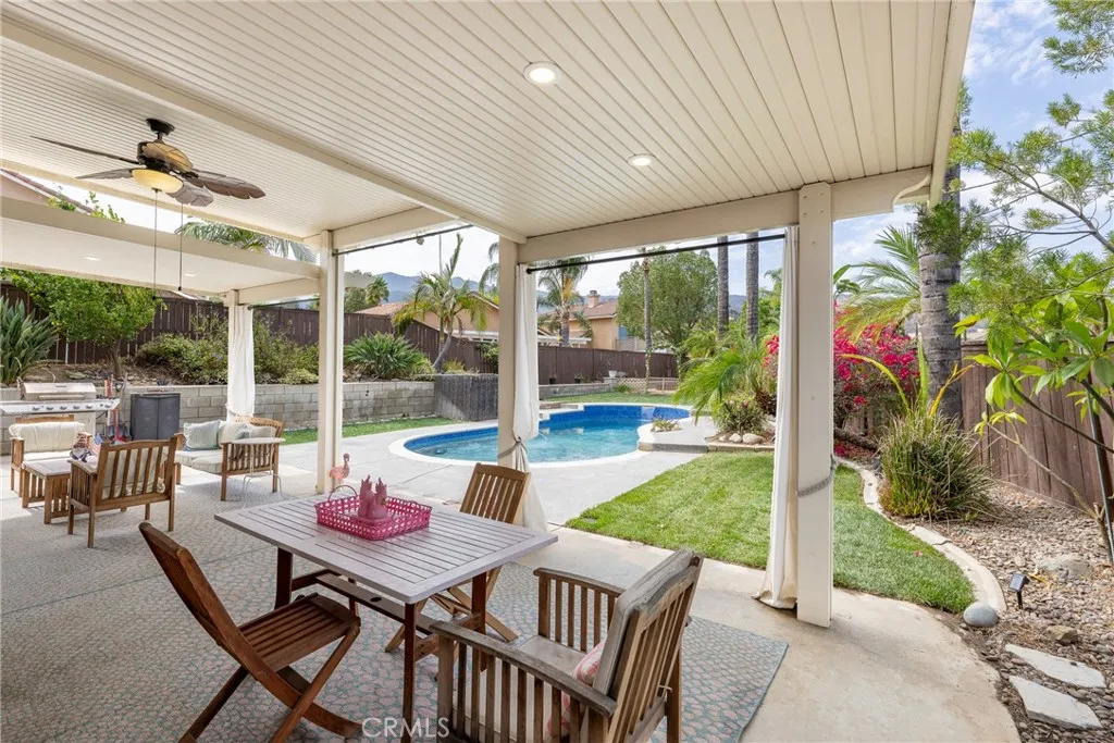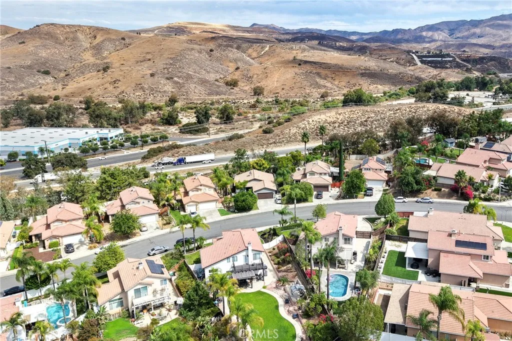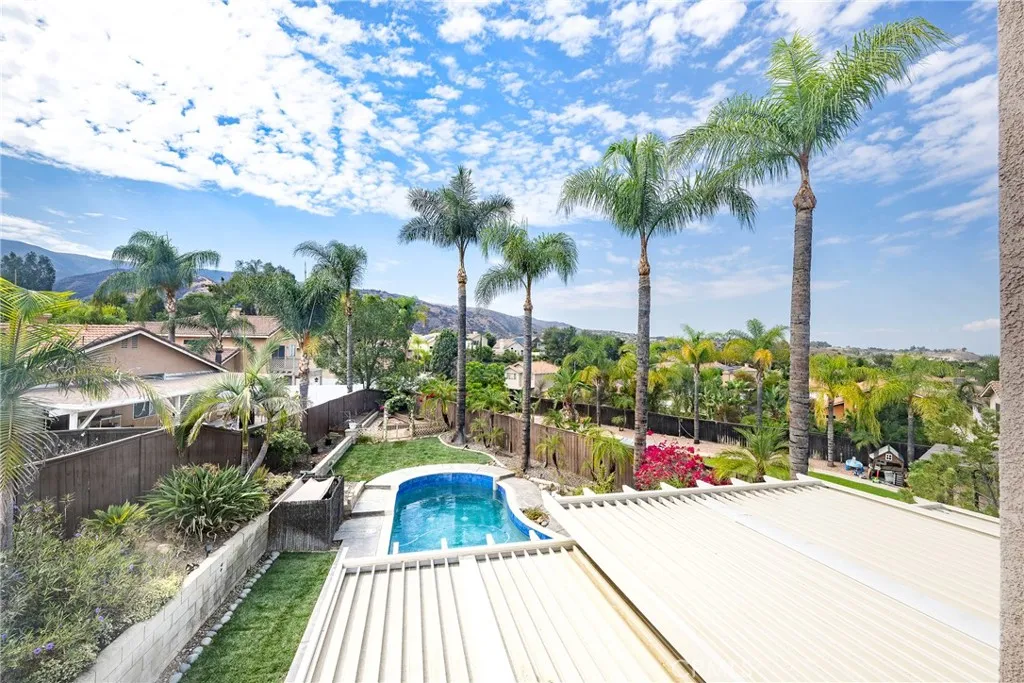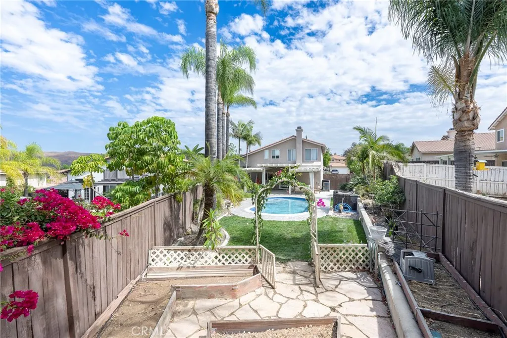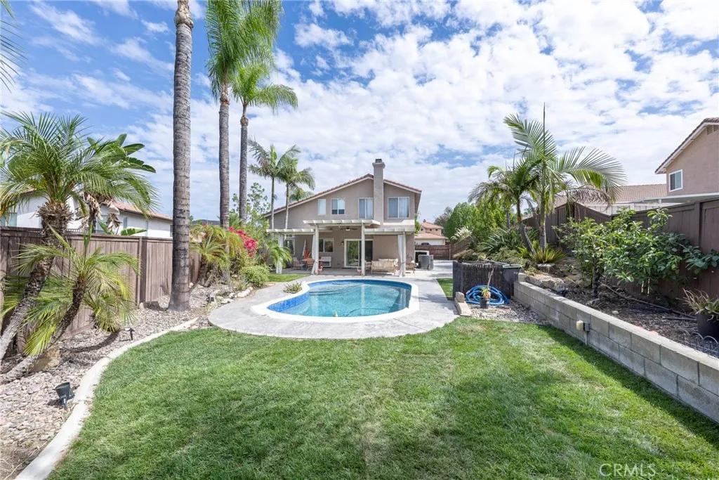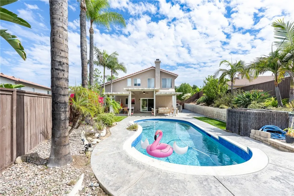 Your backyard retreat awaits! This unique pool home sits on one of the largest lots in the highly desired Wildrose Ranch community of Corona, where you have views of the Cleveland National Forest as a scenic backdrop. Featuring 4 bedrooms and 3 bathrooms (including a downstairs bedroom and bath)...its designed for both comfort and flexibility. Inside, youll find vaulted ceilings, laminate wood-like flooring in the formal living and dining areas, and a bright kitchen with granite countertops, abundant cabinetry, and a beadboard-accented island that opens seamlessly to the family room. Step outside to a backyard built for entertaining and everyday enjoyment. Take a dip in the sparkling pool, relax under the custom-built veranda, smell the summer barbecues, and enjoy the spacious grounds with garden space, RV parking, storage shed, and a variety of fruit and nut trees (lemon, lime, olive, almond, and dwarf apple) plus the incredible fragrance of the plumerias. Updates include HVAC, sliding glass doors, LED recessed lighting and complete home repiping for added peace of mind. With a 3-car garage, low HOA, low taxes, and top-rated schools nearby, this home is an incredible find. Conveniently close to Dos Lagos shopping, dining, entertainment, and local parks...there is no doubt you'll enjoy this home and make years of cherished memories here.
