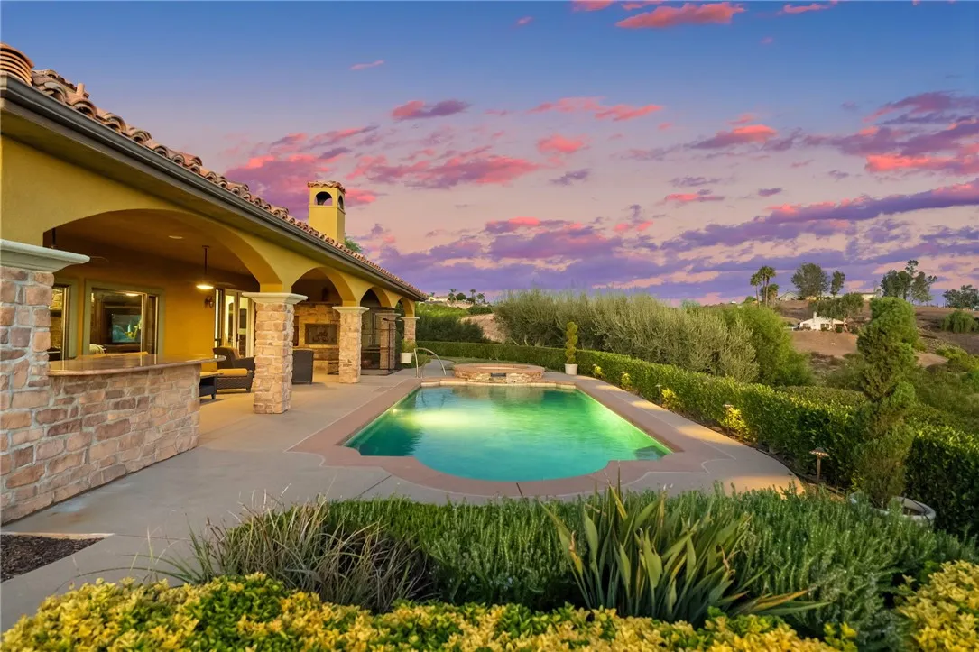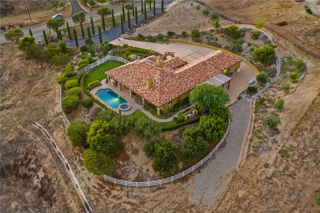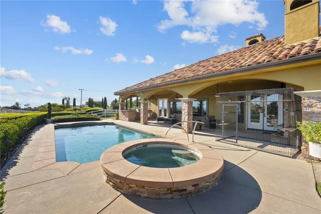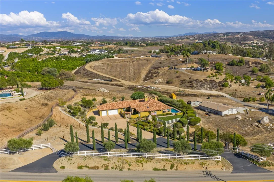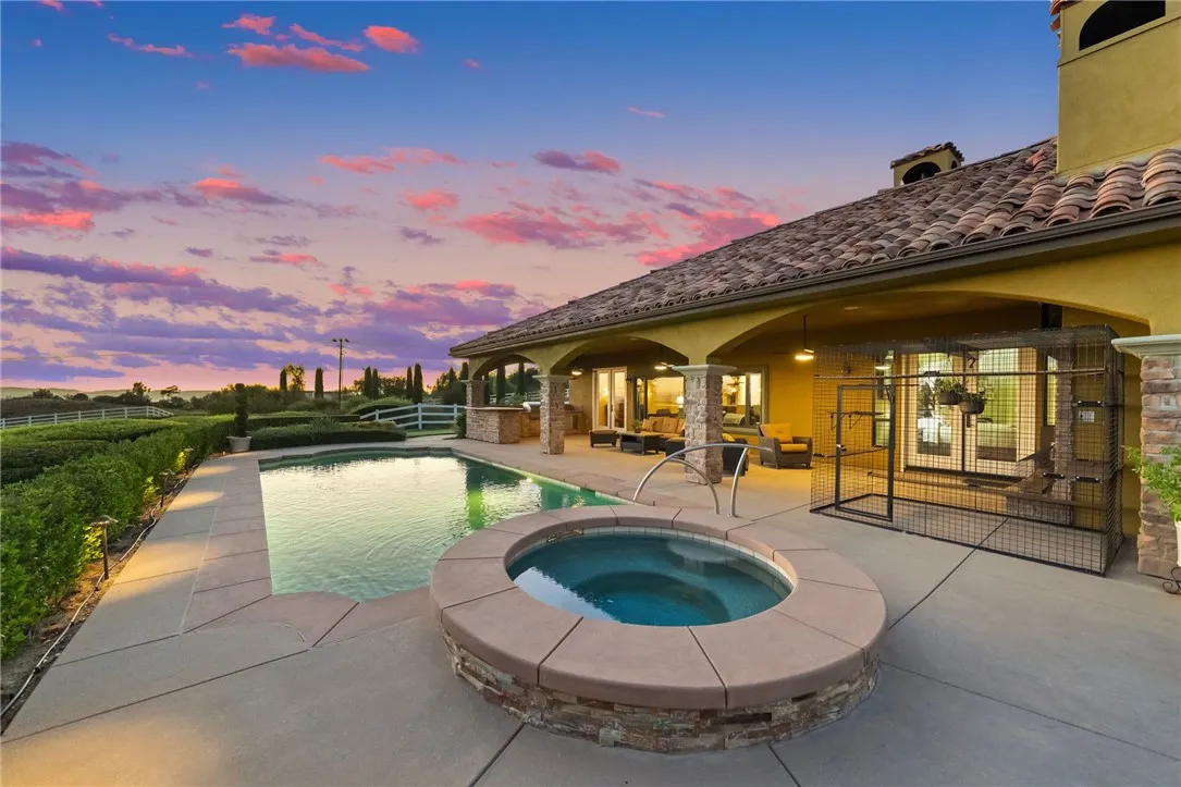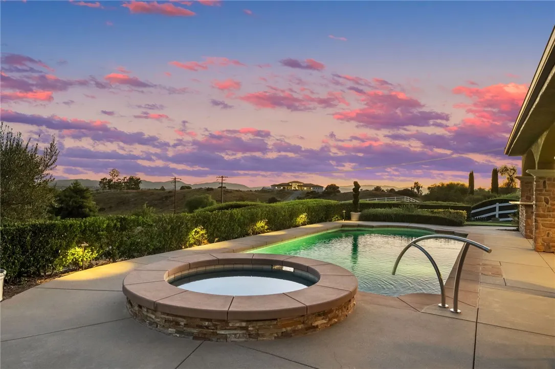 Exceptional Single-Story Wine Country Estate! Discover a truly one-of-a-kind single-story home set behind a private double-gated entrance in the heart of Temeculas renowned wine country. Immaculate inside and out, this residence captures sweeping sunrise and sunset views across 2.74 acres of fully usable land, offering rare privacy and room to expand. Built in 2006, the home features three bedrooms and three-and-a-half bathrooms, plus an oversized three-car garage with soaring ceilings. Thoughtful upgrades include a reverse-osmosis whole-house water system, water softener, new windows, and a Generac whole-home backup generator tied directly to the electrical panel for peace of mind. The great room showcases automatic blackout blinds, a whole-house surround-sound system, and two elegant fireplaces, creating a welcoming environment for everyday living or entertaining. Outdoor amenities rival a private resort. A sparkling saltwater pool and spa overlook breathtaking sunsets, while a covered patio with a built-in barbecue kitchen and abundant seating makes entertaining effortless. A second patio features a new Alumawood cover, ideal for relaxed gatherings. The grounds boast lush, vibrant landscaping with a fully renovated sprinkler system, extensive lawn areas, and ample level space for future additions such as a vineyard, guest house, or equestrian facilities. Practical details enhance convenience and security: a newly poured asphalt driveway, a Spanish-style tile roof, and a double-gate design with automatic entry. Two recently installed air-conditioning units and a newer fur