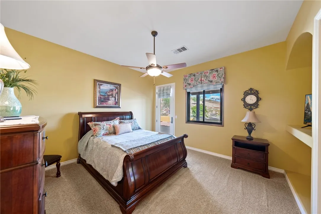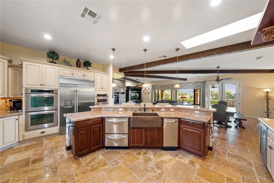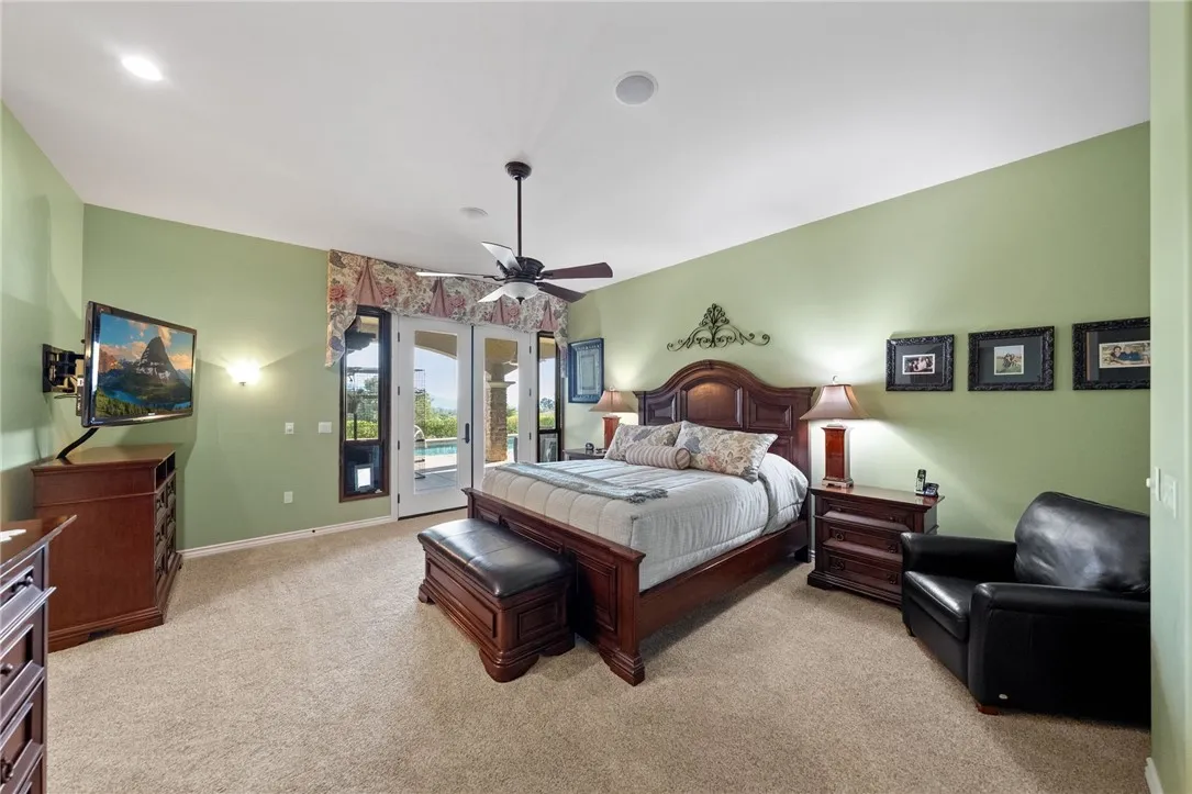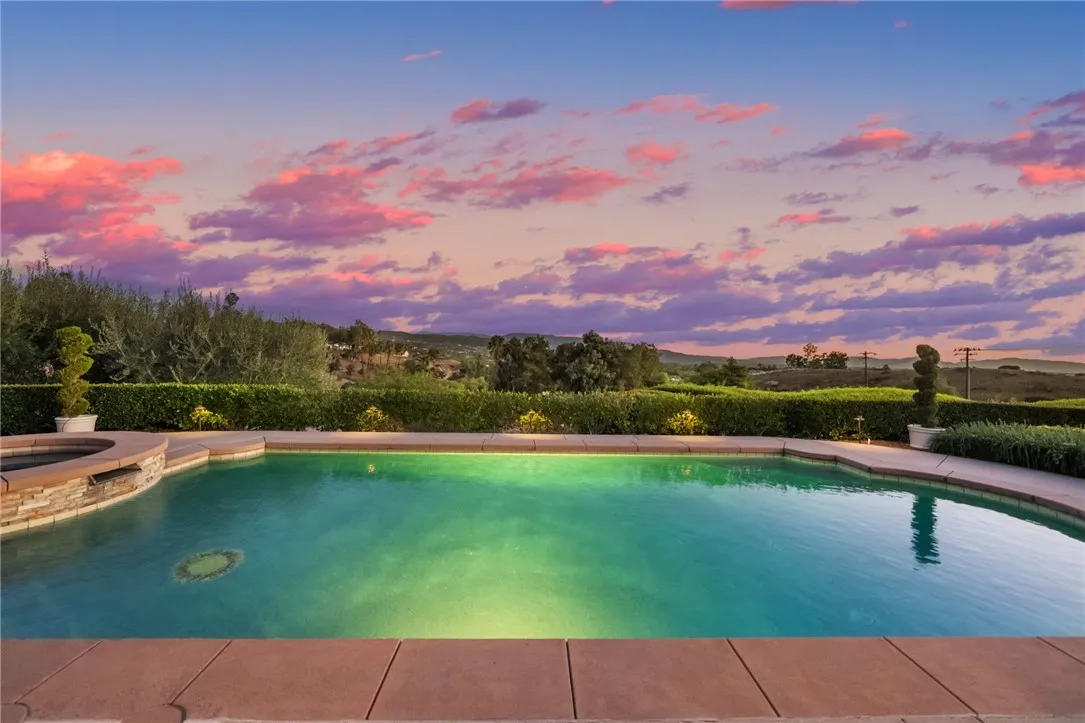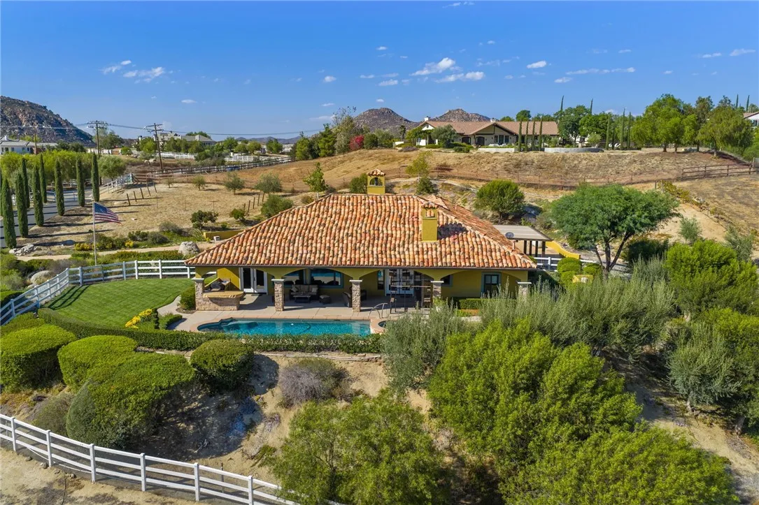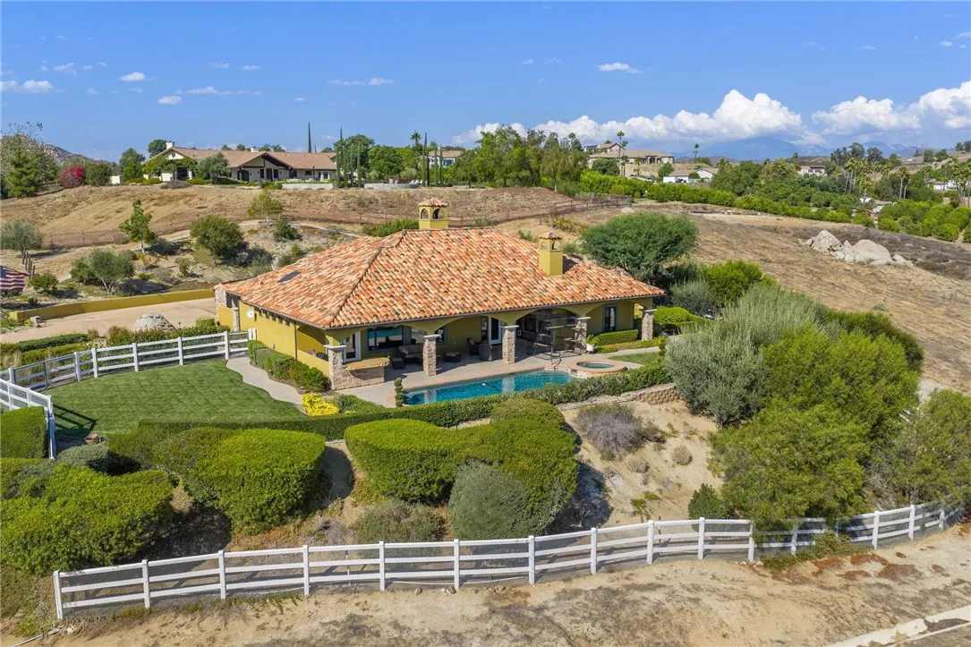 Exceptional Single-Story Wine Country Estate! Discover a truly one-of-a-kind single-story home set behind a private double-gated entrance in the heart of Temeculas renowned wine country. Immaculate inside and out, this residence captures sweeping sunrise and sunset views across 2.74 acres of fully usable land, offering rare privacy and room to expand. Built in 2006, the home features three bedrooms and three-and-a-half bathrooms, plus an oversized three-car garage with soaring ceilings. Thoughtful upgrades include a reverse-osmosis whole-house water system, water softener, new windows, and a Generac whole-home backup generator tied directly to the electrical panel for peace of mind. The great room showcases automatic blackout blinds, a whole-house surround-sound system, and two elegant fireplaces, creating a welcoming environment for everyday living or entertaining. Outdoor amenities rival a private resort. A sparkling saltwater pool and spa overlook breathtaking sunsets, while a covered patio with a built-in barbecue kitchen and abundant seating makes entertaining effortless. A second patio features a new Alumawood cover, ideal for relaxed gatherings. The grounds boast lush, vibrant landscaping with a fully renovated sprinkler system, extensive lawn areas, and ample level space for future additions such as a vineyard, guest house, or equestrian facilities. Practical details enhance convenience and security: a newly poured asphalt driveway, a Spanish-style tile roof, and a double-gate design with automatic entry. Two recently installed air-conditioning units and a newer fur