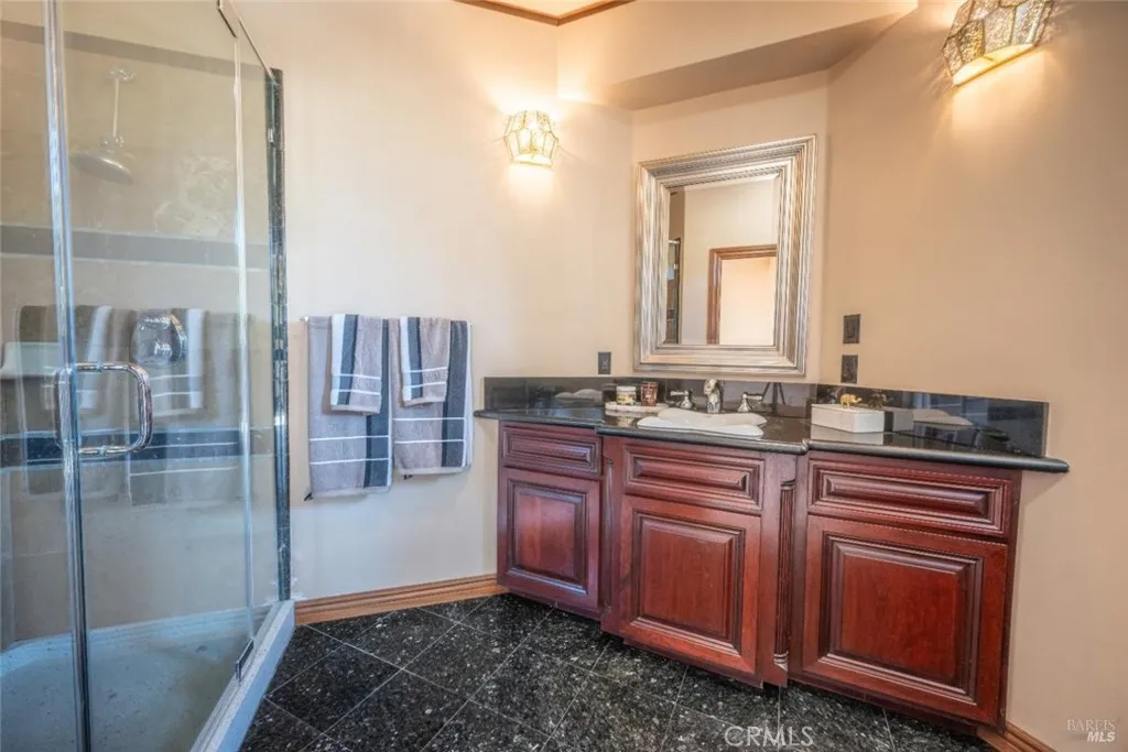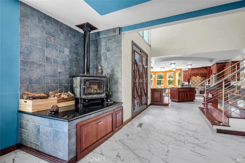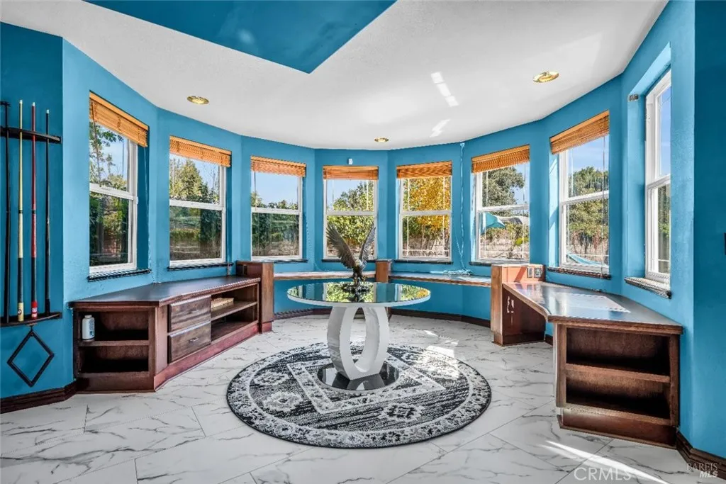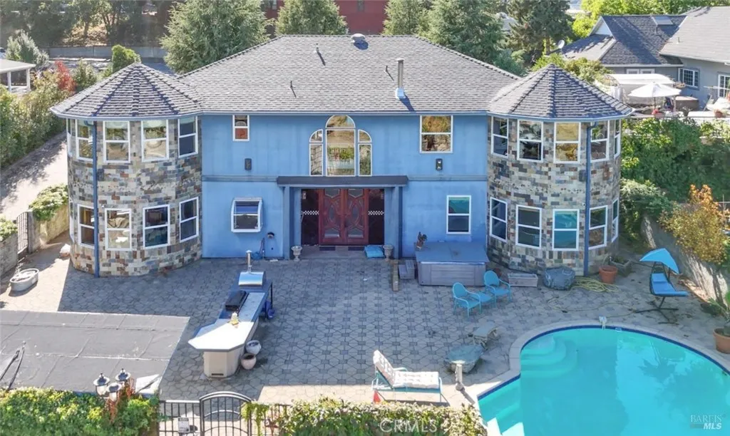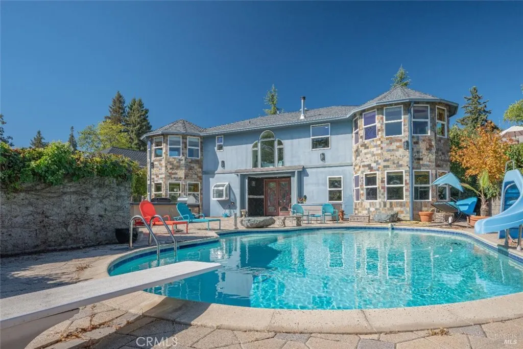 This distinctive luxury estate blends modern design with European chateau elegance, featuring twin turreted wings that give the home a castle-inspired presence. Spanning 3 parcels and over 2 acres, the property offers resort-style living with a salt water pool, hot tub, outdoor BBQ, and pizza oven. The large 3-car and RV/toy detached garages provide ample storage. Expansive paver driveways and open half-acre garden space add both beauty and function. Inside, a gourmet chef's kitchen with high-end appliances, a grand staircase, and formal office with pool views. The Home theater and pool table set the stage for fine living. This master suite boasts great natural lighting, enormous walk-in closet, and an oversized jetted tub. Stucco and stone exteriors, new LVP flooring throughout, 2 fireplaces, and an on-demand hot water enhance the comfort and style. Riparian water rights, a full backup generator, and Honeywell security system ensure peace of mind. With commercial zoning allowing mixed-use possibilities, this one-of-a-kind property offers the perfect balance of elegance, function, and opportunity. Live and work from home in style!