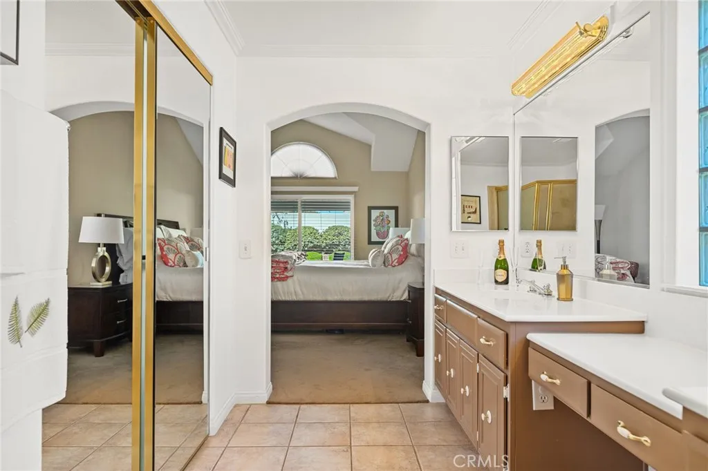 Welcome to your own private paradise located in the spectacular Sun Lakes gated 55+ active adult community! No Mello-Roos! This exquisite home boasts a serene, beautifully landscaped backyard featuring custom-designed, luscious, manicured landscapes highlighted by a large rock boulder and tiered waterfall fountain. Accented by beautiful greenery and flowering perennials, the tranquil and relaxing sound of water spilling from the waterfall enhances your outdoor living experience. Enjoy an English sculpted garden, covered patio, and built-in BBQperfect for entertaining or relaxing. The thoughtfully elevated gardens provide privacy, ideal for adding your personal spa retreat right outside the primary suite. Enter through a lovely, private, level entrance to find elegant designer tile and plush carpeting complemented by chic, modern touches. The expansive formal living and dining area greets you with soaring two-story ceilings, ample natural light, and a sophisticated dual-sided fireplace. Updated designer gold and crystal chandeliers enhance the elegant ambiance of the dining room. The recently refreshed kitchen features freshly painted cabinetry, stylish backsplash, and coordinating countertops, seamlessly connecting to the casual dining nook and second living area. High ceilings, plantation shutters, and large windows throughout offer abundant light and additional views of the stunning fireplace. Retreat to the main-level primary suite with vaulted ceilings, direct backyard access, a generous walk-in closet, dual sinks, luxurious soaking tub, and expansive walk-in shower. Up