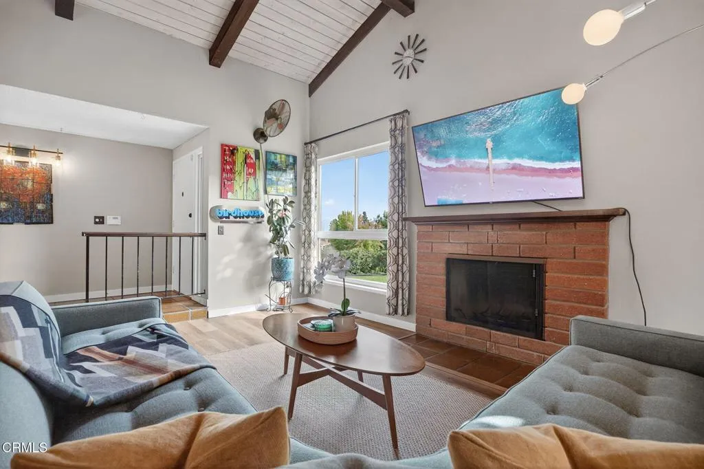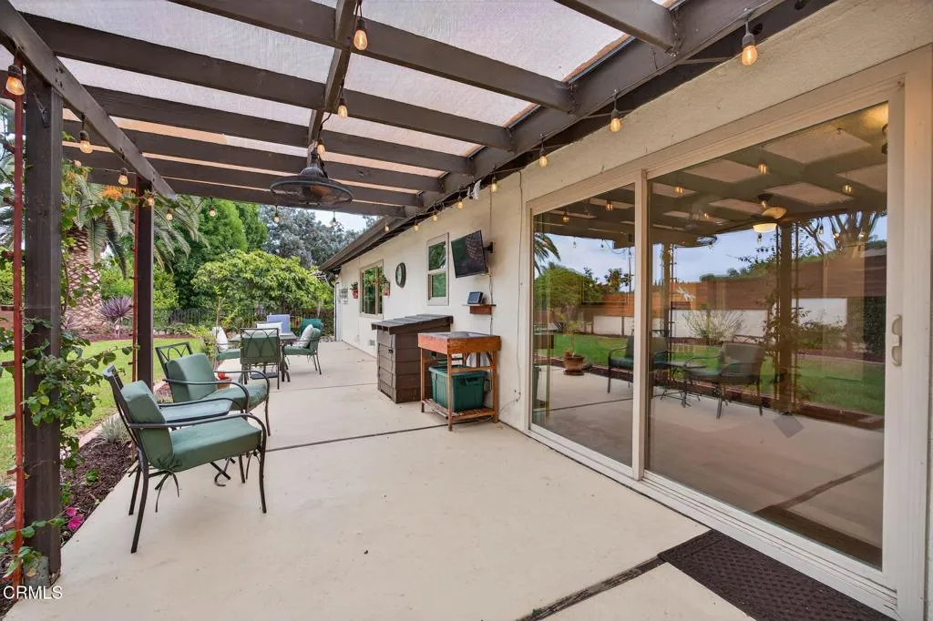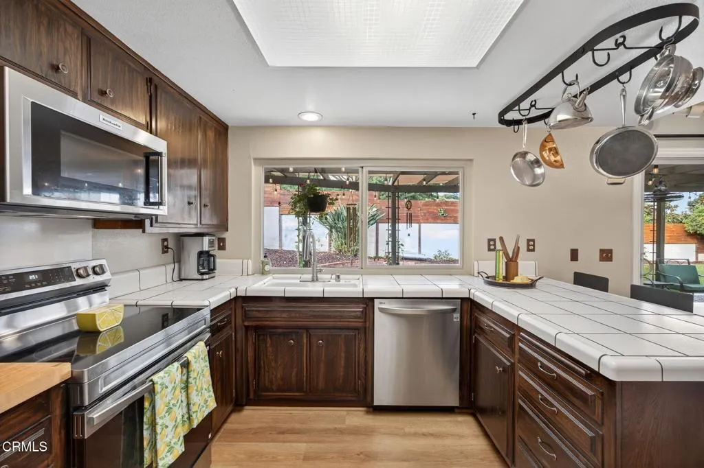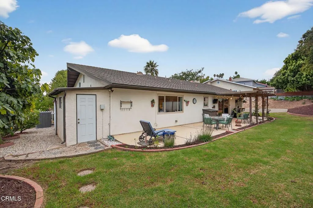 Rarely available in Camarillo's coveted La Entrada neighborhood, this 2,008 sq ft single-level 4BD/2BA hillside home sits on a 10,001 sq ft lot with privacy, treetop views, and a desirable south-facing orientation. Relax on the newly rebuilt front deck with mountain views and Camarillo breezes, just steps from Nancy Bush Park and a short stroll to Las Posas Plaza dining, shopping, and Starbucks. The thoughtfully updated ranch-style floor plan features a step-down living room with wood-beamed cathedral ceilings, a brick gas/wood-burning fireplace, and large windows that fill the home with natural light. Upgrades include a paid-for solar system, 2020 HVAC replacement, a newer higher-capacity electric water heater ideal for a large family, water softening system, stainless steel appliances, upgraded vinyl windows and sliding glass door, and all-new luxury vinyl plank flooring, carpeting, and baseboards. The exterior has been refreshed with paint, updated trim, block walls, railings, and landscaping with mulch, rock, and a fountain water feature. A two-car garage plus an oversized driveway provides off-street parking for up to six vehicles, while a versatile bonus space is perfect as a man cave, she shed, or artist studio. With proximity to Las Posas Country Club, this hidden-gem neighborhood is known for homes that rarely come on the market--and sell quickly.