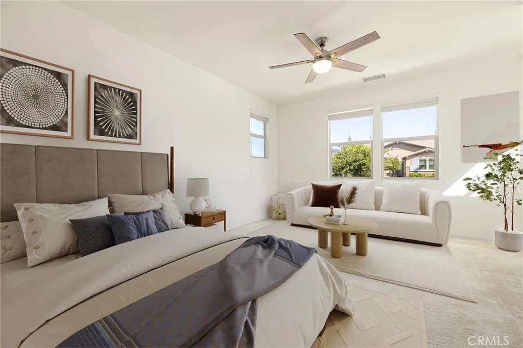 Welcome to Ponderosa Lane where dreams come true in this stunning 3100 sqft property sitting on almost a 14,000 sqft lot of land. The ranch style property features 4 bedrooms, 4 baths and a next-gen suite perfect for guests or income purposes. Located in the highly desirable gated community of Province in Audie Murphy Ranch, in Menifee, with mountain views, drought tolerant landscaping and nestled on the hillside with no rear neighbors. As you enter the home you are greeted by tall ceilings, recessed lighting, LVP floors, and a highly desirable floor plan. On the West wing of the ranch style property are two large secondary bedrooms both with walk-in closets, plush carpet, ceiling fans and tons of natural light flooding the space. The rooms share a secondary bath appointed with a dual vanity, quartz counters, and tub shower combo. Across the hall is a powder bath perfect for guests. Off the East wing of the home is the next-gen suite or Junior suite boasting a large room that can be split into a bedroom and living area or can be used as a large office or gym and offers a nook perfect for an exterior door to be built for private access. The bedroom has its own walk-in closet and attached bath featuring a single vanity and real tile walk-in shower. The amazing Great Room is appointed with large windows allowing tons of natural light to fill the entirety of the home, two ceiling fans and a massive space to decorate your dream living area. Off the Great Room is a large dining area that peers into the gourmet kitchen. The kitchen is appointed with granite counters, subway tile b
