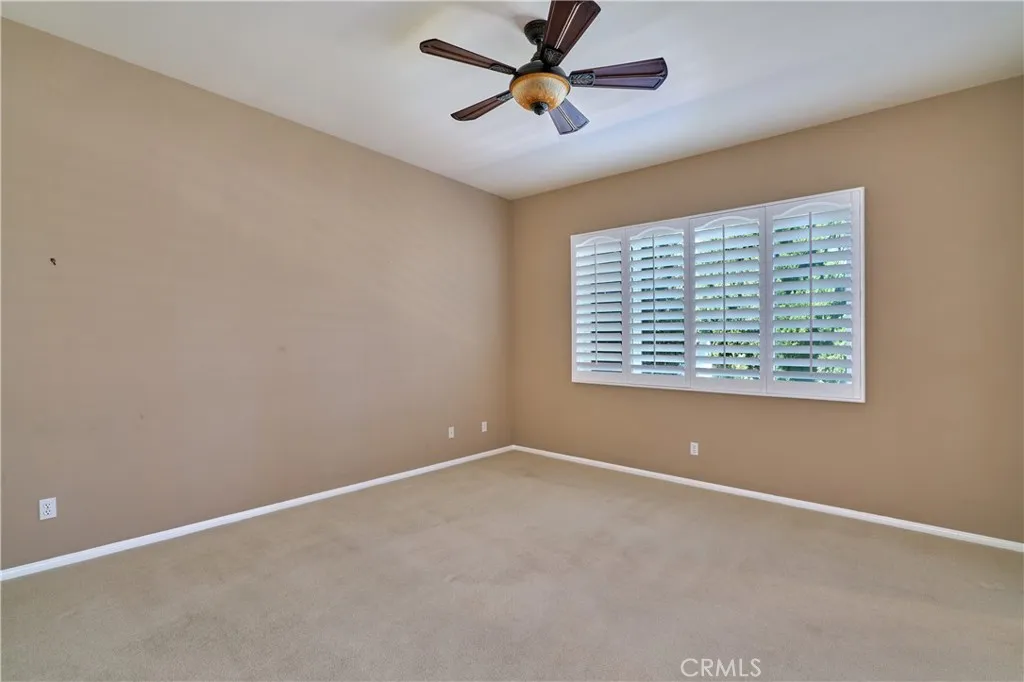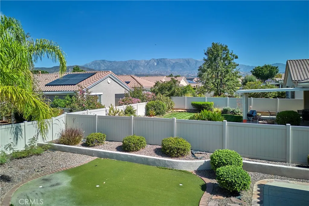 Pristine Trillion model in the gated 55+ community of Solera. The outdoor spaces are a true highlightexquisitely landscaped front and back yards with palm trees, a putting green, and extended patios. The kitchen showcases granite countertops and ample cabinetry, flowing into a spacious living room with a cozy gas fireplace. A den/office includes a built-in desk and extra recessed lighting. Plantation shutters add a clean, finished touch. The primary suite offers a walk-in shower, soaking tub, and a generous walk-in closet. Plenty of extra storage cabinets in the garage. As a Solera resident, youll enjoy resort-style amenities including a clubhouse with library, banquet facilities, billiards, fitness center, pool, spa, bocce ball, and tennis courts. There are also many clubs to join and organized trips. Spectrum internet and basic cable are included. Solera offers easy access to Redlands, Cabazon Outlets, the best golf courses and short drive to Palm Springs. There's no place like your new home!