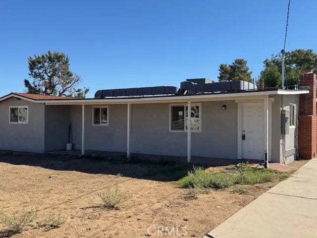 Cute starter home on 2.63 acres in West Palmdale in walking distance to the AV Mall. 3 bedrooms and 2 baths with a bonus room/dining room area. Brick fireplace in the living room, wood beam ceilings, Upgraded new 220 electrical box. The lot has chain link fencing on the sides with block fencing in back. There is also a small separate fenced area around the back of the house for dogs with a patio area and a 2 car garage on the side.