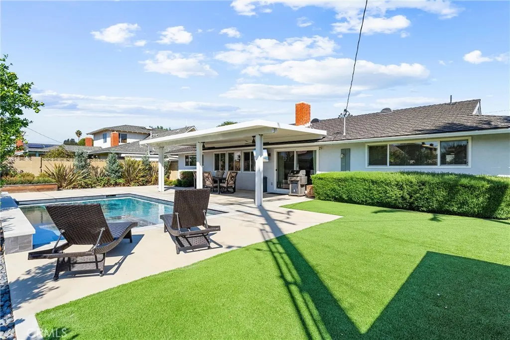 Welcome to 1707 Stanley Avenue! This beautifully remodeled single-story home is located in the heart of Placentia. This stunning residence sits on a 7,140 square foot lot and offers 1,612 square foot of thoughtfully designed living space featuring 4 bedrooms and 2 bathrooms. From the moment you arrive, youll be captivated by the homes curb appeal, highlighted by a welcoming front porch with a sitting area, manicured landscaping, and a timeless exterior design. Step inside to discover an open-concept floor plan filled with natural light, crown molding, and dual-paned windows throughout. The spacious living room is anchored by a cozy gas fireplace with wall-to-wall windows providing stunning views of the entertainer's dream backyard. The kitchen is a showstopper with white cabinetry, quartz countertops, stainless steel appliances, and an abundance of counter space for cooking and gathering. Dining room has built-in cabinetry with upper glass doors and quartz counter tops, and sliding glass door which opens to the covered back patio. The primary suite is a private retreat with an attached en suite bathroom. En suite has a large walk-in shower with white subway tile, large built-in vanity with white cabinetry and quartz counter tops. While three additional bedrooms, which sit on the opposite side of the home, provide versatility for family, guests, or a home office. The hallway bathroom has dual sinks and a tub/shower combo. The true highlight of this home is the backyard, designed for year-round entertaining. Enjoy a sparkling pool and spa, artificial turf for low-maintenance