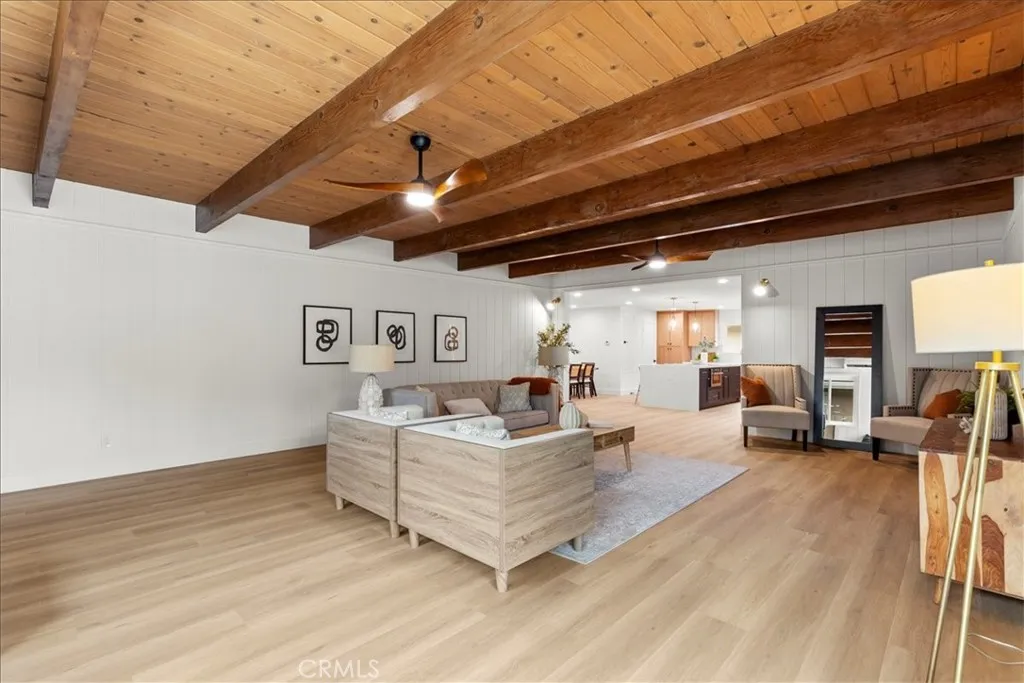 Welcome to this beautifully remodeled ranch-style home tucked in a quiet cul-de-sac in Tustin, thoughtfully reimagined by Battres Construction Design Build, celebrated for their work on HGTV. From the moment you arrive, the fresh landscaping with new sod, plants, and upgraded irrigation creates an inviting curb appeal. Inside, the open-concept design offers 4 bedrooms, 2 bathrooms, and 2,255 sq. ft. of living space on a 7,296 sq. ft. lot. Enter through double wood doors to a spacious entry, to the right, a bonus 4th bedroom with wall-to-wall closet and cozy smooth finish fireplace. To the left, the dining area flows into the gourmet kitchen with sleek white oak cabinetry, quartz countertops, modern tile backsplash, and brand-new stainless-steel appliances, including refrigerator, dishwasher, hood range, and microwave. Throughout the home, new luxury vinyl plank flooring adds warmth and durability. Off the kitchen, a huge great room with soaring beamed ceilings, remote ceiling fans, smooth-finish fireplace, and a slider door leads directly to the backyard pool retreat. The primary suite features a spa-inspired bathroom with frameless glass shower, dual vanities, designer tile finishes, and a slider to the pool area. The guest bath is equally upgraded with quartz counters, modern fixtures, and elegant tile work. All bedrooms include mirrored closet doors. Outdoors, enjoy resort-style living with a replastered heated pool and spa with new equipment. Included are a new 3-piece BBQ and multiple entertaining areas. Additional highlights include solar panels, central A/C, newer du