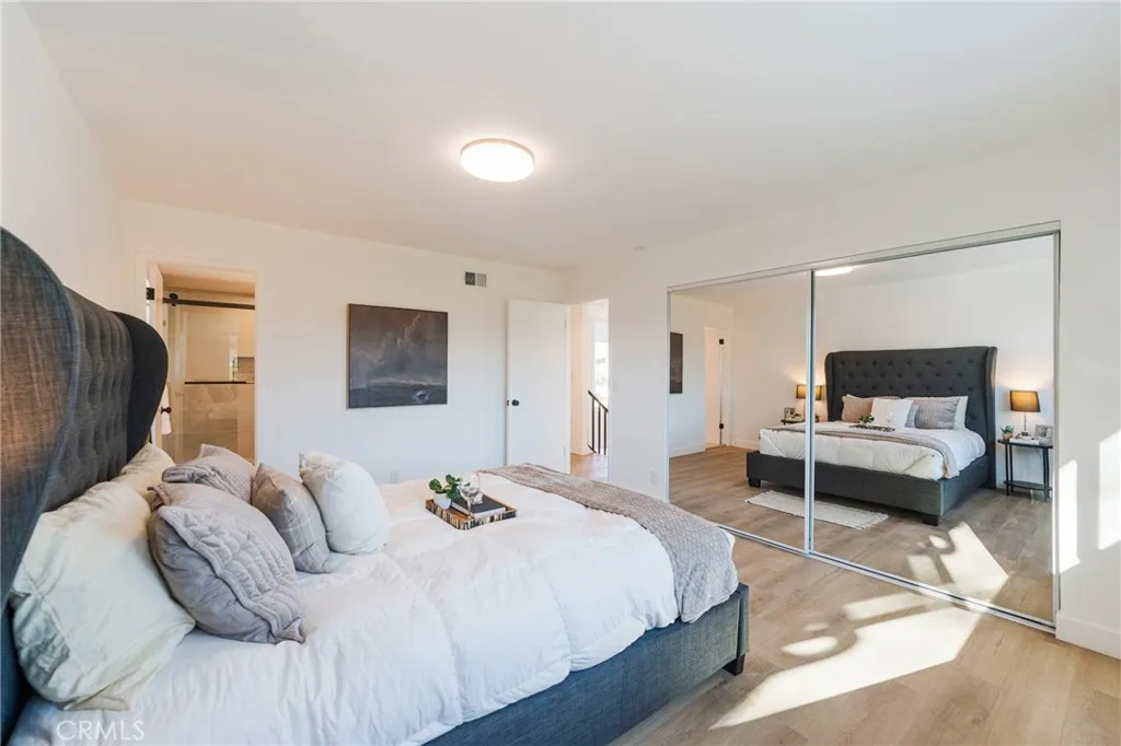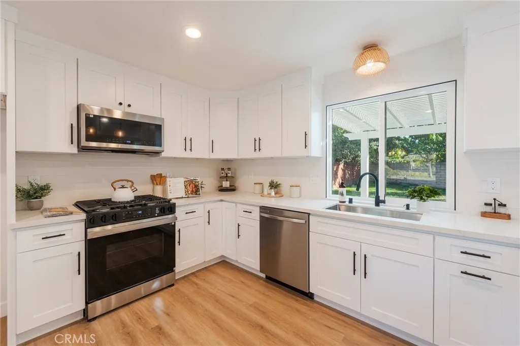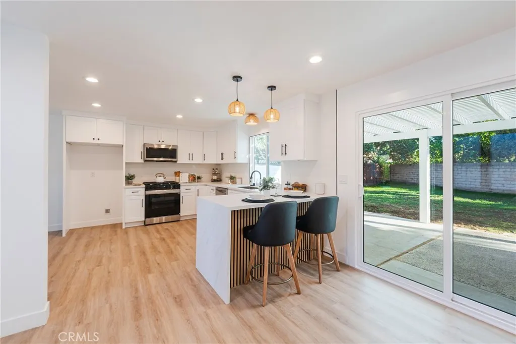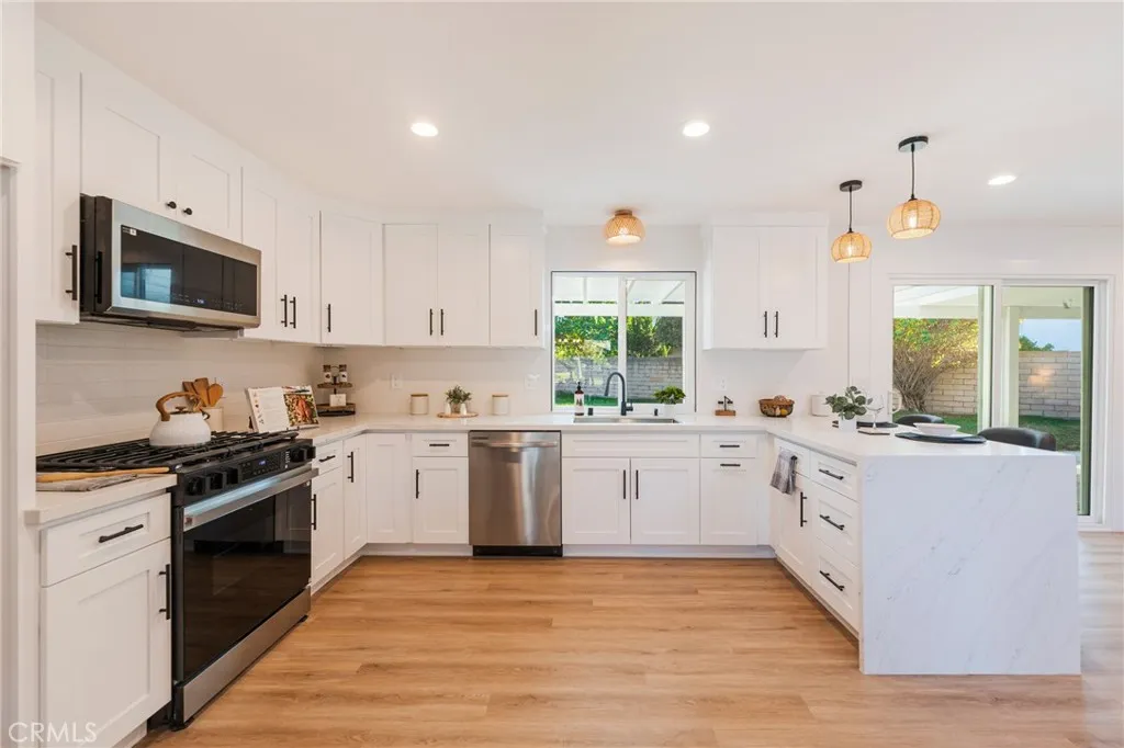 Welcome to this beautifully renovated home with a spacious 3-car garage, where modern design meets luxurious comfort. Located in a highly desirable neighborhood in Cerritos, CA. This stunning property boasts a spacious floor plan with four (4) generously sized bedrooms and various premium features that elevate your living experience. All 2.5 bathrooms have been tastefully renovated with modern mid-century touches. Step inside through a beautiful custom double wood door and be greeted by the inviting ambiance, enhanced by recessed lighting, new whisper white interior/exterior paint, all new windows, and premium laminate wood flooring throughout the home. The heart of this home is the chef-inspired kitchen, complete with gleaming quartz countertops, all-new stainless steel appliances, shaker-style slow-close cabinetry, and a custom peninsula with a waterfall finish perfect for both cooking and entertaining. There is a warm and inviting family room and a separate formal living room, which features a beautiful fireplace, providing a perfect setting for relaxing. This home offers a 3-car garage, providing ample storage or a space for a gym/hobby. Enjoy the private and cozy backyard to host all of your special gatherings. With its thoughtful design, premium finishes, and a fantastic layout, this home is the perfect blend of modern living and comfort. Great location with award-winning ABC school district, don't miss this chance to make this property your DREAM HOME!