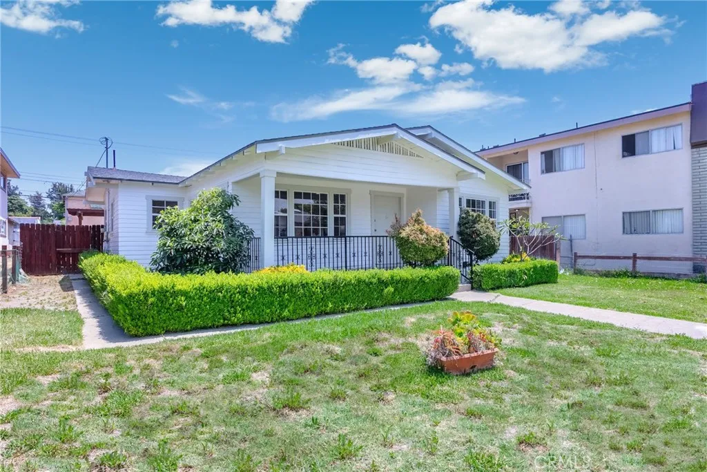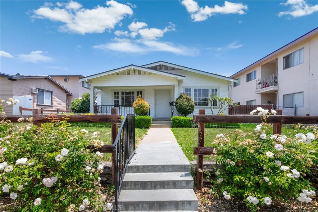 This Craftsman-style home sits in the heart of Uptown Whittierjust minutes from local colleges, shops, cafes, parks, and farmers market. The white rose-lined front yard, classic picket fence, and elevated lawn create a timeless first impression, while the spacious covered porch offers a cozy place to relax and enjoy the neighborhoods charm. The living room features laminate flooring, recessed lighting, and large windows that bring in abundant natural light. It flows into a tiled dining area with backyard views and plenty of space for gatherings. The kitchen offers tiled countertops, ample cabinetry, and convenient access to the laundry area. All three bedrooms include wood flooring, ceiling fans, and built-in closets. The full bathroom features a tiled tub/shower combo. Recent updates include fresh interior paint, large window casings, an upgraded A/C system, newer water heater, and sprinkler systems. The backyard is ideal for outdoor living, with a pergola-covered patio, mature trees, and open space for gardening, recreation, or future landscaping. A detached rear structure offers additional storage or creative use. Rear alley access and an extra parking spot beside the garage provide added convenience. Zoned R3 (buyer to verify), the lot offers excellent potential for an ADU, additional units, or long-term investment. Combining original charm, thoughtful upgrades, and future possibilities, this home is a rare opportunity in one of Whittiers most desirable neighborhoods.