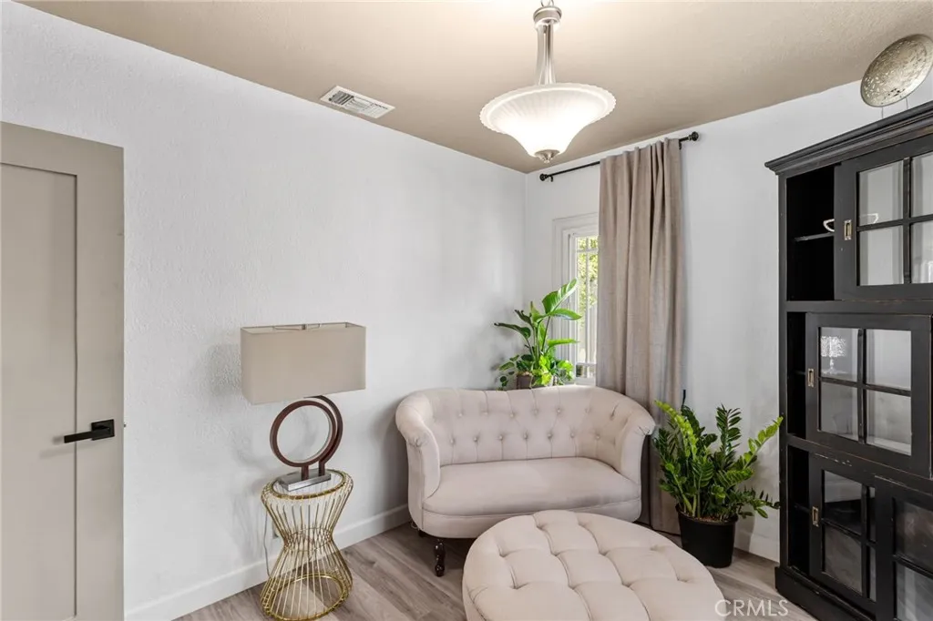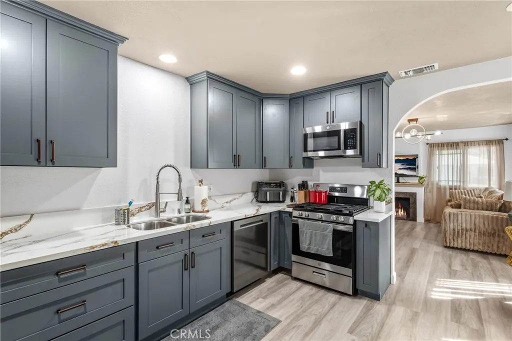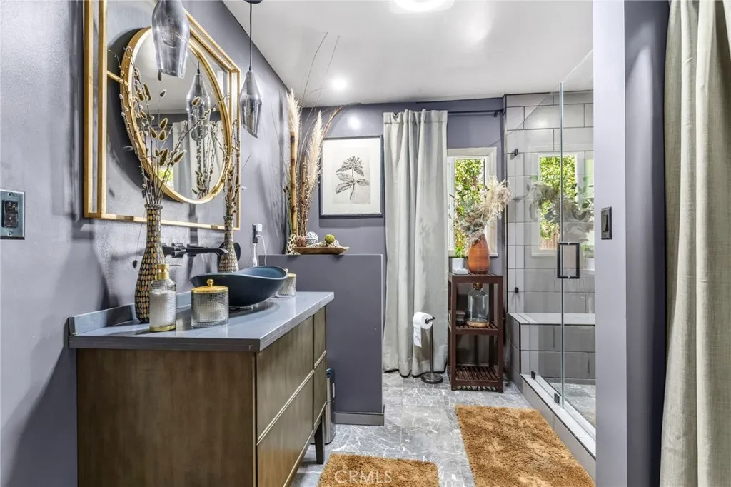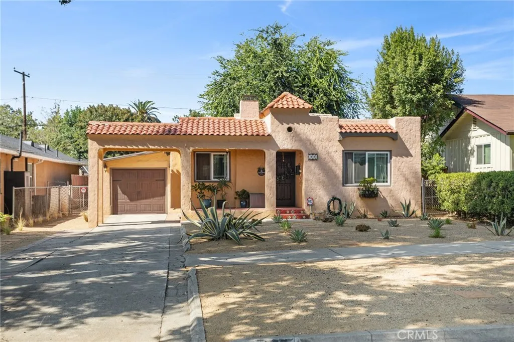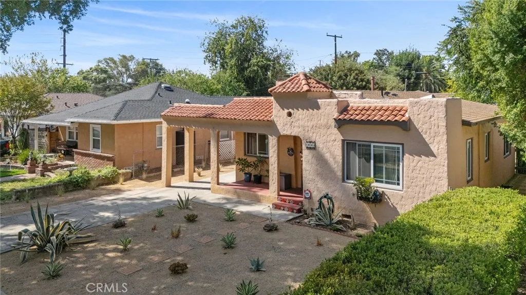 Spanish Style Bungalow retreat nested in tree line street of Upland. This beautiful & meticulous designed oasis has undergone a new remodel transformation just awaiting for a new buyer. Cozy living room with fireplace, custom interior finishing & decor, new floor plan, interior paint, flooring throughout & lighting. Beautiful open remodeled kitchen with Quarts Counter Tops, new custom cabinets with self closing doors and drawers and new appliances. Home is energy efficient with Dual Pane Vinyl Windows, Central Air & Forced Heating systems and Tankless Hot Water Heater. Spacious primary bedroom that was expanded with the new floor plan layout, laundry was moved from garage to inside bathroom area with stackable washer and dryer. Remodeled bathroom with large walk-in shower, custom finishing and decor. Title shows the home as a 3 bedroom. Previous owner opened the wall between the primary bedroom & middle bedroom to make a larger primary bedroom. Current owner expanded primary bedroom which includes an en suite. Its still configured as 2 bedroom. The 2nd bedroom is currently being used as sitting area. Large lot with new beautiful drought-tolerant landscaping in front and side yards. Spacious rear yard with alley entrance, large storage shed and room to possibly add spacious ADU. Centrally located near 10 Fwy, few blocks from Downtown Upland & Public Transportation (Metrolink Station), Farmers Market, Shopping and Dining.
